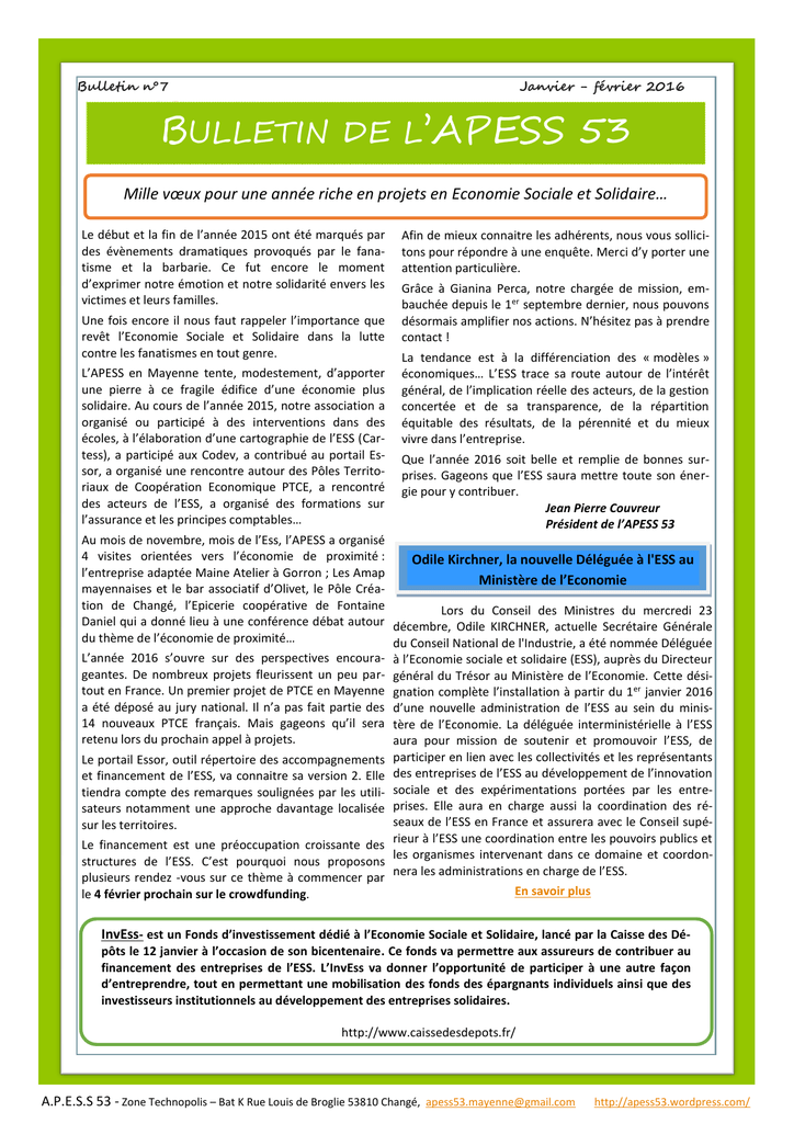 Bulletin n°7 Janvier - février 2016 BULLETIN DE L’APESS 53 Mille vœux pour une année riche en projets en Economie Sociale et Solidaire… Le début et la fin de l’année 2015 ont été marqués par des évènements dramatiques provoqués par le fanatisme et la barbarie. Ce fut encore le moment d’exprimer notre émotion et notre solidarité envers les victimes et leurs familles. Une fois encore il nous faut rappeler l’importance que revêt l’Economie Sociale et Solidaire dans la lutte contre les fanatismes en tout genre. L’APESS en Mayenne tente, modestement, d’apporter une pierre à ce fragile édifice d’une économie plus solidaire. Au cours de l’année 2015, notre association a organisé ou participé à des interventions dans des écoles, à l’élaboration d’une cartographie de l’ESS (Cartess), a participé aux Codev, a contribué au portail Essor, a organisé une rencontre autour des Pôles Territoriaux de Coopération Economique PTCE, a rencontré des acteurs de l’ESS, a organisé des formations sur l’assurance et les principes comptables… Afin de mieux connaitre les adhérents, nous vous sollicitons pour répondre à une enquête. Merci d’y porter une attention particulière. Grâce à Gianina Perca, notre chargée de mission, embauchée depuis le 1er septembre dernier, nous pouvons désormais amplifier nos actions. N’hésitez pas à prendre contact ! La tendance est à la différenciation des « modèles » économiques… L’ESS trace sa route autour de l’intérêt général, de l’implication réelle des acteurs, de la gestion concertée et de sa transparence, de la répartition équitable des résultats, de la pérennité et du mieux vivre dans l’entreprise. Que l’année 2016 soit belle et remplie de bonnes surprises. Gageons que l’ESS saura mettre toute son énergie pour y contribuer. Jean Pierre Couvreur Président de l’APESS 53 Au mois de novembre, mois de l’Ess, l’APESS a organisé 4 visites orientées vers l’économie de proximité : Odile Kirchner, la nouvelle Déléguée à l'ESS au l’entreprise adaptée Maine Atelier à Gorron ; Les Amap Ministère de l’Economie mayennaises et le bar associatif d’Olivet, le Pôle Création de Changé, l’Epicerie coopérative de Fontaine Lors du Conseil des Ministres du mercredi 23 Daniel qui a donné lieu à une conférence débat autour décembre, Odile KIRCHNER, actuelle Secrétaire Générale du thème de l’économie de proximité… du Conseil National de l'Industrie, a été nommée Déléguée L’année 2016 s’ouvre sur des perspectives encoura- à l’Economie sociale et solidaire (ESS), auprès du Directeur geantes. De nombreux projets fleurissent un peu par- général du Trésor au Ministère de l’Economie. Cette désitout en France. Un premier projet de PTCE en Mayenne gnation complète l’installation à partir du 1er janvier 2016 a été déposé au jury national. Il n’a pas fait partie des d’une nouvelle administration de l’ESS au sein du minis14 nouveaux PTCE français. Mais gageons qu’il sera tère de l’Economie. La déléguée interministérielle à l’ESS retenu lors du prochain appel à projets. aura pour mission de soutenir et promouvoir l’ESS, de Le portail Essor, outil répertoire des accompagnements participer en lien avec les collectivités et les représentants et financement de l’ESS, va connaitre sa version 2. Elle des entreprises de l’ESS au développement de l’innovation tiendra compte des remarques soulignées par les utili- sociale et des expérimentations portées par les entresateurs notamment une approche davantage localisée prises. Elle aura en charge aussi la coordination des réseaux de l’ESS en France et assurera avec le Conseil supésur les territoires. rieur à l’ESS une coordination entre les pouvoirs publics et Le financement est une préoccupation croissante des les organismes intervenant dans ce domaine et coordonstructures de l’ESS. C’est pourquoi nous proposons nera les administrations en charge de l’ESS. plusieurs rendez -vous sur ce thème à commencer par En savoir plus le 4 février prochain sur le crowdfunding. InvEss- est un Fonds d’investissement dédié à l’Economie Sociale et Solidaire, lancé par la Caisse des Dépôts le 12 janvier à l’occasion de son bicentenaire. Ce fonds va permettre aux assureurs de contribuer au financement des entreprises de l’ESS. L’InvEss va donner l’opportunité de participer à une autre façon d’entreprendre, tout en permettant une mobilisation des fonds des épargnants individuels ainsi que des investisseurs institutionnels au développement des entreprises solidaires. http://www.caissedesdepots.fr/ ,n, A.P.E.S.S 53 - Zone Technopolis – Bat K Rue Louis de Broglie 53810 Changé, [email protected] http://apess53.wordpress.com/ Les 14 nouveaux PTCE Agenda départemental : - 4 février, Le crowdfunding ou « financement par la foule », l’APESS 53, Quartier Ferrié, Laval - L’Autre Radio ouvre ses portes dans le cadre de la Semaine des Radios associatives : - 13 février, Château Gontier (10h-13h), Laval (14h-18h) - du 22 février au 15 avril, Je crée mon entreprise, BGE Anjou Maine, Mayenne -21 mars, Café philo sur l’égalité, La FAL 53, Café Etienne, Laval Le 14 janvier 2016, Martine Pinville secrétaire d’Etat en charge de l’Economie Sociale et Solidaire a présenté les 14 nouveaux lauréats du deuxième appel à projets des pôles territoriaux de coopération économique (PTCE). Les PTCE sont destinés à valoriser les filières locales de l’ESS en lien avec les entreprises « classiques » mais aussi les collectivités locales, les centres de recherche et organismes de formation. L’appel à projet, interministériel : les ministères de l’Agriculture, de l’Education nationale, du Logement, des Outre-mer et de la Ville ainsi que la Caisse des Dépôts, apporte un soutien financier entre 26000 et près de 290000 