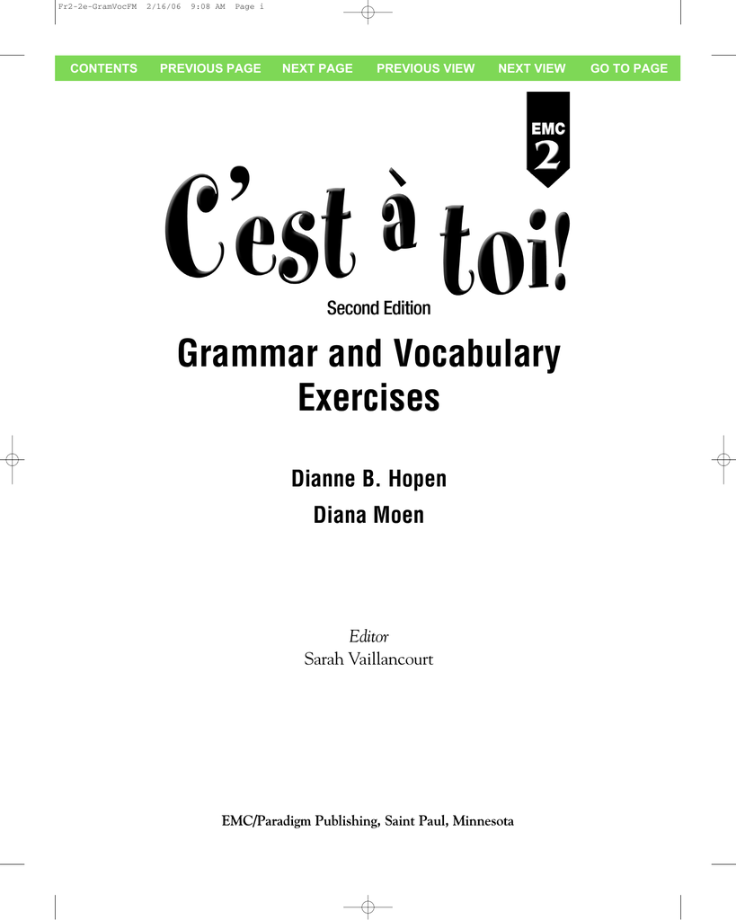 Fr2-2e-GramVocFM CONTENTS 2/16/06 9:08 AM Page i PREVIOUS PAGE NEXT PAGE PREVIOUS VIEW NEXT VIEW Grammar and Vocabulary Exercises Dianne B. Hopen Diana Moen Editor Sarah Vaillancourt EMC/Paradigm Publishing, Saint Paul, Minnesota GO TO PAGE Fr2-2e-GramVocFM CONTENTS 2/16/06 9:08 AM Page ii PREVIOUS PAGE NEXT PAGE PREVIOUS VIEW NEXT VIEW Credits Senior Editor Sarah Vaillancourt Associate Editor Diana Moen Production Specialist Jack Ross ISBN 0-8219-3292-6 © 2007 EMC Corporation All rights reserved. No part of this publication may be adapted, reproduced, stored in a retrieval system or transmitted in any form or by any means, electronic, mechanical, photocopying, recording or otherwise without permission from the publisher. Published by EMC/Paradigm Publishing 875 Montreal Way St. Paul, Minnesota 55102 800-328-1452 www.emcp.com E-mail: [email protected] Printed in the United States of America 1 2 3 4 5 6 7 8 9 10 XXX 12 11 10 09 08 07 06 GO TO PAGE Fr2-2e-GramVocFM 2/16/06 CONTENTS 9:08 AM Page iii PREVIOUS PAGE Unité 1 NEXT PAGE Les fêtes PREVIOUS VIEW NEXT VIEW Unité 7 Les châteaux Leçon A 1 Leçon A 141 Leçon B 10 Leçon B 149 Leçon C 19 Leçon C 154 Unité 8 En voyage Unité 2 Paris Leçon A 25 Leçon A 161 Leçon B 33 Leçon B 168 Leçon C 43 Leçon C 177 Unité 9 Des gens célèbres du monde francophone Unité 3 En France Leçon A 49 Leçon B 59 Leçon A 183 Leçon C 66 Leçon B 195 Leçon C 201 Unité 4 GO TO PAGE La vie quotidienne Leçon A 73 Unité 10 Notre monde Leçon B 80 Leçon A 207 Leçon C 87 Leçon B 220 Leçon C 225 Unité 11 La France contemporaine Unité 5 Sports et Loisirs Leçon A 95 Leçon B 102 Leçon A 233 Leçon C 110 Leçon B 243 Leçon C 249 Answers 255 Unité 6 Les pays du Maghreb Leçon A 117 Leçon B 127 Leçon C 135 C’est à toi! Level Two ©EMC Grammar and Vocabulary Exercises Fr2-2e-GramVocFM CONTENTS 2/16/06 9:08 AM Page iv PREVIOUS PAGE NEXT PAGE PREVIOUS VIEW NEXT VIEW GO TO PAGE Fr2-2e-GramVoc 2/16/06 CONTENTS 9:43 AM Page 1 PREVIOUS PAGE NEXT PAGE PREVIOUS VIEW NEXT VIEW GO TO PAGE LEÇON Unité 1 A Les fêtes Present tense of regular verbs ending in -er, -ir and -re Do you remember the forms of regular -er, -ir and -re verbs? travailler (to work) je tu il/elle/on travaille travailles travaille nous vous ils/elles travaillons travaillez travaillent finir (to finish) je tu il/elle/on finis finis finit nous vous ils/elles finissons finissez finissent Here are some other regular -ir verbs that follow the same pattern as finir. choisir = to choose grossir = to get fat, to gain weight maigrir = to get thin, to lose weight obéir = to obey punir = to punish remplir = to fill (out) réussir = to succeed, to pass (a test) perdre (to lose) je tu il/elle/on perds perds perd nous vous ils/elles perdons perdez perdent Here are some other regular -re verbs that follow the same pattern as perdre. descendre = to go down entendre = to hear rendre = to hand in, to return répondre = to answer C’est à toi! Level Two ©EMC Grammar and Vocabulary Exercises Unité 1 • Leçon A 1 Fr2-2e-GramVoc 2/16/06 CONTENTS 9:43 AM Page 2 PREVIOUS PAGE 1 NEXT PAGE PREVIOUS VIEW NEXT VIEW GO TO PAGE Before you do activities in which you write verb forms, complete the following sentences with the appropriate subject pronouns. 1. Martine et moi, __________________ aimons faire du vélo. 2. Jean-Claude? __________________ invite ses amis à une boum. 3. Tiens! __________________ présentes ta cousine à Claude? 4. Delphine et toi, est-ce que __________________ marchez à la piscine? 5. Moi, __________________ commence mes devoirs après le dîner. 6. Philippe et Dikembe? __________________ étudient l’anglais. 7. __________________ habites aux États-Unis, n’est-ce pas? 8. Brigitte et Marie-Andrée? __________________ trouvent le DVD dans le salon. 2 2 Sylvie is having a New Year’s Eve party. To tell what everyone is doing, complete the following sentences with the appropriate form of the indicated verb. 1. (écouter) J’_________________________ de la musique avec mes amis. 2. (manger) Marc et moi, nous _________________________ de la pizza. 3. (travailler) Les parents de Sylvie _________________________ dans la cuisine. 4. (regarder) Magali et toi, vous _________________________ les photos de vacances. 5. (arriver) Serge _________________________ à 22h15. 6. (présenter) Sylvie _________________________ ses parents à ses amis. 7. (danser) Toi, tu _________________________ avec Marie-France. 8. (décider) Tout le monde _________________________ de partir à 1h00. C’est à toi! Unité 1 • Leçon A Grammar and Vocabulary Exercises Level Two ©EMC Fr2-2e-GramVoc 2/16/06 CONTENTS 9:43 AM Page 3 PREVIOUS PAGE 3 NEXT PAGE PREVIOUS VIEW NEXT VIEW GO TO PAGE To complete each sentence, choose the most logical verb from the list below and write its appropriate form. Use each verb only once. r i s s u r é i r s s o finir r g remplir obéir r i r g i a m r i s i o ch punir 1. Robert et Albert mangent beaucoup de tartes et ils _________________________. 2. Nous _________________________ nos chèques de voyage à la banque. 3. Au centre commercial je _________________________ un ensemble bleu. 4. Parce que tu ne manges pas beaucoup, tu _________________________. 5. Notre chien _________________________ seulement à mon père. 6. La prof de musique _________________________ l’élève méchant. 7. Angèle et toi, vous _________________________ à l’interro de chimie. 8. Claudette et Renée? Elles _________________________ les devoirs de maths à 8h00. C’est à toi! Level Two ©EMC Grammar and Vocabulary Exercises Unité 1 • Leçon A 3 Fr2-2e-GramVoc 2/16/06 CONTENTS 9:43 AM Page 4 PREVIOUS PAGE 4 NEXT PAGE PREVIOUS VIEW NEXT VIEW GO TO PAGE Help Michelle review -re verbs for her upcoming French test by completing her sentences. Choose the most logical verb from the list below and write its appropriate form. You will use one verb twice. r é p ondre e r d r e p attend
