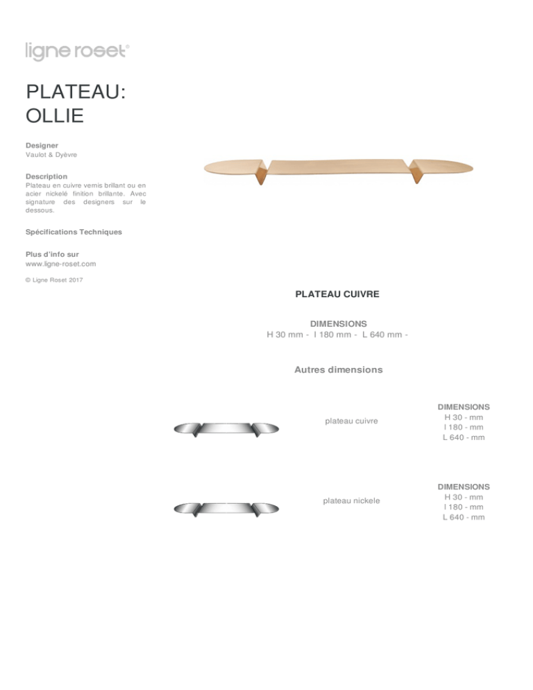PLATEAU: OLLIE Designer Vaulot & Dyèvre Description Plateau en cuivre vernis brillant ou en acier nickelé finition brillante. Avec signature des designers sur le dessous. Spécifications Techniques Plus d’info sur www.ligne-roset.com © Ligne Roset 2017 PLATEAU CUIVRE DIMENSIONS H 30 mm - l 180 mm - L 640 mm - Autres dimensions plateau cuivre DIMENSIONS H 30 - mm l 180 - mm L 640 - mm plateau nickele DIMENSIONS H 30 - mm l 180 - mm L 640 - mm