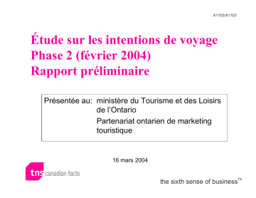 A1102/A1103 Étude sur les intentions de voyage Phase 2 (février 2004) Rapport préliminaire Présentée au: ministère du Tourisme et des Loisirs de l’Ontario Partenariat ontarien de marketing touristique 16 mars 2004 TM the sixth sense of business Contexte L’étude a pour objet d’évaluer les intentions de voyage en Ontario et vers certaines destinations spécifiques de l’Ontario sur les marchés clés américain et canadien. Les renseignements recueillis serviront à : évaluer l’incidence des événements défavorables sur les voyages en Ontario; prévoir la demande pour aider la planification industrielle; fournir des renseignements utiles à la rédaction et au ciblage des messages promotionnels, ainsi qu’à l’ensemble des efforts de marketing. La présentation met l’accent sur les premiers résultats portant sur deux facteurs principaux : l’impact du SRAS et d’autres événements défavorables sur les projets de voyage en Ontario; une estimation des intentions de voyage en Ontario sur les marchés clés. ©2004 TNS - Confidentiel 2 Méthodologie Le sondage a été effectué par téléphone auprès de personnes âgées de dix-huit ans ou plus. Pour cette deuxième phase, l’enquête a été réalisée essentiellement au cours du mois de février 2004. Elle fait suite à la première phase réalisée en novembre 2003. L’étude porte principalement sur les intentions de voyage pour la saison prochaine (de mars à mai) et, en second lieu, sur la saison suivante (de juin à août). Une méthodologie rigoureuse a été utilisée : La méthode RDD (« random digit dialing ») modifiée, méthode qui compose aléatoirement des numéros de téléphone à partir d’un échantillon basé sur les numéros de téléphone listés; des rappels multiples (8 appels pour conclure, une fois la première communication établie avec un logement); un rappel supplémentaire en cas de refus « modéré ». ©2004 TNS - Confidentiel 3 Méthodologie (suite) La méthodologie Trodahl-Carder a été utilisée pour sélectionner une seule personne remplissant les conditions d’âge par logement. L’échantillon a été réparti sans proportionnalité entre les différents marchés, de la manière suivante : Attribu s ©2004 TNS - Confidentiel R alis s Ğ P hase 2 400 200 80 180 80 60 100 378 228 81 180 106 62 130 300 200 372 188 300 308 4 Méthodologie (suite) Attribu s R alis s Ğ P hase 2 300 300 200 181 43 87 306 318 204 183 44 66 230 70 227 72 90 55 85 56 150 31 163 37 ƒ tats-UnisÊ: Rochester MSA ©2004 TNS - Confidentiel 5 Méthodologie (suite) Attribu s R alis s Ğ Phase 2 300 84 64 311 81 85 200 41 295 38 200 100 104 60 204 115 111 51 300 150 77 336 197 72 200 67 213 67 100 119 118 113 ƒ tats-UnisÊ: (suite) Detroit PMSA ©2004 TNS - Confidentiel 6 Méthodologie (suite) Au total, 6 202 entretiens ont été réalisés : 2 033 au Canada; 4 169 aux États-Unis. Au stade du traitement des données, l’échantillon a été pondéré en trois étapes, en utilisant les dernières données de recensement disponibles pour chaque pays : la taille des ménages selon le marché; le coefficient de pondération des ménages (pour tenir compte des probabilités de sélection différentielle dues aux variations du nombre d’individus de l’âge recherché dans chaque ménage); l’âge, par sexe et par marché. ©2004 TNS - Confidentiel 7 Grandes lignes de la présentation Incidence des événements défavorables Incidence du SRAS : variations pour chaque marché Intentions de voyage Perception de l’Ontario en tant que destination de voyage Conclusions et implications ©2004 TNS - Confidentiel 8 Incidence des événements défavorables TM the sixth sense of business Conscience des événements défavorables Pourcentage des personnes de 18 ans et plus dans chaque marché Nov. 03 % Canada : SRAS ƒ tats-UnisÊ: SRAS ©2004 TNS - Confidentiel F vr. 04 % 98 80 98 97 98 86 97 98 93 86 97 92 95 88 97 96 Variation (nov. - févr.) - + ±0 +6 -1 +1 +2 +2 ±0 +4 10 Impact des événements sur les voyages à Toronto en mai 2004 Nombre de personnes de 18 ans et plus (en milliers) qui disent hésiter à visiter Toronto pour les raisons indiquées. Variation par rapport à nov. 03 Février 04 Canadiens: SRAS Alertes/terrorisme É.-U. (2%) 258 Virus du Nil occidental (2%) 254 Maladie de la vache folle Certaines de ces raisons (1%) +96 535 (4%) 152 (6%) 712 Américains: SRAS (7%) Alertes/terrorisme É.-U. (6%) Virus du Nil occidental (2%) Maladie de la vache folle (3%) Certaines de ces raisons (13%) ©2004 TNS - Confidentiel 4.822 +435 4.140 1.666 2.322 9.262 11 Impact des événements sur les voyages à Niagara Falls en mai 2004 Nombre de personnes de 18 ans et plus (en milliers) qui disent hésiter à visiter Niagara Falls pour les raisons indiquées. Variation par rapport à nov. 03 Février 04 Canadiens: SRAS (3%) Alertes/terrorisme É.-U. (2%) 278 Virus du Nil occidental (2%) 258 Maladie de la vache folle Certaines de ces raisons (1%) -47 387 (6%) 165 (6%) 708 Américains: SRAS (4%) Alertes/terrorisme É.-U. (5%) Virus du Nil occidental (2%) Maladie de la vache folle (2%) Certaines de ces raisons (9%) ©2004 TNS - Confidentiel -401 2.603 3.607 1.451 1.602 6.850 12 Impact des événements sur les autres voyages en Ontario en mai 2004 Nombre de personnes de 18 ans et plus (en milliers) qui disent hésiter à visiter d’autres destinations en Ontario pour les raisons indiquées. Février 04 Canadiens: SRAS (4%) Alertes/terrorisme É.-U. (2%) Virus du Nil occidental (3%) Maladie de la vache folle Certaines de ces raisons (2%) 535 256 346 214 (7%) 893 Américains: SRAS (4%) Alertes/terrorisme É.-U. (5%) Virus du Nil occidental (2%) Maladie de la vache folle (3%) Certaines de ces raisons (10%) ©2004 TNS - Confidentiel 2.941 3.447 1.687 1.963 7.121 13 Incidence du SRAS : variations par marché TM the sixth sense of business Incidence du SRAS sur Toronto : variations par secteur géographique canadie