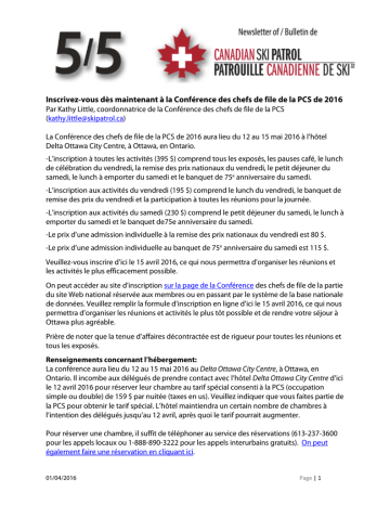 Inscrivez-vous dès maintenant à la Conférence des chefs de file de la PCS de 2016 Par Kathy Little, coordonnatrice de la Conférence des chefs de file de la PCS ([email protected]) La Conférence des chefs de file de la PCS de 2016 aura lieu du 12 au 15 mai 2016 à l’hôtel Delta Ottawa City Centre, à Ottawa, en Ontario. -L’inscription à toutes les activités (395 $) comprend tous les exposés, les pauses café, le lunch de célébration du vendredi, la remise des prix nationaux du vendredi, le petit déjeuner du samedi, le lunch à emporter du samedi et le banquet de 75e anniversaire du samedi. -L’inscription aux activités du vendredi (195 $) comprend le lunch du vendredi, le banquet de remise des prix du vendredi et la participation à toutes les réunions pour la journée. -L’inscription aux activités du samedi (230 $) comprend le petit déjeuner du samedi, le lunch à emporter du samedi et le banquet de75e anniversaire du samedi. -Le prix d’une admission individuelle à la remise des prix nationaux du vendredi est 80 $. -Le prix d’une admission individuelle au banquet de 75e anniversaire du samedi est 115 $. Veuillez-vous inscrire d’ici le 15 avril 2016, ce qui nous permettra d’organiser les réunions et les activités le plus efficacement possible. On peut accéder au site d’inscription sur la page de la Conférence des chefs de file de la partie du site Web national réservée aux membres ou en passant par le système de la base nationale de données. Veuillez remplir la formule d’inscription en ligne d’ici le 15 avril 2016, ce qui nous permettra d’organiser les réunions et activités le plus tôt possible et de rendre votre séjour à Ottawa plus agréable. Prière de noter que la tenue d’affaires décontractée est de rigueur pour toutes les réunions et tous les exposés. Renseignements concernant l’hébergement: La conférence aura lieu du 12 au 15 mai 2016 au Delta Ottawa City Centre, à Ottawa, en Ontario. Il incombe aux délégués de prendre contact avec l’hôtel Delta Ottawa City Centre d’ici le 12 avril 2016 pour réserver leur chambre au tarif spécial consenti à la PCS (occupation simple ou double) de 159 $ par nuitée (taxes en us). Veuillez indiquer que vous faites partie de la PCS pour obtenir le tarif spécial. L’hôtel maintiendra un certain nombre de chambres à l’intention des délégués jusqu’au 12 avril, après quoi le tarif pourrait augmenter. Pour réserver une chambre, il suffit de téléphoner au service des réservations (613-237-3600 pour les appels locaux ou 1-888-890-3222 pour les appels interurbains gratuits). On peut également faire une réservation en cliquant ici. 01/04/2016 Page | 1 Compétition de secourisme : édition spéciale Par Greg McCormick, coordonnateur de la compétition nationale de secourisme ([email protected]) Il y aura une édition spéciale de la compétition de secourisme dans le cadre des célébrations du 75e anniversaire qui se dérouleront lors de la Conférence des chefs de file de la PCS. Une zone a été réservée à cette fin sur la rue Sparks. Cette activité ne doit pas être confondue avec la compétition de secourisme : l’activité se déroulera discrètement et tous ceux qui souhaitent y participer peuvent le faire. Nous avons appris que le président et chef de la direction de la PCS, Colin Saravanamuttoo a promis que l’équipe nationale de gestion y participera. On peut s’inscrire à cette compétition en prenant contact avec Greg McCormick par courrier électronique ([email protected]). Cette activité ne manquera pas de nous réserver d’agréables surprises et plus il y aura de participants, plus il y aura de surprises. Projetez donc d’inscrire une équipe et venez vous amuser. 01/04/2016 Page | 2 Un cours offert à la veille de la Conférence des chefs de file de la PCS de 2016 Par Kathy Little, coordonnatrice de la Conférence annuelle des chefs de file de la PCS ([email protected]) Il n’est pas trop tard pour s’inscrire au cours de gestion du stress par suite d’un incident critique qui se donnera les 11 et 12 mai 2016. Il s’agit d’une activité liée aux cours sur les mesures d’intervention en cas de crise et animée par Brian Bennett, un membre de la PCS. Le cours sera donné chaque jour à l’hôtel Delta Ottawa City Centre, à Ottawa, de 8 h 30 à 17 h 00. Le cours a pour objet d’exposer les éléments de base d’un programme systématique et global d’intervention en cas de crise et de donner aux participants une compréhension de toute une gamme de services pouvant être offerts dans une conjoncture de crise. On y décrira les principes fondamentaux de la gestion du stress en cas d’incident critique. Les participants pourront y acquérir le savoir-faire et les outils nécessaires pour diriger des interventions de groupe axées sur la démobilisation, le désamorçage et le compte rendu du stress causé par l’incident critique. On y traitera aussi des services de suivi et d’orientation qui s’imposent dans certains cas. Vous y apprendrez aussi à offrir un secours psychologique ou émotionnel aux personnes affichant certains traits ou symptômes physiques, émotifs, cognitifs ou comportementaux. Les buts de la GSIC sont les suivants : atténuer le stress, faciliter la normalisation psychologique et stabiliser les réactions, donner une formation sur la gestion du stress et sur les aptitudes en matière de traitement, réduire le sentiment de chaos, permettre le triage psychologique et recommander des soins psychologiques. Brian est un instructeur agréé de la International Critical Incident Stress Foundation (ICISF) et fait partie de l’équipe de GSIC de la PCS. Il a été gestionnaire d’un centre médical lors des Jeux panaméricains. Dans le cadre de la Conférence des chefs de file de la PCS, nous offrons ce cours aux membres actifs de la Patrouille canadienne de ski à un tarif réduit. Le tarif courant est de 300 $