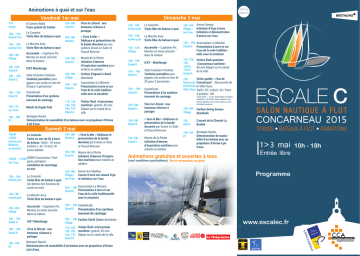 Animations à quai et sur l’eau Vendredi 1er mai 11h Scène B Comme Baila Cours gratuit de Zumba 10h – 16h Arrière Port Le Corentin Visite libre du bateau à quai 10h – 18h Arrière Port Le Marche Avec Visite libre du bateau à quai 10h-18h Village Accrovoile – Capitaine Pic Montez en toute sécurité dans la mâture 10h -18h Stand G 10h – 18h Stand C 10h – 18h Stand K Vivre le Littoral : une immense richesse à partager 10h-18h Stand A « Terre & Mer » Dédicace et présentation de la bande dessinée par ses auteurs Erwan Le Saëc et Pascal Bresson 10h-18h Stand G Musée de la Pêche Initiation d’œuvres d’inspiration maritime pour enfants et adultes 10h-18h Village Fanfare Zingueur’s Band déambule ICKT Matelotage Voile Croisière Finistère Tombola journalière pour gagner une sortie en mer de 2h pour 2 personnes CarènEcolo Présentation d’un système innovant de carénage Dimanche 3 mai 10h-18h Stand H 10h – 18h Stand G 11h, 12h, 14h, 15h, 16h, 17h Stand A Association La Misaine Présentation à terre et sur l’eau de la voile traditionnelle avec le misainier Visites flash «Concarneau maritime» gratuit, 45 min. Départ sur le stand de la ville 15h-17h sur l’eau Match de Kayak Polo 10h - 18h P1 Bretagne Nautic Démonstration de maniabilité d’un bateau avec un propulseur d’étrave à jet d’eau. 10h30 14h30 Arrière port Billeterie au Stand A Le Corentin Sortie en mer de 2h à bord du bateau. Tarifs : 10 euros enfants (- de 14 ans) 18 euros adultes Samedi 2 mai 15h30 – 17h30 SNSM Concarneau-Trévignon, pompiers Sur l’eau simulation de sauvetage en mer 10h – 16h Arrière port Le Corentin Visite libre du bateau à quai (en dehors des horaires de sortie en mer) 10h-18h Arrière port Le Marche Avec Visite libre du bateau à quai 10h -18h Village Accrovoile – Capitaine Pic Montez en toute sécurité dans la mâture 10h – 18h Stand G 10h-18h Stand A « Terre & Mer » Dédicace et présentation de la bande dessinée par Erwan Le Saëc et Pascal Bresson 10h-18h Stand G Musée de la Pêche Initiation d’œuvres d’inspiration maritime pour enfants et adultes 10h-18h Village / sur l’eau Aviron du Cabellou Course à terre sur rameur Ergo et initiation sur l’eau 10h - 18h Arrière port Le Corentin Visite libre du bateau à quai 10h - 18h Arrière port Le Marche Avec Visite libre du bateau à quai 10h - 18h Village Accrovoile – Capitaine Pic Montez en toute sécurité dans la mâture 10h - 18h Stand G ICKT - Matelotage 10h – 18h Stand C Voile Croisière Finistère Tombola journalière pour gagner une sortie en mer de 2h pour 2 personnes 10h – 18h Stand K CarènEcolo Présentation d’un système innovant de carénage 10h-18h Stand H 10h-18h Stand A 10h-18h Stand G Vivre le Littoral : une immense richesse à partager « Terre & Mer » Dédicace et présentation de la bande dessinée par Erwan Le Saëc et Pascal Bresson Musée de la Pêche Initiation d’œuvres d’inspiration maritime pour enfants et adultes 10h-18h Village / sur l’eau 2ème édition Aviron Sympa Initiation d’Ergo à terre. Initiation et démonstration d’aviron sur l’eau 10h – 18h Association La Misaine Stand G Présentation à terre et sur l’eau de la voile traditionnelle avec le misainier 11h, 12h, 14h, 16h15, 17h15 Stand A Visites flash gratuites «Concarneau maritime» 45 min.Départ sur le stand de la ville. Visite guidée : «Vue de 15h Maison du Concarneau” : découverte de Patrimoine la Ville Close Ville-Close Tarifs: 5€ / réduit* 3€ / Pass 4 entrées: 10€ *Tarif réduit: - 12 ans, demandeurs d’emploi, étudiants, + de 60 ans (hors vacances scolaires), détenteur de la carte soleil ou carte animation jeunesse. 10h-18h Village Fanfare Swing Amann déambule 16h Scène Concert de la Chorale La Bordée 10h-18h P1 Bretagne Nautic Démonstration de maniabilité d’un bateau avec un propulseur d’étrave à jet d’eau. 10h - 18h Animations gratuites et ouvertes à tous (sauf conditions particulières) Bar et restauration sur place Programme 10h – 18h Association La Misaine Stand G Présentation à terre et sur l’eau de la voile traditionnelle avec le misainier 10h – 18h CarènEcolo Stand K Présentation d’un système innovant de carénage ICKT Matelotage 10h – 18h Fanfare Simili Cuivre déambule Village 10h – 18h Stand H Vivre le littoral : une immense richesse à partager 11h, 12h, Visites flash «Concarneau 14h, 15h, maritime» gratuit, 45 min. 16h, 17h Départ sur le stand de la ville Stand A 10h -18h P1 Bretagne Nautic Démonstration de maniabilité d’un bateau avec un propulseur d’étrave à jet d’eau. www.escalec.fr WC D4 F7 F6 F5 F4 F3 F2 F1 D6 D5 D4 D3 D2 D1 yole T2 T3 T1 Point info accueil A G A G bar restauration crêpes T4 I1 scène I2 J1 Vivre le littoral L J2 H accrovoile T5 ENTREE DES VISITEURS rampe E1 E2 E3 E4 E5 E6 E7 E8 rampe E3 SARL Kerne Yachting Services TRÉGUNC Vente, préparation, convoyage, locationde bateaux avec ou sans skipper. Livraison de courses à bord et transport de passagers vers les Glénan. D2 SARL Le Pocher QUIMPERLÉ Motoriste. Carénage innovant I2 SARL Minaouet Marine TRÉGUNC Entretien et réparation bateaux de plaisance et pêche. Stockage sur terre-plein et sous hangar. Entretien et réparation moteurs HB-IB - traitement Osmose. K B C rampe Quai Carnot Quai Carnot P7 P2 P3 P4 P5 P1 B CHANTIERS NAVALS P4 Espace Vag CONCARNEAU Construction. Entretien et réparation petites pêches et plaisance. T2 T3 T4 Armor Nautic QUIMPER Vente et entretien de bateaux de plaisance, neuf et occasion. P5 P6 IDB Marine TRÉGUNC Constructeur de voiliers de croisière rapide "Malango. IDB Marine a reçu le titre du voilier de l'année 2015 pour son "Mojito 883". E2 Atelier Marin Concarnois CONCARNEAU Réparation, entretien mécanique marine hors bord-in bord. Décapage, aérogommage, conseil en transaction. Courtage. P2 P3 Marée Haute TRÉGUNC Chantier naval des Django et des Dingo. P1 Bretagne Nautic SARL B
