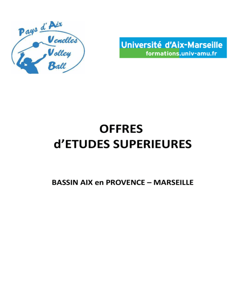 OFFRES d’ETUDES SUPERIEURES BASSIN AIX en PROVENCE – MARSEILLE COMMERCE – ECONOMIE – GESTION – TRANSPORT - LOGISTIQUE TYPE BTS DUT MENTION - Assistant de gestion PME-PMI - Assistant de manager - Commerce international - Comptabilité et gestion - Management des unités commerciales - Négociation et relation client - Gestion logistique et transport Techniques de commercialisation Gestion administrative et commerciale des org Gestion des entreprises et des administrations (GEA) PREPA LICENCE - économiques et ommerciales - économiques et ommerciales - Administration économique et sociale Administration publique Economie et gestion Gestion - Information et communication LIEU REMARQUES - Aix-en-Provence Lycée Emile Zola Lycée Saint-Eloi - Aix-en-Provence Lycée Emile Zola Lycée Saint-Eloi - Luynes Lycée international Georges Duby - Aix-en-Provence Lycée Emile Zola Lycée Clovis Hugues Lycée du Sacré-Cœur - Aix-en-Provence Lycée professionnel Gambetta - Marignane/Aubagne/ Marseille/Salon de Provence Aix-en-Provence - Aix-en-Provence Lycée Paul Cézanne - Aix-en-Provence Lycée Militaire Lycée La Nativité - option scientifique(ECS) option économique (ECE) - Licence 3 - Licence 3 Aix-en-Provence TOURISME - HOTELLERIE TYPE BTS MENTION - Tourisme LIEU - Aix-en-Provence Lycée Clovis Hugues REMARQUES - Information et multimédia Information et tourismatique DROIT – SCIENCES POLITIQUES TYPE BTS LIEU MENTION - Marseille Lycée Victor Hugo - Marseille Lycée Victor Hugo Lycée Maximilien de Sully - Notariat - Professions immobilières GRANDES ECOLES - Institut d’étude politique IEP Aix-en-Provence LICENCE - Administration économique et sociale AES Droit Aix-en-Provence - REMARQUES SANTE - SOCIAL TYPE BTS DUT MENTION - Diététique - Services et prestations des secteurs sanitaire et social (SP3S) Economique social et familiale (ESF) - Carrières sociales LIEU REMARQUES - Marseille Lycée Marie Curie Lycée La Cadenelle - Aix-en-Provence Lycée E. Zola - Marseille Lycée Marie Curie Lycée Pastré Grande Bastide Lycée La Cadenelle Aix-en-Provence - Option gestion urbaine LETTRES – ARTS – LANGUES – SCIENCES HUMAINES - COMMUNICATION TYPE BTS MENTION - Design d’espace - Design de communication - Design de produits - Design graphique - Communication - Information et communication - Carrières sociales Information – Communication MISE A NIVEAU - Mise à niveau arts appliqués LICENCE - Lettres - Langues, littératures et civilisation étrangères et régionales (LLCER) - Langues étrangères appliquées (LEA) - Arts du spectacle Arts plastiques Géographie et aménagement Histoire Histoire de l’Art et archéologie Musicologie Philosophie Psychologie Sciences de l’éducation Sciences de l’homme anthropologie Ethnologie Sciences du langage Sociologie - Formation de base aux métiers du théâtre DUT LIEU - Marseille Lycée Denis Didero - Marseille Lycée Marie Curie - Marseille Lycée Jean Perrin - Marseille Lycée Saint Exupéry Lycée Saint-Joseph-les-Maristes REMARQUES - espace et volume - communication et médias imprimés communication et médias numériques - - Marseille Lycée Saint Exupéry Lycée Jeanne Perrimond Aix-en-Provence DEUST métiers du livre et du patrimoine - Marseille Lycée Marie Curie Lycée Denis Diderot Lycée Saint-Joseph-les-Maristes Aix-en-Provence Aix-en-Provence - Lettres modernes et lettres classiques - Anglais – allemand, arabe, chinois, espagnol, hindi, italien, japonais, portugais, russe - Licence 3 - Licence 3 SCIENCES - INDUSTRIE TYPE BTS DUT - Analyses de biologie médicale - Bio-analyses et contrôles - Biotechnologie - Systèmes numériques - Informatique Chimie Génie biologique Génie chimique – génie des procédés Génie électrique et informatique industrielle Génie mécanique et productique Génie thermique et énergie Hygiène, sécurité environnement Mesures physiques Métier du multimédia et de l’internet Réseaux et télécommunications LICENCE LIEU MENTION - Chimie Informatique Mathématiques et informatique appliquées aux sciences et sociales Mathématiques Mécanique Physique - Marseille Lycée Marie Curie Lycée de Chimie-Biologie La Forbin - Marseille Lycée Marie Curie - Marseille Lycée Marie Curie Lycée de Chimie-Biologie La Forbine - Aix-en-Provence Lycée Vauvenargues Lycée St-Eloi REMARQUES - option informatique et réseaux Marseille Marseille - Licence 3 SPORT - ANIMATION TYPE MENTION LIEU Marseille LICENCE - Sciences et techniques des activités physiques et sportives (STAPS) BPJEPS - Brevet Professionnel de la Jeunesse de l’Education Populaire et du Sport CREPS Aix-en-Provence PREPA SPORT Aix REMARQUES