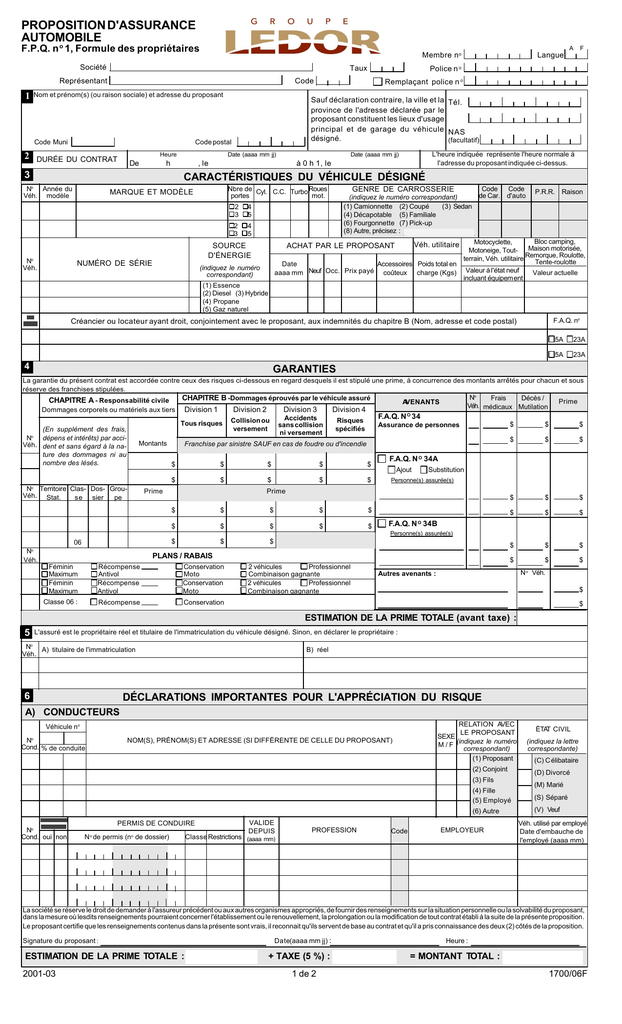 PROPOSITION D'ASSURANCE AUTOMOBILE F.P.Q. n o 1, Formule des propriétaires A Membre n o Société Taux Représentant 1 Code Muni 2 Police n o Code Nom et prénom(s) (ou raison sociale) et adresse du proposant DURÉE DU CONTRAT De Date (aaaa mm jj) h L'heure indiquée représente l'heure normale à l'adresse du proposant indiquée ci-dessus. Date (aaaa mm jj) , le 3. Remplaçant police n o Sauf déclaration contraire, la ville et la Tél. province de l'adresse déclarée par le proposant constituent les lieux d'usage principal et de garage du véhicule NAS désigné. (facultatif) Code postal Heure F Langue à 0 h 1, le CARACTÉRISTIQUES DU VÉHICULE DÉSIGNÉ No Année du Véh. modèle Nbre de Cyl. C.C. Turbo Roues portes mot. MARQUE ET MODÈLE 2 3 4 5 2 3 4 5 SOURCE D'ÉNERGIE No Véh. NUMÉRO DE SÉRIE Code Code GENRE DE CARROSSERIE de Car. d'auto (indiquez le numéro correspondant) (1) Camionnette (2) Coupé (3) Sedan (4) Décapotable (5) Familiale (6) Fourgonnette (7) Pick-up (8) Autre, précisez : Véh. utilitaire ACHAT PAR LE PROPOSANT Date Accessoires Poids total en aaaa mm Neuf Occ. Prix payé coûteux charge (Kgs) (indiquez le numéro correspondant) P.R.R. Raison Bloc camping, Motocyclette, Maison motorisée, Motoneige, ToutRemorque, Roulotte, terrain, Véh. utilitaire Tente-roulotte Valeur à l'état neuf incluant équipement Valeur actuelle (1) Essence (2) Diesel (3) Hybride (4) Propane (5) Gaz naturel F.A.Q. no Créancier ou locateur ayant droit, conjointement avec le proposant, aux indemnités du chapitre B (Nom, adresse et code postal) 4 5A 23A 5A 23A GARANTIES La garantie du présent contrat est accordée contre ceux des risques ci-dessous en regard desquels il est stipulé une prime, à concurrence des montants arrêtés pour chacun et sous réserve des franchises stipulées. No CHAPITRE B -Dommages éprouvés par le véhicule assuré Frais Décès / CHAPITRE A - Responsabilité civile Prime AVENANTS Véh. médicaux Mutilation Dommages corporels ou matériels aux tiers Division 1 Division 2 Division 3 Division 4 Tous risques (En supplément des frais, No dépens et intérêts) par acciVéh. dent et sans égard à la nature des dommages ni au nombre des lésés. Montants No Territoire Clas- Dos- GrouVéh. Stat. se sier pe Accidents sans collision ni versement Collision ou versement F.A.Q. N O 34 Risques spécifiés Assurance de personnes Franchise par sinistre SAUF en cas de foudre ou d'incendie $ $ $ $ $ $ $ $ $ $ $ $ Prime $ $ $ $ $ $ $ $ $ $ $ $ $ $ $ $ $ $ $ $ $ $ $ $ $ $ F.A.Q. N O 34A Ajout Substitution Personne(s) assurée(s) Prime $ $ F.A.Q. N O 34B Personne(s) assurée(s) 06 No Véh. PLANS / RABAIS Féminin Maximum Féminin Maximum Récompense Antivol Récompense Antivol Conservation Moto Conservation Moto Classe 06 : Récompense Conservation $ 2 véhicules Professionnel Combinaison gagnante 2 véhicules Professionnel Combinaison gagnante N o Véh. Autres avenants : $ $ ESTIMATION DE LA PRIME TOTALE (avant taxe) : 5 L'assuré est le propriétaire réel et titulaire de l'immatriculation du véhicule désigné. Sinon, en déclarer le propriétaire : No A) titulaire de l'immatriculation Véh. 6 B) réel DÉCLARATIONS IMPORTANTES POUR L'APPRÉCIATION DU RISQUE A) CONDUCTEURS Véhicule no No Cond. % de conduite NOM(S), PRÉNOM(S) ET ADRESSE (SI DIFFÉRENTE DE CELLE DU PROPOSANT) RELATION AVEC LE PROPOSANT SEXE (indiquez le numéro M/F correspondant) (1) Proposant (2) Conjoint (3) Fils (4) Fille (5) Employé (6) Autre VALIDE DEPUIS Classe Restrictions (aaaa mm) PERMIS DE CONDUIRE No Cond. oui non N o de permis (no de dossier) PROFESSION Code EMPLOYEUR ÉTAT CIVIL (indiquez la lettre correspondante) (C) C élibataire (D) Divorcé (M) Marié (S) Séparé (V) Veuf Véh. utilisé par employé Date d'embauche de l'employé (aaaa mm) La société se réserve le droit de demander à l'assureur précédent ou aux autres organismes appropriés, de fournir des renseignements sur la situation personnelle ou la solvabilité du proposant, dans la mesure où lesdits renseignements pourraient concerner l'établissement ou le renouvellement, la prolongation ou la modification de tout contrat établi à la suite de la présente proposition. Le proposant certifie que les renseignements contenus dans la présente sont vrais, il reconnait qu'ils servent de base au contrat et qu'il a pris connaissance des deux (2) côtés de la proposition. Signature du proposant : ESTIMATION DE LA PRIME TOTALE : 2001-03 Date(aaaa mm jj) : + TAXE (5 %) : 1 de 2 Heure : = MONTANT TOTAL : 1700/06F SINISTRES — Déclarez les détails de tous les sinistres, ayant impliqué les conducteurs désignés au recto de la présente proposition, au cours des six années immédiatement antérieures au présent contrat. Date du No No sinistre Véh. Cond. (aaaa mm jj) MONTANT(S) SUR CHAPITRE(S) IMPLIQUÉ(S) % Sin. Dommages Domm. au véhicule Total des Resp. État. Resp. code(s) à des tiers Coll./vers. Autres dommages code Dos. DÉTAILS INFRACTIONS — Un des conducteurs désignés à l'article 6 a-t-il déjà commis une infraction au code de la route (ex. : point s d'inaptitudes) ou au code criminel (ex. : suspension de permis), au cours des six années immédiatement antérieures au présent contrat? non oui, précisez : No Date No Date DÉTAILS Code Cond. DÉTAILS Code Cond. (aaaa mm) (aaaa mm) INTERDICTION — Y -a-t-il eu une ou des interdictions de la part d'autorités compétentes touchant la propriété, l'usage ou la conduite d'un véhicule automobile pour le proposant, pour chacun des conducteurs désignés à l'article 6 et pour toute personne ayant le même domicile que le proposant, au cours des six années immédiatement antérieures au présent contrat ? non oui, précisez : Date NOM DÉTAILS (aaaa mm) B) USAGE DU VÉHICULE a) Le véhicule sert principalement aux usages suivants : b) Le véhicule est-il loué ? non c) Le véhicule sert-il : au transport de personnes Kilométrage annuel Total Pour affaires N