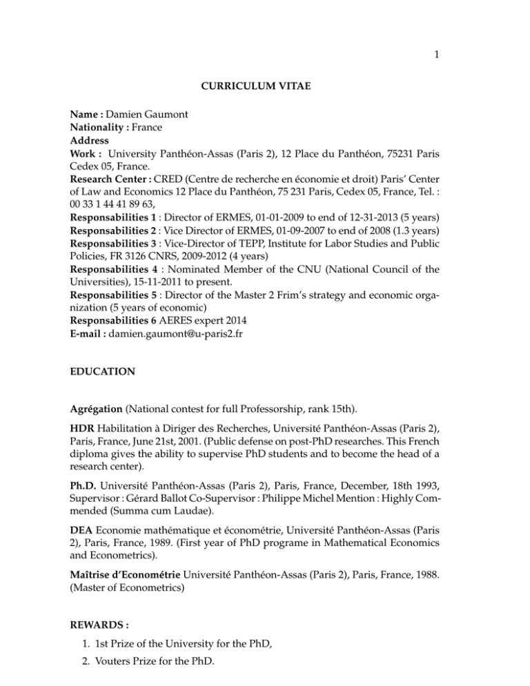 1 CURRICULUM VITAE Name : Damien Gaumont Nationality : France Address Work : University Panthéon-Assas (Paris 2), 12 Place du Panthéon, 75231 Paris Cedex 05, France. Research Center : CRED (Centre de recherche en économie et droit) Paris’ Center of Law and Economics 12 Place du Panthéon, 75 231 Paris, Cedex 05, France, Tel. : 00 33 1 44 41 89 63, Responsabilities 1 : Director of ERMES, 01-01-2009 to end of 12-31-2013 (5 years) Responsabilities 2 : Vice Director of ERMES, 01-09-2007 to end of 2008 (1.3 years) Responsabilities 3 : Vice-Director of TEPP, Institute for Labor Studies and Public Policies, FR 3126 CNRS, 2009-2012 (4 years) Responsabilities 4 : Nominated Member of the CNU (National Council of the Universities), 15-11-2011 to present. Responsabilities 5 : Director of the Master 2 Frim’s strategy and economic organization (5 years of economic) Responsabilities 6 AERES expert 2014 E-mail : [email protected] EDUCATION Agrégation (National contest for full Professorship, rank 15th). HDR Habilitation à Diriger des Recherches, Université Panthéon-Assas (Paris 2), Paris, France, June 21st, 2001. (Public defense on post-PhD researches. This French diploma gives the ability to supervise PhD students and to become the head of a research center). Ph.D. Université Panthéon-Assas (Paris 2), Paris, France, December, 18th 1993, Supervisor : Gérard Ballot Co-Supervisor : Philippe Michel Mention : Highly Commended (Summa cum Laudae). DEA Economie mathématique et économétrie, Université Panthéon-Assas (Paris 2), Paris, France, 1989. (First year of PhD programe in Mathematical Economics and Econometrics). Maîtrise d’Econométrie Université Panthéon-Assas (Paris 2), Paris, France, 1988. (Master of Econometrics) REWARDS : 1. 1st Prize of the University for the PhD, 2. Vouters Prize for the PhD. 2 POSITIONS HELD – Professeur agrégé des Universités (Full Professor) University Panthéon-Assas (Paris 2), September 2007 to present, PR1. – Professeur agrégé des Universités (Full Professor) University of The French West Indies (Antilles-Guyane), France September 2004 to 2007. – Invited Professor Flinders University, July 2006, Adelaide, Australia – Associate Professor at the IAP (Algerian Institute for Petroleum), Alger, Algeria, 2004 to 2006. (Master of Petroleum Economics for Engineers). – Associate Professor (Maître de Conférences) Université Panthéon-Assas (Paris 2), Paris, France, 1994 - 2004, (with tenure from January 11th, 1995). – Associate Professor at the IFP, Paris, France, 1993 to present. (French Institute of Petroleum, program for Engineers, Department of Economics). – Part time instructor January-May 2004, University of Toronto, Toronto, Canada. – Invited Associate Professor, Université de la Polynésie Française, Papeete, Tahiti, April- Mai 1999. – Associate Professor, FACO Independent University of Law and Economics, Paris, France, 1995. – Invited Associate Professor, Institute for Labour Economics, Lisboa, Portugal, 1995. – Visiting Scholar, Flinders University of South Australia, Adelaide, Australia, Mai-June 1996. – Visiting Scholar, Institute For Economics and Social Research, Stockholm, Sweden, Nov- Dec. 1992. – Visiting Scholar, Institute For Economics and Social Research, Stockholm, Sweden, Oct-Dec 1991. – Assistant Professor, Université Panthéon-Assas (Paris 2), Paris, France, 19891994. PROFESSIONAL SOCIETIES – Founder Member of the Overlapping Generation Models Group, Paris, France, 1990, – APET : Association of Public Economic Theory, member, – SED : Society for Economic Dynamics, member, – APE : Association of Population Economists, member, – EALE : European Association of Labour Economists 1990-1996, – AEA : Applied Economics Association 1989-1993. – AFSE : French Asoociation of Economics – EALE : European Association of Law and Economics 2010, TEACHING INTERESTS 3 – – – – – – – – – – – – – – – Economic modeling Games Theory, Finance Macroeconomics, Economic growth Microeconomics, Labor economics, Theory of incentives and contracts Corporate governance Capital Market, Industrial economics Demographics, Risk Management, Theory of decision National Accounting. RESEARCH INTERESTS – – – – – – Law and Economics Labor economics, Indsutrial Organization, Search theory, Value of the firm (physical capital and human capital) Growth in Overlapping Generations Models. PUBLICATIONS ARTICLES 1. What is the Natural Weight of the Current Old ? with Daniel Leonard, Theoretical Economics Letters, 2013, 3 :257-261, October 2013. 2. "International Migration and Uncertainty : A Non-Factor Price Equalization Overlapping Generations Model", with Charbel MacDissi, Brussels Economic Review 2012, 55(2) :151-177 3. "Human Capital, Externalities and Growth in an Overlapping Generations Model" with Daniel Leonard, Research in Economics, 2010, 60 :186-200. 4. "Allocating the value sharing in open-loop optimal control problem between various types of state variables", with Axel Pierru, Optimal Control, Applications and Methods, vol 30, march 2009, p. 209-216. 4 5. "Fixed-Wages, Wage differentials and Workers heterogeneities" with G. Carlier, Australian Economic Papers, December 2008, p 320-333. 6. "Wage dispersion : an example" (2006) with Martin Schindler et Randall Wright, Berkeley Electronic Journal of Macroeconomics, 6(2) art. 11 October 3rd 2006, http ://www.bepress.com/bejm/topics/vol6/iss2/art11 (a) IMF working paper, 06/19, International Monetary Fund 7. "Alternative theories of wage dispersion," with Martin Schindler et Randall Wright, European Economic Review 2006, 50(4) p : 831-848 (a) article reprinted in The Elsevier’s series on ’Contributions to Economic Analysis’ entitled "Models of Wage and Employment Dynamics" 2006. (b) IMF working paper 05/64 International Monetary Fund 8. "Characteristics of goods and competitive Equilibrium," with Philippe Michel, Louvain Econ