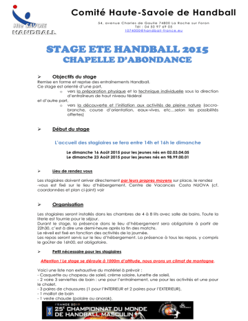 Comité Haute-Savoie de Handball 5 4 , a v e n u e C h a r l e s d e Ga u l l e 7 4 8 0 0 L a R o c h e s u r F o r o n Tél : 04 50 97 69 05 1074000@handball -france.eu STAGE ETE HANDBALL 2015 CHAPELLE D’ABONDANCE Objectifs du stage Remise en forme et reprise des entraînements Handball. Ce stage est orienté d’une part, o vers la préparation physique et la technique individuelle sous la direction d’entraîneurs de haut niveau fédéral et d’autre part, o vers la découverte et l’initiation aux activités de pleine nature (accrobranche, course d’orientation, eaux-vives, etc…selon les possibilités offertes) Début du stage L’accueil des stagiaires se fera entre 14h et 16h le dimanche Le dimanche 16 Août 2015 pour les jeunes nés en 02.03.04.05 Le dimanche 23 Août 2015 pour les jeunes nés en 98.99.00.01 Lieu de rendez vous Les stagiaires doivent arriver directement par leurs propres moyens sur place, le rendez -vous est fixé sur le lieu d’hébergement, Centre de Vacances Costa NUOVA (cf. coordonnées et plan ci-joint) voir Organisation Les stagiaires seront installés dans les chambres de 4 à 8 lits avec salle de bains. Toute la literie est fournie pour le séjour. Durant le stage, la présence dans le lieu d’hébergement sera obligatoire à partir de 22h30, c’est à dire une demi-heure après la fin des matchs. Le réveil est fixé en fonction des activités de la journée. Les repas seront servis sur le lieu d’hébergement. La présence à tous les repas, y compris le goûter de 16h00, est obligatoire. Petit nécessaire pour les stagiaires Attention ! Le stage se déroule à 1000m d’altitude, nous avons un climat de montagne. Voici une liste non exhaustive du matériel à prévoir : - Casquette ou chapeau de soleil, crème solaire, lunette de soleil, - 2 voire 3 serviettes de bain : une pour l’entraînement, une pour les activités et une pour le chalet, - 3 paires de chaussures (1 pour l’INTERIEUR et 2 paires pour l’EXTERIEUR), - 1 maillot de bain - 1 veste chaude (polaire ou anorak), Comité Haute-Savoie de Handball 5 4 , a v e n u e C h a r l e s d e Ga u l l e 7 4 8 0 0 L a R o c h e s u r F o r o n Tél : 04 50 97 69 05 [email protected] - 1 veste pour la pluie et/ou le vent, - des pullover, - plusieurs shorts et t-shirts pour les entraînements, - raquettes et balles de ping-pong si vous en avez - 1 ballon - 1 sac à dos pour emmener ses affaires de hand ou pour les activités (éviter le gros sac de voyage pas très pratique lorsqu’il faut marcher !!), - 1 lampe de poche. L’encadrement Les stagiaires seront placés sous la responsabilité des Animateurs, animatrices et entraîneurs, diplômés d’état, selon la législation en vigueur. Les activités Les stagiaires réaliseront sur l’ensemble de la semaine 1 à 2 entraînements par jour, des matchs ainsi que des activités parallèles telles que : accro-branches, piscine, grands jeux lecture, ping-pong….. Toutes ces activités sont encadrées par des animateurs et ou moniteurs brevetés d’état. Suivi sanitaire Une fiche sanitaire de liaison, jointe au courrier, doit être remplie précisément. Aucun stagiaire ne pourra être accepté sans la fourniture préalable de cette fiche dûment complétée (Arrêté du 20 Février 2003 relatif au suivi sanitaire). Si un enfant prend des médicaments sur ordonnance, il est impératif de joindre la prescription médicale validée par le médecin traitant et une autorisation écrite de ses parents permettant la mise en œuvre du traitement. Les médicaments seront stockés à l’infirmerie sous la responsabilité de l’assistant (e) sanitaire. En cas d’accident ou de maladie les frais médicaux et les frais nécessités par un traitement sont à la charge des familles afin de respecter la législation des séjours spécifiques avec hébergement (Arrêté du 20 Février 2003 relatif au suivi sanitaire). Un cabinet médical se trouve à proximité du centre et les stagiaires pourront consulter si besoin ou urgences les médecins de permanence, non sans en avoir informé l’A.S, qui prendra toute(s) mesure (s) jugée (s) adéquate (s) Assurance (Art 37, loi 84 modifiée juillet 2000) Le contrat souscrit par la Fédération Française de Handball auprès de La Mutuelle du Mans Assurances (Contrat n° 114 246 500) pour sa partie Responsabilité Civile individuelle Accident étend ses garanties au stage d’été de la Chapelle d’Abondance pour les licenciés FFHB. Les stagiaires non licenciés à la Fédération Française de Handball sont tenus de fournir un certificat médical de non contre-indication à la pratique sportive et seront licenciés gratuitement suite à la réception du dossier d’inscription. Les stagiaires devront aussi être couverts par l’assurance responsabilité civile et individuelle accident de leurs parents et fournir le nom de leur compagnie d’assurance et le n° du contrat de leur police d’assurance. Comité Haute-Savoie de Handball 5 4 , a v e n u e C h a r l e s d e Ga u l l e 7 4 8 0 0 L a R o c h e s u r F o r o n Tél : 04 50 97 69 05 [email protected] Règlement financier Les stagiaires devront s’acquitter de la somme de 440 euros TTC pour l’inscription au stage. Un chèque d’arrhes d’un montant de 180 euros TTC sera demandé lors de l’inscription, le solde devra être réglé un mois avant le début du stage. Aucun remboursement des arrhes ne sera effectué en cas de désistement après le 01er juillet 2015. Autres modes de paiement acceptés : UNIQUEMENT les coupons sport ANCV. Les chèques bancaires doivent être libellés à l’ordre du Comité Haute-Savoie Handball. NB. Suite à une décision de la C.A.F. les bons CAF ne sont plus pris en compte pour les séjours sportifs organisés par des structures autres ques les centres directement. Date limite de réception des dossiers 15 Juin 2015 Pour une multi inscription (à partir de deux enfants), une réduction de 20€ par enfant sera