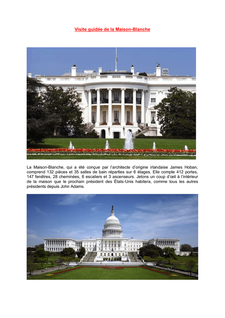 Visite guidée de la Maison-Blanche La Maison-Blanche, qui a été conçue par l’architecte d’origine irlandaise James Hoban, comprend 132 pièces et 35 salles de bain réparties sur 6 étages. Elle compte 412 portes, 147 fenêtres, 28 cheminées, 8 escaliers et 3 ascenseurs. Jetons un coup d’œil à l’intérieur de la maison que le prochain président des États-Unis habitera, comme tous les autres présidents depuis John Adams. Hall d’entrée Le hall sert d’entrée principale et formelle à la Maison pour accéder à l’étage de réception. Il a été rénové en 1902 durant le mandat de Harry S. Truman afin de retirer l’une des deux grandes cages d’escaliers dans le but d’agrandir la salle à manger d’État et de construire un grand escalier. C’est au premier palier que le président Ronald Reagan a prêté serment le 20 janvier 1985 pour son deuxième mandat. Hall central Juste derrière le hall d’entrée, le couloir aux murs et au plancher de marbre ajouté durant les rénovations des années Truman est décoré de deux chandeliers en cristal de style Adam fabriqués à Londres vers 1775. En 1837, un panneau de verre a été installé entre les colonnes pour garder la chaleur du salon est et de la salle à manger d’État. Ce panneau a été remplacé en 1882 par un vitrail signé Louis C. Tiffany, qui a été enlevé en 1902 et vendu aux enchères. Salon est La plus grande pièce de la maison a été conçue pour servir de salle d’audience publique et a été utilisée pour les événements comme les conférences de presse, les cérémonies de signature officielle, les soirées, les concerts, les mariages, les funérailles et les cérémonies de remise de prix. Au cours du dernier siècle, le salon est a été le théâtre de nombreux événements importants, dont la signature du Civil Rights Act de 1964 par le président Lyndon Johnson, l’assermentation de Gerald Ford comme président en 1974 et la signature des Accords de camp David en 1978. Le 23 mars 2010, le président Barack Obama a signé le Patient Protection and Affordable Care Act (loi sur la protection des patients et des soins abordables) dans cette pièce remplie d’histoire. Salon vert Le salon vert a principalement servi de salon de thé et pour les réceptions. Il a été nommé « salle à dîner verte » en 1825 sous la présidence de John Quincy Adams. L’ex-première dame Frances Cleveland a tenu sa première réception à la Maison-Blanche dans cette pièce et plus tard, Edith Roosevelt recevait des invités dans le salon vert avant les concerts du vendredi qui se déroulaient dans le salon est, juste à côté. Salon bleu C’est souvent dans cette pièce au centre du bâtiment que le président et sa femme reçoivent certains invités durant les grandes réceptions. Cette pièce est l’une des pièces ovales de la Maison-Blanche. Elle a été rénovée durant le mandat du président Martin Van Buren en 1837 et c’est à cette époque que le bleu a été choisi comme couleur pour les rideaux, les meubles et le tapis. Durant la période des Fêtes, c’est dans cette pièce qu’on installe le sapin de Noël de la Maison-Blanche. Salon rouge Cette pièce a été nommée ainsi en 1845, quand des meubles écarlates y ont été ajoutés. Avant qu’elle ne devienne l’une des pièces préférées des femmes des présidents, qui s’en servaient pour recevoir des amis et des invités de marque, elle était strictement réservée aux rencontres avec le président. Salle à manger d’État Quand le président Thomas Jefferson a entamé son mandat en 1801, il utilisait cette pièce comme bureau et rencontrait ses invités et visiteurs juste à côté, dans le salon rouge. Depuis 1809 toutefois, la pièce sert de salle à manger d’État. En 1902, la salle à dîner a été agrandie et complètement rénovée. Elle peut aujourd’hui accueillir plus de 140 invités durant les événements officiels. Bibliothèque Située au rez-de-jardin sur le côté sud, mais au sous-sol côté nord, cette pièce a d’abord été utilisée comme buanderie, puis comme salle d’attente. Ce n’est qu’en 1935 qu’elle a été transformée en bibliothèque. Elle contient plus de 2700 ouvrages consacrés à la vie et la pensée américaines. Aujourd’hui, on l’utilise surtout pour les points de presse. Salon vermeil La pièce est ainsi nommée en référence à la collection d’objets de vermeil qu’elle contient. La collection, qui compte 1 575 objets, contient des exemples du travail de certains des plus grands orfèvres des XVIIIe et des XIXe siècles. La pièce a autrefois été utilisée par les domestiques avant de devenir un vestiaire pour les dames en visite après les rénovations de 1902. Salon des porcelaines Cette pièce, autrefois réservée aux domestiques puis devenue un débarras après les rénovations de 1902, a été baptisée « salle de la collection présidentielle » par l’épouse du président Woodrow Wilson en 1917, afin d’exposer la collection grandissante de porcelaine de la Maison-Blanche. Depuis, elle est utilisée comme espace d’exposition pour des exemplaires de la vaisselle en porcelaine, en verre et en argent utilisés à la Maison-Blanche ou par les familles présidentielles. Chambre de Lincoln Avant les rénovations de 1902, cette pièce du deuxième étage a été utilisée comme bureau ou comme salle de réunion pour le cabinet du président. La chambre de Lincoln a été redécorée à maintes reprises au cours des cinquante dernières années, notamment par Jackie Kennedy, et elle a toujours contenu des meubles de l’époque victorienne. C’est dans cette pièce qu’Abraham Lincoln a signé la Proclamation d’indépendance, le 1er janvier 1863. 13/13 DIAPOSITIVES © Paul J. Richards/AFP/Getty Images Bureau ovale Lieu officiel de travail du président, le Bureau ovale est situé dans l’aile ouest de la MaisonBlanche, qui a été construite du