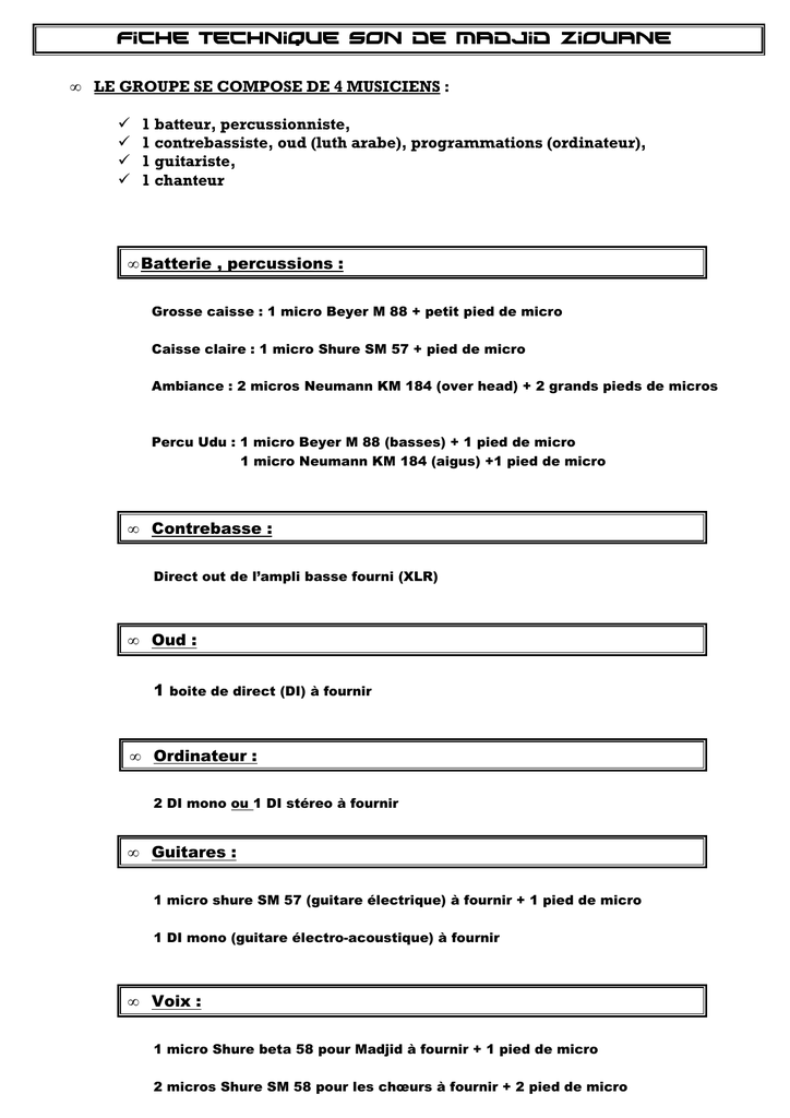 Fiche technique son de madjid ziouane • LE GROUPE SE COMPOSE DE 4 MUSICIENS : 1 batteur, percussionniste, 1 contrebassiste, oud (luth arabe), programmations (ordinateur), 1 guitariste, 1 chanteur • Batterie , percussions : Grosse caisse : 1 micro Beyer M 88 + petit pied de micro Caisse claire : 1 micro Shure SM 57 + pied de micro Ambiance : 2 micros Neumann KM 184 (over head) + 2 grands pieds de micros Percu Udu : 1 micro Beyer M 88 (basses) + 1 pied de micro 1 micro Neumann KM 184 (aigus) +1 pied de micro • Contrebasse : Direct out de l’ampli basse fourni (XLR) • Oud : 1 boite de direct (DI) à fournir • Ordinateur : 2 DI mono ou 1 DI stéreo à fournir • Guitares : 1 micro shure SM 57 (guitare électrique) à fournir + 1 pied de micro 1 DI mono (guitare électro-acoustique) à fournir • Voix : 1 micro Shure beta 58 pour Madjid à fournir + 1 pied de micro 2 micros Shure SM 58 pour les chœurs à fournir + 2 pied de micro fiche technique son de madjid ziouane • Il est nécessaire de disposer de 2 heures de balance pour le confort de tout le monde • L’ordinateur doit être posé sur une petite table (à fournir) • 4 retours pour les musiciens (dont 1 double pour le chanteur) • 2 multi- effets (réverb) en auxiliaires de la console de mixage Régisseur son de madjid ziouane : BRUNO CAVILLA 06 82 18 12 33 VOIE CONSOLE INSTRUMENT OU VOIE FX MICRO OU D.I 1 GROSSE CAISSE 1 M 88 2 CAISSE CLAIRE 1 SM 57 3 OVER HEAD L 1 KM 184 4 OVER HEAD R 1 KM 184 5 UDU (percussion) L 1 KM 184 6 UDU (percussion) R 1 M 88 7 CONTREBASSE OUT AMPLI (XLR) 8 OUD 1 DI 9 ORDINATEUR L 1 DI 10 ORDINATEUR R 1 DI 11 GUITARE ELECTRIQUE 1 SM 57 (devant l’ampli) 12 ELECTRO - ACOUSTIQUE 1 DI 13 VOIX CHŒUR (contrebassiste) 1 SM 58 14 VOIX CHŒUR (guitariste) 1 SM 58 15 VOIX LEAD 1 BETA 58 si possible 16 RETOURS FX (réverb 1) 17 RETOURS FX (réverb 2) = retours scène A = micros chant = boite de direct mono BATTERIE PERCUSSIONS CONTREBASSE TABLE ORDI CHANT OUD GUITARES ORDINATEUR B D D’ C Plan de scene de Madjid Ziouane