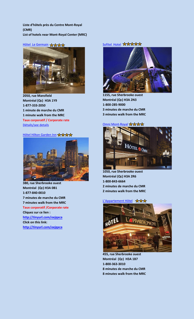 Liste d’hôtels près du Centre Mont-Royal (CMR) List of hotels near Mont-Royal Center (MRC) Hôtel Le Germain Sofitel Hotel 2050, rue Mansfield Montréal (Qc) H3A 1Y9 1-877-333-2050 1 minute de marche du CMR 1 minute walk from the MRC Taux corporatif / Corporate rate Détails/see details 1155, rue Sherbrooke ouest Montréal (Qc) H3A 2N3 1-800-285-9000 3 minutes de marche du CMR 3 minutes walk from the MRC Omni Mont-Royal Hôtel Hilton Garden Inn 380, rue Sherbrooke ouest Montréal (Qc) H3A 0B1 1-877-840-0010 7 minutes de marche du CMR 7 minutes walk from the MRC Taux corporatif /Corporate rate Cliquez sur ce lien : http://tinyurl.com/oejqxca Click on this link: http://tinyurl.com/oejqxca 1050, rue Sherbrooke ouest Montréal (Qc) H3A 2R6 1-800-843-6664 2 minutes de marche du CMR 2 minutes walk from the MRC L’Appartement Hôtel 455, rue Sherbrooke ouest Montréal (Qc) H3A 1B7 1-800-363-3010 8 minutes de marche du CMR 8 minutes walk from the MRC