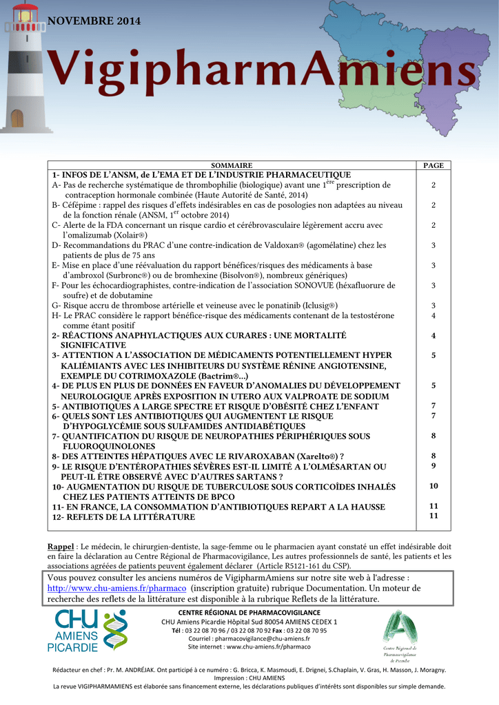 NOVEMBRE 2014 SOMMAIRE 1- INFOS DE L’ANSM, de L’EMA ET DE L’INDUSTRIE PHARMACEUTIQUE A- Pas de recherche systématique de thrombophilie (biologique) avant une 1ère prescription de contraception hormonale combinée (Haute Autorité de Santé, 2014) B- Céfépime : rappel des risques d’effets indésirables en cas de posologies non adaptées au niveau de la fonction rénale (ANSM, 1er octobre 2014) C- Alerte de la FDA concernant un risque cardio et cérébrovasculaire légèrement accru avec l’omalizumab (Xolair®) D- Recommandations du PRAC d’une contre-indication de Valdoxan® (agomélatine) chez les patients de plus de 75 ans E- Mise en place d’une réévaluation du rapport bénéfices/risques des médicaments à base d’ambroxol (Surbronc®) ou de bromhexine (Bisolvon®), nombreux génériques) F- Pour les échocardiographistes, contre-indication de l’association SONOVUE (héxafluorure de soufre) et de dobutamine G- Risque accru de thrombose artérielle et veineuse avec le ponatinib (Iclusig®) H- Le PRAC considère le rapport bénéfice-risque des médicaments contenant de la testostérone comme étant positif 2- RÉACTIONS ANAPHYLACTIQUES AUX CURARES : UNE MORTALITÉ SIGNIFICATIVE 3- ATTENTION A L’ASSOCIATION DE MÉDICAMENTS POTENTIELLEMENT HYPER KALIÉMIANTS AVEC LES INHIBITEURS DU SYSTÈME RÉNINE ANGIOTENSINE, EXEMPLE DU COTRIMOXAZOLE (Bactrim®…) 4- DE PLUS EN PLUS DE DONNÉES EN FAVEUR D’ANOMALIES DU DÉVELOPPEMENT NEUROLOGIQUE APRÈS EXPOSITION IN UTERO AUX VALPROATE DE SODIUM 5- ANTIBIOTIQUES A LARGE SPECTRE ET RISQUE D’OBÉSITÉ CHEZ L’ENFANT 6- QUELS SONT LES ANTIBIOTIQUES QUI AUGMENTENT LE RISQUE D’HYPOGLYCÉMIE SOUS SULFAMIDES ANTIDIABÉTIQUES 7- QUANTIFICATION DU RISQUE DE NEUROPATHIES PÉRIPHÉRIQUES SOUS FLUOROQUINOLONES 8- DES ATTEINTES HÉPATIQUES AVEC LE RIVAROXABAN (Xarelto®) ? 9- LE RISQUE D’ENTÉROPATHIES SÉVÈRES EST-IL LIMITÉ A L’OLMÉSARTAN OU PEUT-IL ÊTRE OBSERVÉ AVEC D’AUTRES SARTANS ? 10- AUGMENTATION DU RISQUE DE TUBERCULOSE SOUS CORTICOÎDES INHALÉS CHEZ LES PATIENTS ATTEINTS DE BPCO 11- EN FRANCE, LA CONSOMMATION D’ANTIBIOTIQUES REPART A LA HAUSSE 12- REFLETS DE LA LITTÉRATURE PAGE 2 2 2 3 3 3 3 4 4 5 5 7 7 8 8 9 10 11 11 Rappel : Le médecin, le chirurgien-dentiste, la sage-femme ou le pharmacien ayant constaté un effet indésirable doit en faire la déclaration au Centre Régional de Pharmacovigilance, Les autres professionnels de santé, les patients et les associations agréées de patients peuvent également déclarer (Article R5121-161 du CSP). Vous pouvez consulter les anciens numéros de VigipharmAmiens sur notre site web à l'adresse : http://www.chu-amiens.fr/pharmaco (inscription gratuite) rubrique Documentation. Un moteur de recherche des reflets de la littérature est disponible à la rubrique Reflets de la littérature. CENTRE RÉGIONAL DE PHARMACOVIGILANCE CHU Amiens Picardie Hôpital Sud 80054 AMIENS CEDEX 1 Tél : 03 22 08 70 96 / 03 22 08 70 92 Fax : 03 22 08 70 95 Courriel : [email protected] Site internet : www.chu-amiens.fr/pharmaco Rédacteur en chef : Pr. M. ANDRÉJAK. Ont participé à ce numéro : G. Bricca, K. Masmoudi, E. Drignei, S.Chaplain, V. Gras, H. Masson, J. Moragny. Impression : CHU AMIENS La revue VIGIPHARMAMIENS est élaborée sans financement externe, les déclarations publiques d’intérêts sont disponibles sur simple demande. 1- INFOS DE L’ANSM (Ex-AFSSAPS), de L’EMA, DE LA FDA ET DE L’INDUSTRIE PHARMACEUTIQUE ère A- Pas de recherche systématique de thrombophilie (biologique) avant une 1 prescription de contraception hormonale combinée (Haute Autorité de Santé, 2014) Le terme de thrombophilie biologique regroupe les anomalies de coagulation pouvant être mises en évidence biologiquement qui prédisposent à la maladie thrombo-embolique veineuse (MTEV), les anomalies qui peuvent être génétiques ou acquises. La question de la recherche de cette thrombophilie a été posée du fait de l’augmentation du risque de MTEV chez les utilisatrices de contraceptifs oraux (avec en particulier des embolies pulmonaires potentiellement fatales). Une évaluation de l’intérêt d’une recherche systématique de thrombophilie avant toute première utilisation d’un contraceptif hormonal combiné (CHC) a été menée à l’HAS. Les conclusions en sont que le dépistage systématique d’une thrombophilie avant prescription initiale d’une contraception orale ne devait pas être systématique, du fait de l’incidence faible chez les utilisatrices (5-12 pour 10 000 femmes selon le type de contraceptif) et du coût de cette recherche. La prescription d’une contraception repose sur l’évaluation des facteurs de risque au niveau individuel et doit être réévaluée régulièrement étant donné que ces facteurs peuvent évoluer avec le temps. Il est rappelé à cette occasion qu’un CHC ne doit jamais être utilisé en cas d’antécédents personnels de MTEV. Il n’est pas recommandé en cas d’antécédents familiaux de er MTEV chez des apparentés au 1 degré survenus avant l’âge de 50-60 ans. Les thrombophilies avérées, déjà diagnostiquées dans le cadre d’antécédents familiaux au 1er degré de MTEV survenus avant 50-60 ans, constituent une contre-indication à la prescription de CHC. Lorsqu’un CHC est prescrit, il est recommandé de prescrire en 1ère intention une pilule de 1ère ou 2ème génération (pilule contenant de la noréthistérone ou du lévonorgestrel et contenant moins de 50 µg d’éthinylestradiol). Face à une patiente présentant des symptômes de MTEV, la possibilité d’une thrombose induite par un CHC doit toujours être envisagée. B- Céfépime : rappel des risques d’effets indésirables en cas de posologies non adaptées au niveau de la fonction rénale (ANSM, 1er octobre 2014) Ce rappel de l’ANSM fait suite à la remontée (en particulier par le CRPV d’Amiens Picardie) de cas de troubles neurologiques sévères (