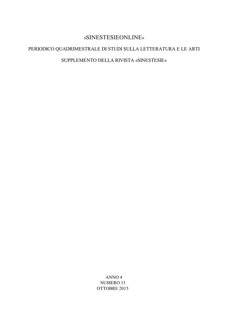 «SINESTESIEONLINE» PERIODICO QUADRIMESTRALE DI STUDI SULLA LETTERATURA E LE ARTI SUPPLEMENTO DELLA RIVISTA «SINESTESIE» ANNO 4 NUMERO 13 OTTOBRE 2015 «SINESTESIEONLINE» Periodico quadrimestrale di studi sulla letteratura e le arti Supplemento della rivista «Sinestesie» ISSN 2280-6849 D ire zio n e sc ie n tific a © Asso c ia zio n e c u ltu ra le in te rn a zio n a le Ed izio n i S in e ste sie CARLO SANTOLI ALESSANDRA OTTIERI (Proprietà letteraria) Via Tagliamento, 154 83100 Avellino www.rivistasinestesie.it - [email protected] D ire tto re re sp o n sa b ile PAOLA DE CIUCEIS C o o rd in a m e n to d i re d a zio n e D ire zio n e e re d a zio n e LAURA CANNAVACCIUOLO c/o Dott.ssa Alessandra Ottieri Via Giovanni Nicotera, 10 80132 Napoli Tutti i diritti di riproduzione e traduzione sono riservati. R e d a zio n e DOMENICO CIPRIANO MARIA DE SANTIS PROJA ANGELO FÀVARO CARLANGELO MAURO MARIO SOSCIA APOLLONIA STRIANO GIAN PIERO TESTA COMITATO SCIENTIFICO LEONARDO ACONE (Università di Salerno) EPIFANIO AJELLO (Università di Salerno) RENATO AYMONE (Università di Salerno) ANNAMARIA ANDREOLI (Università della Basilicata) ZYGMUNT G. BARANSKI (Università di Cambridge - Notre Dame) MICHELE BIANCO (Università di Bari “Aldo Moro”) GIUSEPPE BONIFACINO (Università di Bari “Aldo Moro”) RINO L. CAPUTO (Università di Roma “Tor Vergata”) ANGELO CARDILLO (Università di Salerno) BIANCA MARIA DA RIF (Università di Padova) MARC WILLIAM EPSTEIN (Università di Princeton) ANTONIO LUCIO GIANNONE (Università del Salento) ROSA GIULIO (Università di Salerno) ALBERTO GRANESE (Università di Salerno) EMMA GRIMALDI (Università di Salerno) SEBASTIANO MARTELLI (Università di Salerno) MILENA MONTANILE (Università di Salerno) FABRIZIO NATALINI (Università di Roma “Tor Vergata”) ANTONIO PIETROPAOLI (Università di Salerno) MARA SANTI (Università di Gent) SOMMARIO ARTICOLI MARIO SOSCIA Le ‘Grenoble’ de Naples MARIO SOSCIA Il ‘Grenoble’ di Napoli GIULIA CORSALINI Guerrino nel Regno della Sibilla. Tullia d’Aragona e il romanzo di Andrea da Barberino DANTE DELLA TERZA Laura Lilli, giornalista e scrittrice. Appunti per un ritratto GENNARO IANNARONE Appunti sulla paternità gesualdiana dei testi di alcuni madrigali SECONDINA MARAFINI Rosa Tomei: il profilo letterario inedito della donna di Trilussa AMOROSA MATTEI L’arte di perdere tempo FRANCESCO RIZZO La provincia come luogo di preservazione del mito: ‘Petrolio’ e ‘Gli dèi torneranno’ RECENSIONE FRANCESCA FAVARO, Stagioni (sognate), Sidebook, Pisa 2014 (Bianca Maria Da Rif) SEZIONI In Fieri Coordinatori Pérette-Cécile Buffaria e Gianmarco Gallotta COMITATO SCIENTIFICO SYLVAIN TROUSSELARD - Université Lumière - Lyon II LAURENT BAGGIONI - Université Jean Moulin - Lyon 3 PERETTE-CECILE BUFFARIA - Université de Lorraine - Nancy NICOLAS BONNET - Université de Bourgogne - Dijon GIANMARCO GALLOTTA - Université Jean Moulin - Lyon 3 PÉRETTE-CÉCILE BUFFARIA GIANMARCO GALLOTTA Presentazione della Sezione LAURENT BAGGIONI LE DÉSIR RÉCOMPENSÉ ? Notes sur la relation lyrique chez Guinizzelli et Cavalcanti L’isola che c’è. Orizzonti letterari per bambini e ragazzi A cura di Leonardo Acone COMITATO SCIENTIFICO LEONARDO ACONE - Università di Salerno ANNA ASCENZI - Università di Macerata MARINELLA ATTINÀ - Università di Salerno FLAVIA BACCHETTI - Università di Firenze MILENA BERNARDI - Università di Bologna EMY BESEGHI - Università di Bologna PINO BOERO - Università di Genova LORENZO CANTATORE - Università Rome Tre SABRINA FAVA - Università Cattolica di Milano SIMONETTA POLENGHI - Università Cattolica di Milano RECENSIONI SABRINA FAVA, Piccoli lettori del Novecento. I bambini di Paola Carrara Lombroso sui giornali per ragazzi, Sei Frontiere, Torino 2015 (Daniela Pellegrini) ELENA SURDI, Fantasia e Buonsenso. Antonio Rubino nei periodici per ragazzi (1907-1941), Pensa Multimedia, Lecce-Brescia 2015 (Daniela Pellegrini) Mediterraneità europea: Arti, letterature, civiltà del mediterraneo per rifondare l’identità del cittadino europeo del XXI secolo A cura di Angelo Fàvaro Università degli Studi di Roma “Tor Vergata” COMITATO SCIENTIFICO ANNAMARIA ANDREOLI - Università della Basilicata ALBERTO GRANESE - Università di Salerno L. RINO CAPUTO - Università di Roma «Tor Vergata» LAURA MELOSI - Università di Macerata LUISA NARDINI - University of Texas at Austin ADEL BEHI - Université la Manouba (Tunisia) ZOSI ZOGAFRIDOU - Università «Aristotele» di Salonicco ROBERTA MOROSINI - Wake Forest University (USA) KARL CHIRCOP - University of Malta RABIE SALAMA - Università Ain shams (Egitto) IAIN CHAMBERS - Università di Napoli l’Orientale SILVIA ROSS - University College of Cork (Irlanda) MARZIA ROSSI - Università degli Studi «Guglielmo Marconi» ANGELO FÀVARO Presentazione del Comitato Scientifico di Sezione MARCELLO PITTELLA - Presidente della Regione Basilicata L’Europa e il Mediterraneo. Noi e loro ANGELO FÀVARO Foscolo e Napoleone nella mediterraneità europea MAURA LOCANTORE Oriente quale è il tuo Occidente, Occidente quale è il tuo Oriente? Mario Soscia “LE GRENOBLE” DE NAPLES Université de Grenoble-Institut français de Naples (Lamont Young 1884) L’A. rapporte quelques aspects de l’histoire de l’Institut Français de Naples (université de Grenoble) depuis ses origines (1919) jusqu’à nos jours, avec quelques références aux aspects architectoniques (architecte Lamont Young), aux activités pratiquées et aux rapports culturels et institutionnels. De même que sont cités : les directeurs avec une référence ponctuelle à la ville de Grenoble et à son Université, à ses rapports avec la culture italienne et parthénopéenne, et à ses visiteurs et invités célèbres. La couleur dorée de la pierre de tuf resplendit au soleil, et, par surprise, inonde le visiteur de sa lumière chaude, alors qu’il parcourt Via Crispi tout en remontant de Piazza Amedeo : du nom