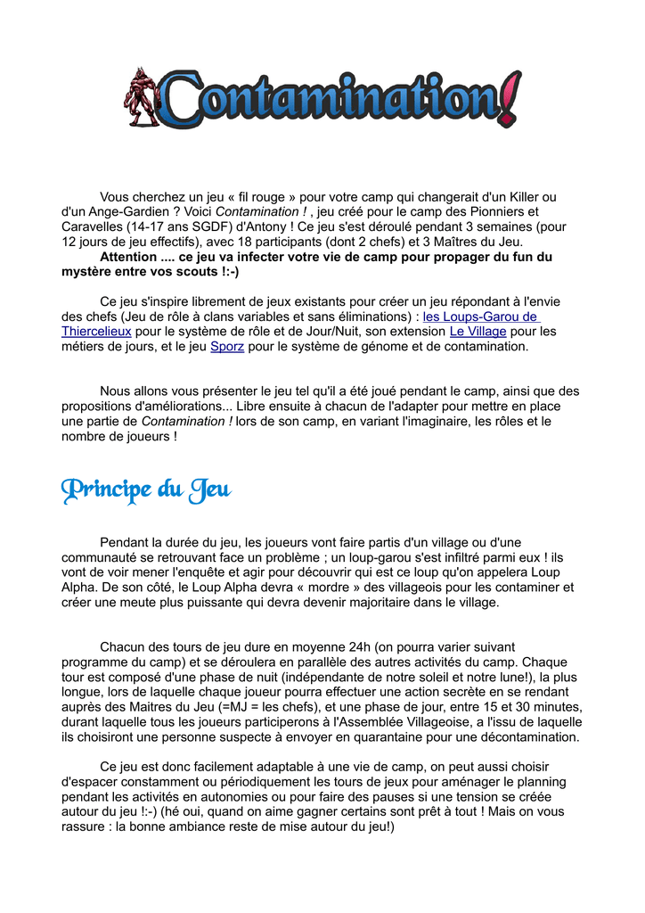 Vous cherchez un jeu « fil rouge » pour votre camp qui changerait d'un Killer ou d'un Ange-Gardien ? Voici Contamination ! , jeu créé pour le camp des Pionniers et Caravelles (14-17 ans SGDF) d'Antony ! Ce jeu s'est déroulé pendant 3 semaines (pour 12 jours de jeu effectifs), avec 18 participants (dont 2 chefs) et 3 Maîtres du Jeu. Attention .... ce jeu va infecter votre vie de camp pour propager du fun du mystère entre vos scouts !:-) Ce jeu s'inspire librement de jeux existants pour créer un jeu répondant à l'envie des chefs (Jeu de rôle à clans variables et sans éliminations) : les Loups-Garou de Thiercelieux pour le système de rôle et de Jour/Nuit, son extension Le Village pour les métiers de jours, et le jeu Sporz pour le système de génome et de contamination. Nous allons vous présenter le jeu tel qu'il a été joué pendant le camp, ainsi que des propositions d'améliorations... Libre ensuite à chacun de l'adapter pour mettre en place une partie de Contamination ! lors de son camp, en variant l'imaginaire, les rôles et le nombre de joueurs ! Principe du Jeu Pendant la durée du jeu, les joueurs vont faire partis d'un village ou d'une communauté se retrouvant face un problème ; un loup-garou s'est infiltré parmi eux ! ils vont de voir mener l'enquête et agir pour découvrir qui est ce loup qu'on appelera Loup Alpha. De son côté, le Loup Alpha devra « mordre » des villageois pour les contaminer et créer une meute plus puissante qui devra devenir majoritaire dans le village. Chacun des tours de jeu dure en moyenne 24h (on pourra varier suivant programme du camp) et se déroulera en parallèle des autres activités du camp. Chaque tour est composé d'une phase de nuit (indépendante de notre soleil et notre lune!), la plus longue, lors de laquelle chaque joueur pourra effectuer une action secrète en se rendant auprès des Maitres du Jeu (=MJ = les chefs), et une phase de jour, entre 15 et 30 minutes, durant laquelle tous les joueurs participerons à l'Assemblée Villageoise, a l'issu de laquelle ils choisiront une personne suspecte à envoyer en quarantaine pour une décontamination. Ce jeu est donc facilement adaptable à une vie de camp, on peut aussi choisir d'espacer constamment ou périodiquement les tours de jeux pour aménager le planning pendant les activités en autonomies ou pour faire des pauses si une tension se créée autour du jeu !:-) (hé oui, quand on aime gagner certains sont prêt à tout ! Mais on vous rassure : la bonne ambiance reste de mise autour du jeu!) Caractéristiques d'un joueur Chaque joueurs possède 4 caractéristique définissant son personnage, certaines sont connues de tous alors que d'autres sont contenus que du joueur, ou seulement de certains ! 1/ Le Rôle > Secret, pour les phases de « nuit » Les joueurs se verront attribuer au hasard un rôle caché symbolisant leur compétence/capacité (ex : Sorcière = maitrise des potions ) et leur conférant un pouvoir associé (ex : pouvoir distribuer X potions) pouvant être utilisé à chaque tour, pendant la nuit, caché des autres. Un des joueurs recevra le rôle du Loup Alpha, celui qui devra mener la bataille de la contamination. 2/ Le Métier > Public, pour les phases de « jour » Chaque joueur est également définit par un métier connu du tous, pioché au hasard au début du jeu. Le métier donne la possibilité d'effectué une action spécifique pendant la phase de jour lors de l'Assemblée Villageoise (ex : Abbé : écouter une personne en confession). Un des métiers est un non-métier : celui de vagabond. Mais les métiers sont amenés à tourner au cours du jeu, et la progression sociale est possible.. mais la perte de l'emploi aussi ! 3/ Le Génome > Secret, inconnu des joueurs Le Génome de chacun est ce qui définit sa propension a être contaminé/guéri ou non. On peut être Résistant (résistance naturelle à la contamination), Hôte (une fois contaminé, impossible d'être soigné), ou Standard (possibilité d'être contaminé ou guéri à l'infini). Les génomes sont, sauf exeption (ex : le Loup Alpha sera Hôte et non-guérissable) tirés au sort et inconnu des joueurs. Les joueurs seront amenés à les découvrir grâce à certains rôles, ou bien en apprenant leur contamination ou guérison (ou l'échecde ces actions sur eux). 4/ L'Etat > Secret Les joueurs pourront connaître l’état de « Sain », s'ils ne sont pas porteur du virus de loup-garou, ou « Contaminé » s'ils sont mordus par le Loup Alpha. Les MJ (Maître du Jeu) tiennent les joueurs au courant de leur état si celui-ci est amené à changé. L'était peut en effet changer à différent moment : − après la morsure des loups, on devient contaminé − après une action du guérisseur ou de la sorcière on redevient sain − ou bien encore après un envoi en quarantaine à la fin de l'assemblée du village (on perd au passage un tour de jeu (un jour et une nuit) le temps de la quarantaine!) − notons également qu'on peut être « paralysé » et être ainsi privé d'action de nuit pour un tour. Déroulement du jeu 1) Préparation du Jeu Tout d'abord, les MJ (Maîtres du jeu) doivent préparer la mise en place du jeu : ajuster Contamination ! au nombre du joueur sur le camp, tirer au sort les rôles, génomes de chacun, préparer les outils de MJ (le Tableau d'Affichage, la Pochette de Suivi, la Boîte à murmures …) sur lesquelles nous reviendront ci-après. 2) Lancement du Jeu La deuxième mission des MJ, et non des moindres, et celle du lancement. Ancré (ou pas) dans l'imaginaire du camp, il va falloir expliquer le jeu au joueurs ! Quand cette tâche sera faite, les MJ appelleront le joueur tiré au sort pour avoir le métier de Crieur Public, qui devra déclamer aux autres joueurs leurs métiers. Enfin, les MJ recevront un a un les joueurs pour leur apprendre leur Rôle secret et leur expliquer leur pouvoir en détail (il n'y a pas de support qui pourrait être égaré