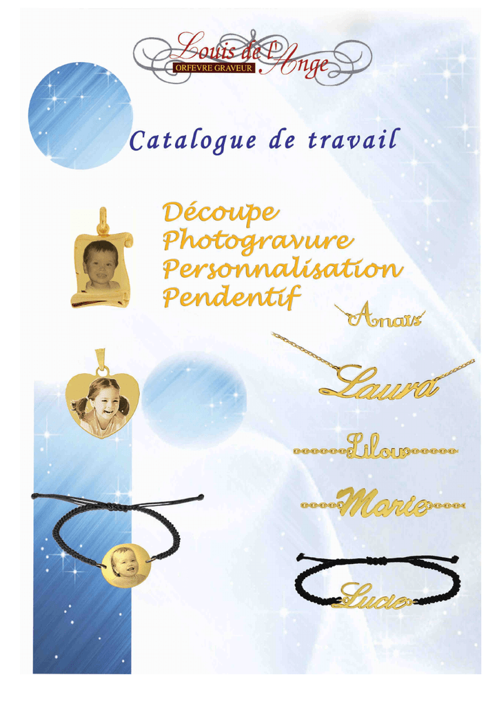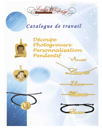 Nos conseillers vous répondent du lundi au vendredi de 9 h à 12 h et de 14 h à 17 h 30 Suivi Commande : 04.68.50.91.41 (choix 1) [email protected] Service Commercial : Virginie au 04.68.67.61.65 (ou choix 2) [email protected] Du lundi au vendredi de 9 h à 12 h et de 14 h à 17 h 30 Le mercredi de 9 h à 12 h et de 14 h à 15 h 30 Service Après-Vente : Dimitri au 04.68.67.61.64 (ou choix 3) [email protected] Service Comptabilité : Marie-José au 04.68.67.61.62 (ou choix 4) [email protected] FAX : 04.68.66.88.63 SARL LOUIS DE L'ANGE ZAC PARC SUD ROUSSILLON 4, RUE DE LA COTE RADIEUSE 66280 SALEILLES Votre commande expédiée sous 8 jours ouvrés par Exapaq 7.90 € HT Une urgence ? Votre commande expédiée sous 5 jours ouvrés en Express 15 € HT port inclus Afin que vous puissiez utiliser au mieux votre catalogue de travail et le montrer à vos clients, seuls les prix publics sont indiqués. TARIFS MEDAILLES OR JAUNE 375/1000e AVEC PHOTOGRAVURE REFERENCE DESIGNATION 91P1R104 PETITE RECTANGLE 1 VISAGE Epaisseur 0.3 POIDS (gr) mm PRIX PUBLIC 168 1.40 Visage supplémentaire : 20 € prix public Un onglet de couleur différente est présent sur chaque page afin d'identifier rapidement la gamme/la matière des articles concernés. Codification couleur Or 375/1000e Or 750/1000e Argent 925/1000e Plaqué or 3 Naissance microns Montres Porte-clés Prestations SAV Prénoms découpés - Chaînes disponibles Les tarifs diffèrent en fonction de la chaîne. Les références F30 sont livrées par défaut avec la chaîne CH1. Les références DPL sont livrées par défaut avec la chaîne CH2. Chaîne CH3 sur demande. Devis par fax ou téléphone. CH1 - chaîne forçat clair diamantée - 0.70 g - 0.8 mm CH3 - chaîne forçat diamantée - 2.50 g - 1.2 mm CH2 - chaîne forçat diamantée - 1.40 g - 0.9 mm COURS 40€/GR REFERENCE 9F30 TARIFS COLLIERS PRENOM OR JAUNE 375/1000e DESIGNATION POIDS THEORIQUE (gr) PRIX PUBLIC Collier prénom - de 6 lettres 1.00 125 Collier prénom + de 6 lettres 1.15 129 Collier prénom - de 6 lettres 1.65 145 Collier prénom + de 6 lettres 1.85 149 Collier prénom - de 6 lettres 2.15 165 Collier prénom + de 6 lettres 2.50 179 Collier prénom - de 6 lettres 2.15 165 Collier prénom + de 6 lettres 2.65 185 Collier prénom - de 6 lettres 1.80 149 Collier prénom + de 6 lettres 2.10 159 Collier prénom - de 6 lettres 1.90 155 Collier prénom + de 6 lettres 2.30 169 Collier prénom - de 6 lettres 1.90 155 Collier prénom + de 6 lettres 2.30 169 9DPL17 Epaisseur 0.4 mm Chaîne 40 cm 9DPL7 9DPL4 9DPL40 9DPL10 9DPL2 TARIFS COLLIERS PRENOM OR BLANC 375/1000e REFERENCE DESIGNATION POIDS THEORIQUE (gr) PRIX PUBLIC Collier prénom - de 6 lettres 1.15 129 Collier prénom + de 6 lettres 1.30 135 Collier prénom - de 6 lettres 2.10 179 Collier prénom + de 6 lettres 2.45 195 Collier prénom - de 6 lettres 2.45 195 Collier prénom + de 6 lettres 3.10 219 Collier prénom - de 6 lettres 2.55 195 Collier prénom + de 6 lettres 3.10 219 Collier prénom - de 6 lettres 2.20 185 Collier prénom + de 6 lettres 2.45 195 Collier prénom - de 6 lettres 2.35 189 Collier prénom + de 6 lettres 2.65 199 Collier prénom - de 6 lettres 2.25 185 Collier prénom + de 6 lettres 2.50 195 9DPOB30 9DPOB17 9DPOB7 9DPOB4 9DPOB40 9DPOB10 9DPOB2 Epaisseur 0.4 mm Chaîne 40 cm COURS 40€/GR REFERENCE BRA9F30 BRA9DPL17 BRA9DPL7 BRA9DPL40 TARIFS BRACELETS PRENOM OR JAUNE 375/1000e DESIGNATION bracelet prénom bébé - de 6 lettres / 12-14 cm bracelet prénom bébé + de 6 lettres / 12-14 cm bracelet prénom bébé - de 6 lettres / 12-14 cm bracelet prénom bébé + de 6 lettres / 12-14 cm bracelet prénom - de 6 lettres 14-16 cm bracelet prénom + de 6 lettres 14-16 cm bracelet prénom - de 6 lettres 14-16 cm bracelet prénom + de 6 lettres 14-16 cm POIDS THEORIQUE (gr) PRIX PUBLIC 1.05 99 1.15 109 1.25 125 1.45 135 1.70 145 2.00 155 1.60 139 1.90 149 Epaisseur 0.4 mm Chaîne forçat diamantée 1.6 mm TARIFS BRACELETS PRENOM OR BLANC 375/1000e REFERENCE DESIGNATION bracelet prénom bébé de 6 lettres / 12-14 cm BRA9DPOB30 bracelet prénom bébé + de 6 lettres / 12-14 cm bracelet prénom bébé de 6 lettres / 12-14 cm BRA9DPOB17 bracelet prénom bébé + de 6 lettres / 12-14 cm bracelet prénom - de 6 lettres 14-16 cm BRA9DPOB7 bracelet prénom + de 6 lettres 14-16 cm bracelet prénom - de 6 lettres 14-16 cm BRA9DPOB40 bracelet prénom + de 6 lettres 14-16 cm POIDS THEORIQUE (gr) PRIX PUBLIC 1.10 129 1.15 135 1.20 135 1.35 139 1.75 159 2.05 169 1.65 155 1.90 165 Epaisseur 0.4 mm Chaîne forçat diamantée 1.6 mm Pour toute autre dimension de bracelet, nous contacter. COURS 40€/GR REFERENCE TARIFS BRACELETS PRENOM OR JAUNE 375/1000e DESIGNATION POIDS PRIX THEORIQUE PUBLIC (gr) bracelet prénom macramé réglable - de 6 lettres 0.95 99 bracelet prénom macramé réglable + de 6 lettres 1.45 119 bracelet prénom macramé réglable - de 6 lettres 0.80 95 bracelet prénom macramé réglable + de 6 lettres 1.20 115 Epaisseur prénom 0.4 mm Cordon 11.5 cm min. - 20.5 cm max. BRC9DPL7 BRC9DPL40 TARIFS BRACELETS PRENOM OR BLANC 375/1000e REFERENCE DESIGNATION POIDS PRIX THEORIQUE PUBLIC (gr) bracelet prénom macramé réglable - de 6 lettres 0.95 115 bracelet prénom macramé réglable + de 6 lettres 1.45 135 bracelet prénom macramé réglable - de 6 lettres 0.80 109 bracelet prénom macramé réglable + de 6 lettres 1.20 125 BRC9DPOB7 BRC9DPOB40 Epaisseur prénom 0.4 mm Cordon 11.5 cm min. - 20.5 cm max. COURS 40€/GR TARIFS MEDAILLES OR JAUNE 375/1000e AVEC PHOTOGRAVURE POIDS THEORIQUE (gr) PRIX PUBLIC 1.40 169 92P2R104 Grande rectangle 1 visage 30x22 mm 2.40 249 93A1 Petit parchemin 1 visage 25x18 mm 1.30 165 94A2 Grand parchemin 1 visage 35x25 mm 2.40 255 95C104 Petit cœur 1 visage 22x22 mm 1.40 179 934C204 Grand coeur 1 visage 25x25 mm 1.75 205 Bracelet macramé BRC98R104 réglable avec jeton 20 mm photogravure 1.20 169 REFERENCE DESIGNATION Petite rectangle 91P1R104 1 visage 22x15 mm Visage supplémentaire : 2