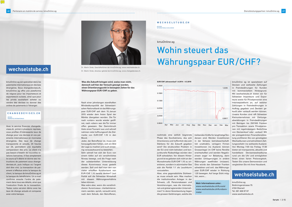 48 Partenaire en matiére de service: kmuOnline ag Dienstleistungspartner: kmuOnline ag 49 W E C H S E L S T U B E .C H DEVISEN INTERNATIONALE ZAHLUNGEN kmuOnline ag Dr. Martin Streb, Geschäftsführer der kmuOnline ag, www.wechselstube.ch. Wohin steuert das Währungspaar EUR / CHF? Dr. Martin Streb, directeur général de kmuOnline ag, www.changedevises.ch. kmuOnline ag est spécialisé dans les paiements internationaux en devises étrangères. Sous changedevises.ch, kmuOnline ag offre une plateforme de négoce pour les importateurs et exportateurs suisses, ainsi que pour les privés souhaitant acheter ou vendre des devises ou donner des ordres de paiements à l’étranger. C H A N G E D E V I S E S .C H DEVISES PAIEMENTES INTERNATIONAUX Avec le service financier changedevises.ch, primé à plusieurs reprises, vous profitez d’intéressants taux de change pour vos devises et vos paiements internationaux en monnaies étrangères. Des taux de change transparents et actuels, 24 heures sur 24, permettent une équitable comparaison des prix. Le client n’a pas besoin d’établir de nouvelles relations bancaires. Il fixe simplement le cours qi’il désire et donne ses instructions de paiement sous changedevises.ch, puis indique où l’argent doit être viré. La transaction de paiement s’effectue entre la banque du client, la banque de kmuOnline ag et la banque du bénéficiaire. Un e-mail confirme ensuite l’ordre de paiement dans tous ses détails, ainsi que l’exécution finale de la transaction. Testez notre ver-sion démo avec les taux de change actuels et comparez avec votre banque. Was die Zukunft bringen wird, weiss man nicht, dennoch soll hier der Versuch gewagt werden, einen Orientierungpunkt in bewegten Zeiten für das Währungspaar EUR / CHF zu geben. EUR/CHF Jahresverlauf 1.4.2014 – 4.3.2015 0.2500 1.2235 0.1900 Nach einer jahrelangen standhaften Mindestkurspolitik der Schweizerischen Nationalbank ist das Währungspaar EUR / CHF seit dem 15. Januar 2015 wieder dem freien Spiel der Märkte übergeben worden. Die Tür nach «unten» wurde wieder geöffnet, nach «oben» war die Tür immer offen gewesen. Der Dammbruch löste einen Tsunami aus und schnell nahmen viele hoffnungsvoll die Zielmarke von EUR / CHF 1.10 in den Mund. Jeder, der Betroffener ist, muss sich herausgefordert fühlen, sich ein Bild der Lage zu machen und auch einwenig vorausschauend zu bewerten. Sehr schnell hat sich der Euro von einem tiefen auf ein versöhnliches Niveau bewegt, und die Frage nach der substantiellen Unterstützung dieses Kursniveaus muss gestellt werden. Soll und darf man den von vielen erhofften Kurshorizont von EUR / CHF 1.10 bereits denken? Laut Politik soll die Schweizer Wirtschaft mit diesem Währungsverhältnis leben können. Was wäre aber, wenn die versöhnlicheren Kursniveaus «herbeiinterveniert» werden, sprich, versucht wird, nach dem Schock, den Betroffenen, 0.1300 0.0700 0.0100 0.9817 0.9500 Apr Mai Jun Jul Aug nochmals eine zeitlich begrenzte Phase des Durchatmens, des sich Orientierens und hoffentlich des sich Stärkens für die Zukunft gegeben wird? Die strukturellen Problem in der EU sind nicht behoben und konjunkturelle Rückschläge würden den EUR schwächen. Vor diesem Hintergrund ist es geboten sich nicht an der Wunschmarke EUR / CHF 1.10 zu orientieren, sondern in stürmischer See sich die Parität 1:1 als Leuchtturm vorzustellen. Aber, eine gegensätzliche Sichtweise muss erlaubt sein. Was machen die institutionellen Anleger in der Schweiz, z.B. Pensionskassen und Versicherungen, was die international und global agierenden Unternehmen? In deren Verantwortung liegen die grossen Geldmengen, welche die Sep Okt Nov Dez Jan Feb Mar treibenden Kräfte für langfristigeTendenzen sind. Werden Investitionen in der Schweiz betriebswirtschaftlich unattraktiv, verlagern Firmen Investitionen ins Ausland; können Grossanleger im CHF keine Rendite erwirtschaften und werden Negativzinsen sogar zur Belastung, dann werden Umlagerungen in andere Währungen stattfinden (müssen). Dies würde den Schweizer Franken schwächen und evtl. das Währungspaar EUR / CHF wieder in Richtung 1.20 bewegen. Auf lange Sicht möglich, wenn… Mehr Informationen unter: www.wechselstube.ch/Kursziel www.wechselstube.ch/Kursbarometer kmuOnline ag ist spezialisiert auf Devisen und weltweite Zahlungen in Fremdwährungen für Kunden mit kommerziellem Hintergrund. Mit wechselstube.ch bieten wir für Schweizer Importeure und Exporteure sowie für Privatpersonen eine Internetplattform an, auf welcher Zahlungen in Fremdwährungen in Auftrag gegeben und Devisen gekauft oder verkauft werden können. Unsere Kunden sind idR Schweizer Kleinunternehmen mit Zahlungsabwicklungen in Fremdwährungen mit Beträgen bis 250’000 Franken pro Transaktion sowie Privatpersonen mit regelmässigem Bedürfniss von Devisenkauf oder -verkauf. Mit der preisgekrönten Finanzdienstleistung profitieren Sie von günstigsten Wechselkursen und schnellstem Zahlungsverkehr ins weltweite Ausland. Von Montag 7:00 bis Freitag 17:30 bieten wir transparente, aktuelle und handelbare Devisenwechselkurse rund um die Uhr und ermöglichen Ihnen einen fairen Preisvergleich. Testen Sie unsere Demoversion und vergleichen Sie mit ihrer Hausbank. kmuOnline ag Bottmingerstrasse 75 4104 Oberwil Tel. 061 406 97 97 www.wechselstube.ch forum I 2-15