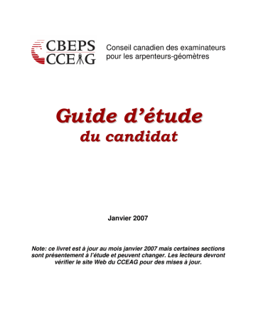 Conseil canadien des examinateurs pour les arpenteurs-géomètres Guide d’étude du candidat Janvier 2007 Note: ce livret est à jour au mois janvier 2007 mais certaines sections sont présentement à l’étude et peuvent changer. Les lecteurs devront vérifier le site Web du CCEAG pour des mises à jour. SYLLABUS DES EXAMENS DU CCEAG ANNEXE I Article 1 : Mathématiques Article 2 : Estimation des moindres carrés et analyse des données Article 3 : Techniques avancées d'arpentage (y compris l'astronomie d’arpentage) Article 4 : Télédétection et photogrammétrie appliquée Article 5 : Systèmes de gestion de bases de données spatiales (informatique) Article 6 : Projections cartographiques et cartographie Article 7 : Études cadastrales ANNEXE II Article 1 : Positionnement géodésique Article 2 : Arpentage hydrographique et Océanographie Article 3 : Droit de l'arpentage Article 4 : Aménagement foncier et aménagement de l'environnement Article 5 : Systèmes d'information sur les terres et gestion Article 6 : Les affaires : droit, administration et économie 1 Annexe I - Article 1 Mathématiques Fonctions, continuité et limites, dérivation et applications, intégration et applications, intégration numérique, courbes planes, tangence et courbure, suites et séries, développement de séries, dérivation partielle, intégrales multiples et approximations numériques, opérations vectorielles et géométrie analytique, équations différentielles linéaires de premier et deuxième ordres et solutions, introduction à l'algèbre matricielle, équations linéaires et transformations, espaces vectoriels et géométrie vectorielle, formes quadratiques. Manuels: a. Advanced Engineering Mathematics, Kreyszig, E. (1992) John Wiley & Sons, Toronto, 8e édition ISBN 0-471-55380-8 b. Calculus with Analytical Geometry, 5th Edition, Edwards, C.H. and Penney, D.E. (1998) Prentice Hall Inc. ISBN 0-13-300575-5 Ouvrages à consulter: a. Single-Variable Calculus, Stewart J., 4th Edition (1999) Brooks/Cole Publishing Co., Pacific Grove, CA. ISBN 0-534-35562-5 b. Calculus of a Single Variable, Early Transcendental Functions, Larson, R., Hostetler, R.P., Edwards, B.H. and Heyd, D.E., 2e édition (1999), Houghton Mifflin Co., Boston ISBN 0-395-93321-8 c. Introduction to Applied Mathematics, Strang, G. (1986) Wellesley-Cambridge Press ISBN 0-961-40880-4 Note : l’utilisation de calculatrices programmables est autorisée dans cet examen Annexe I - Article 2 Estimation des moindres carrés et analyse des données Modélisation mathématique; propagation des erreurs et linéarisation, notion de compensations, compensations par la méthode des moindres carrés, propagation variance-covariance, préanalyse de mesures de levés, distributions normale, chi-carré, de Student (t) et F, intervalles de confiance, tests statistiques d'estimations, de résidus et de variances, ellipses et ellipsoïdes d'erreur, compensation générale par la méthode des moindres carrés, conditions et cas combinés, contraintes, techniques de compensations séquentielles, application de la méthode des moindres carrés aux coordonnées planes et curvilinéaires, conception de réseau, tests et analyses statistiques de quantités estimées, de résidus et de variances, détection des erreurs, introduction à la prédiction et au filtrage par la méthode des moindres carrés. Manuels: a. Analysis and Adjustment of Survey Measurements, Mikhail, E.M. et Gracie, G. (1981), réimpressions disponibles au département de génie géomatique de l’Université de Calgary, Calgary, Alberta, (15,00$) b. Observations and Least-Squares, Mikhail, E.M. (1976) IEP-A Dun Donnelley Publisher, New York. Réimpressions disponibles au département de génie géomatique de l’Université de Calgary, Calgary, Alberta, (30,00$) c. Adjustment Computations : Statistics and Least Squares in Surveying and GIS, Wolf, P.R. and Ghilani, C.D., (199?), John Wiley and Sons, Toronto ISBN 0-471-16833-5 Ouvrages à consulter: a. Geodesy: The Concepts, Part III (Methodology), 2e édition (disponible en format de poche), 1986, Vanicek, P. et Krakiwsky, E.J., North Holland, New York. ISBN 0-444-87775-4 ISBN 0-444-87777-0 b. Statistical and Data Analysis in Geology, Davis, J.C., (1986), 2e édition, John Wiley & Sons, Toronto ISBN 0-471-08079-9 Note : l’utilisation de calculatrices programmables est autorisée dans cet examen Annexe I - Article 3 Techniques avancées d'arpentage (y compris l'astronomie d’arpentage) Canevas planimétrique et altimétrique de précision; pré-analyse et organisation des levés; analyse des erreurs dans les données et les techniques résultantes; application des principes et techniques optiques et électromagnétiques de mesure; étalonnage des appareils d'arpentage; utilisation des appareils d'arpentage; levés d'ingénierie, y compris les levés de déformation. La sphère céleste et ses systèmes de coordonnées; altitude et azimut; déclinaison, angle horaire, ascension droite; latitudes et longitudes célestes; temps sidéral, temps solaire vrai, temps universel; équation du temps; détermination de l'azimut; emploi des éphémérides, des almanachs et des catalogues d'étoiles. Manuels: a. Surveying: Theory and Practice, Anderson, J.M. and Mikhail, E.M. 7e édition, (1998) McGraw-Hill, New York, 1981 ISBN 0-070-15914-9 b. Chapitre 33 (“Modern Surveying Techniques for Mining and Civil Engineering.” par A.Chrzanowski) dans J.A. Hudson [edit] Comprehensive Rock Engineering, v.3 Rock Testing and Site Characterization. 1993, Pergammon Press, ISBN 0-08-042066-4 c. Chapitre 16 (“Engineering and Mining Surveys.” par A. Chrzanowski) dans G. McGrath and L.M. Sebert [edit] Mapping a Northern Land, 1947 -1994. 1999, McGill-Queen’s University Press, ISBN 0-7735-1689-1 d. Chapitre 20 (“Mining Surveys” par A. Chrzanowski et A.J. Robinson) dans Davis, R.E., Foote, F.S., Anderson, J.M., et Mikhail, E.M. Surveying: Theory and