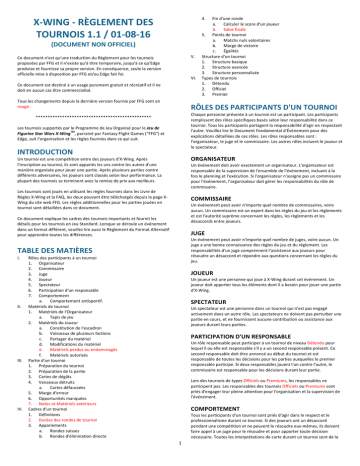 4. X-WING-RÈGLEMENTDES TOURNOIS1.1/01-08-16 (DOCUMENTNONOFFICIEL) Find'uneronde a. Calculerlescored'unjoueur b. Salvefinale 5. Pointsdetournoi a. Matchsnulsvolontaires b. Margedevictoire c. Égalités Structured'untournoi 1. Structurebasique 2. Structureavancée 3. Structurepersonnalisée Typesdetournois 1. Détendu 2. Officiel 3. Premier Cedocumentn'estqu'unetraductionduRèglementpourlestournois proposéesparFFGetiln'existequ'àtitretemporaire,jusqu'àcequ'Edge produiseetfournissesapropreversion.Enconséquence,seulelaversion officiellemiseàdispositionparFFGet/ouEdgefaitfoi. Cedocumentestdestinéàunusagepurementgratuitetrécréatifetilne doitenaucuncasêtrecommercialisé. TousleschangementsdepuisladernièreversionfournieparFFGsonten rouge. ************************************************ LestournoissupportésparleProgrammedeJeuOrganisépourleJeude TM FigurineStarWarsX-Wing ,parrainéparFantasyFlightGames("FFG")et Edge,suitl’organisationetlesrèglesfourniesdanscequisuit. V. Untournoiestunecompétitionentredesjoueursd'X-Wing.Après l'inscriptionautournoi,ilssontappariéslesunscontrelesautresd'une manièreorganiséepourjouerunepartie.Aprèsplusieurspartiescontre différentsadversaires,lesjoueurssontclassésselonleurperformance.La plupartdestournoisseterminentaveclaremisedeprixauxmeilleurs. LestournoissontjouésenutilisantlesrèglesfourniesdanslesLivrede RèglesX-WingetlaFAQ,lesdeuxpouvantêtretéléchargésdepuislapageXWingdusitewebFFG.Lesrèglesadditionnellespourlespartiesjouéesen tournoisontdétailléesdanscedocument. Cedocumentexpliquelescadresdestournoisimportantsetfournitles détailspourlestournoisenJeuStandard.Lorsquesedérouleunévénement dansunformatdifférent,veuillezlireaussileRèglementduFormatAlternatif pourapprendretouteslesdifférences. ORGANISATEUR VI. RÔLESDESPARTICIPANTSD'UNTOURNOI Chaquepersonneprésenteàuntournoiestunparticipant.Lesparticipants remplissentdesrôlesspécifiquesbasésselonleurresponsabilitédansce tournoi.Touslesparticipantspartagentlaresponsabilitéd'agirenrespectant l'autre.VeuillezlireleDocumentFondamentald'Évènementpourdes explicationsdétailléesdecesrôles.Lesrôlesresponsablessont: l'organisateur,lejugeetlecommissaire.Lesautresrôlesincluentlejoueuret lespectateur. INTRODUCTION Unévénementdoitavoirexactementunorganisateur.L'organisateurest responsabledelasupervisiondel'ensembledel'événement,incluantàla foisleplanningetl'exécution.Sil'organisateurn'assignepasuncommissaire pourl'événement,l'organisateurdoitgérerlesresponsabilitésdurôlede commissaire. COMMISSAIRE Unévénementpeutavoirn'importequelnombredecommissaires,voire aucun.Uncommissaireestunexpertdanslesrèglesdujeuetlesrèglements etestl'autoritésuprêmeconcernantlesrègles,lesrèglementsetles désaccordsentrejoueurs. JUGE Unévénementpeutavoirn'importequelnombredejuges,voireaucun.Un jugeaunebonneconnaissancedesrèglesdujeuetdurèglement.Les responsabilitésd'unjugecomprennentl'assistanceauxjoueurspour résoudreundésaccordetrépondreauxquestionsconcernantlesrèglesdu jeu. TABLEDESMATIÈRES I. II. III. IV. Rôlesdesparticipantsàuntournoi 1. Organisateur 2. Commissaire 3. Juge 4. Joueur 5. Spectateur 6. Participationd'unresponsable 7. Comportement a. Comportementantisportif. Matérielsdetournoi 1. Matérielsdel'Organisateur a. Tapisdejeu 2. MatérielsduJoueur a. Constitutiondel'escadron b. Vaisseauxdeplusieursfactions c. Partagerdumatériel d. Modificationsdumatériel e. Matérielsperdusouendommagés f. Matérielsautorisés Partied'untournoi 1. Préparationdutournoi 2. Préparationdelapartie 3. Cartesdedégâts 4. Vaisseauxdétruits a. Cartesdéfaussées 5. Marged'erreur 6. Opportunitésmanquées 7. NotesetMatérielsextérieurs Cadresd'untournoi 1. Définitions 2. Duréesdesrondesdetournoi 3. Appariements a. Rondessuisses b. Rondesd'éliminationdirecte JOUEUR UnjoueurestunepersonnequijoueàX-Wingdurantcetévénement.Un joueurdoitapportertouslesélémentsdontilabesoinpourjouerunepartie d'X-Wing. SPECTATEUR Unspectateurestunepersonnedansuntournoiquin'estpasengagé activementdansunautrerôle.Lesspectateursnedoiventpasperturberune partieencours,etnefournissentaucunecontributionouassistanceaux joueursdurantleursparties. PARTICIPATIOND'UNRESPONSABLE UnrôleresponsablepeutparticiperàuntournoideniveauDétendupour lequelilouelleestresponsables'ilyaunsecondresponsableprésent.Ce secondresponsabledoitêtreannoncéaudébutdutournoietest responsabledetouteslesdécisionspourlespartiesauxquelleslepremier responsableparticipe.Sideuxresponsablesjouentl'uncontrel'autre,le commissaireestresponsablepourlesdécisionsdurantleurpartie. LorsdestournoisdetypesOfficielsouPremiums,lesresponsablesne participentpas.LesresponsablesdestournoisOfficielsouPremiumssont priésd'engagerleurpleineattentionpourl'organisationetlasupervisionde l'événement. COMPORTEMENT Touslesparticipantsd'untournoisontpriésd'agirdanslerespectetle professionnalismedurantcetournoi.Sidesjoueursontundésaccord pendantunecompétitionetnepeuventlerésoudreeux-mêmes,ilsdoivent faireappelàunjugepourlerésoudreetpourapportertoutedécision nécessaire.Touteslesinterprétationsdecartedurantuntournoisontdela 1 responsabilitéducommissaire,etilouellepeutcontredirelaFAQquandune fauteouuneerreurestdécouverte. troisobstaclesparmilesdouzeastéroïdesfournisdanslesdeuxboîtesde baseetlessixnuagesdedébrisfournisdanslesextensionsYT-2400etVT-49 Décimateur.Unjoueurnepeutpassélectionnerdeuxexemplairesdumême AstéroïdeouNuagededébris. Lesjoueursdoiventutiliserlemêmeescadron,lemêmepaquetdecartesde Dégâtsetlesmêmesobstaclespourtouteladuréedutournoi. Certainstournoisréclamentdesjoueursdesoumettreunelisted'escadron, incluanttouteslescartesd'Améliorationassociées,letotaldespoints d'escadronetlesobstaclesàl'organisateuravantledébutdutournoi. COMPORTEMENTANTISPORTIF Lesjoueurssontpriésdesecomporterdemanièremûreetréfléchie,etde jouerenrespectantlesrèglesetnond'enabuser.Ceciinterditdegagnerdu tempspendantunepartie,deplacerlematé