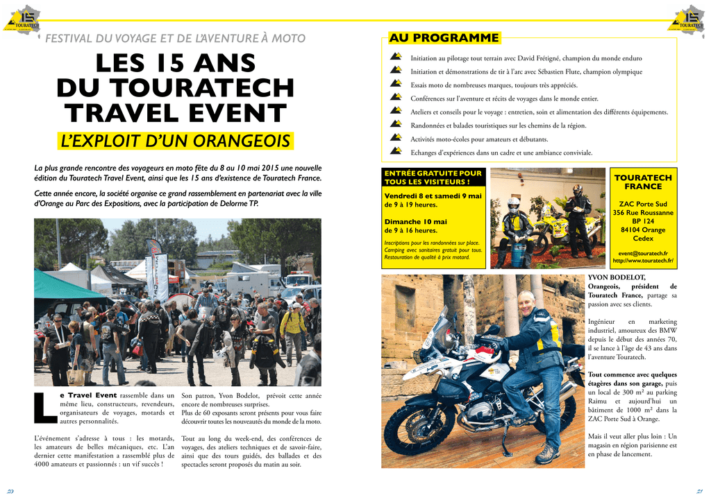 FESTIVAL DU VOYAGE ET DE L’AVENTURE À MOTO LES 15 ANS DU TOURATECH TRAVEL EVENT L’EXPLOIT D’UN ORANGEOIS La plus grande rencontre des voyageurs en moto fête du 8 au 10 mai 2015 une nouvelle édition du Touratech Travel Event, ainsi que les 15 ans d’existence de Touratech France. Cette année encore, la société organise ce grand rassemblement en partenariat avec la ville d’Orange au Parc des Expositions, avec la participation de Delorme TP. AU PROGRAMME Initiation au pilotage tout terrain avec David Frétigné, champion du monde enduro Initiation et démonstrations de tir à l’arc avec Sébastien Flute, champion olympique Essais moto de nombreuses marques, toujours très appréciés. Conférences sur l’aventure et récits de voyages dans le monde entier. Ateliers et conseils pour le voyage : entretien, soin et alimentation des différents équipements. Randonnées et balades touristiques sur les chemins de la région. Activités moto-écoles pour amateurs et débutants. Echanges d’expériences dans un cadre et une ambiance conviviale. ENTRÉE GRATUITE POUR TOUS LES VISITEURS ! Vendredi 8 et samedi 9 mai de 9 à 19 heures. Dimanche 10 mai de 9 à 16 heures. Inscriptions pour les randonnées sur place. Camping avec sanitaires gratuit pour tous. Restauration de qualité à prix motard. TOURATECH FRANCE ZAC Porte Sud 356 Rue Roussanne BP 124 84104 Orange Cedex [email protected] http://www.touratech.fr/ YVON BODELOT, Orangeois, président de Touratech France, partage sa passion avec ses clients. Ingénieur en marketing industriel, amoureux des BMW depuis le début des années 70, il se lance à l'âge de 43 ans dans l’aventure Touratech. L 20 e Travel Event rassemble dans un même lieu, constructeurs, revendeurs, organisateurs de voyages, motards et autres personnalités. Son patron, Yvon Bodelot, prévoit cette année encore de nombreuses surprises. Plus de 60 exposants seront présents pour vous faire découvrir toutes les nouveautés du monde de la moto. L’événement s’adresse à tous : les motards, les amateurs de belles mécaniques, etc. L’an dernier cette manifestation a rassemblé plus de 4000 amateurs et passionnés : un vif succès ! Tout au long du week-end, des conférences de voyages, des ateliers techniques et de savoir-faire, ainsi que des tours guidés, des ballades et des spectacles seront proposés du matin au soir. Tout commence avec quelques étagères dans son garage, puis un local de 300 m² au parking Raimu et aujourd’hui un bâtiment de 1000 m² dans la ZAC Porte Sud à Orange. Mais il veut aller plus loin : Un magasin en région parisienne est en phase de lancement. 21