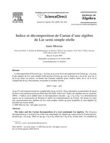 Journal of Algebra 303 (2006) 382–406 www.elsevier.com/locate/jalgebra Indice et décomposition de Cartan d’une algèbre de Lie semi-simple réelle Anne Moreau Université Paris 7, Institut de Mathématiques de Jussieu, Théorie des groupes, Case 7012, 2 Place Jussieu, 75251 Paris Cedex 05, France Reçu le 22 juin 2005 Disponible sur Internet le 18 octobre 2005 Communiqué par J.T. Stafford Résumé La décomposition d’Iwasawa g0 = k0 ⊕ â0 ⊕ n0 issue de la décomposition de Cartan g0 = k0 ⊕ p0 d’une algèbre de Lie semi-simple réelle permet d’écrire g0 sous la forme g0 = k0 ⊕ b0 , avec b0 = â0 ⊕ n0 . Dans cet article, on donne une formule explicite pour l’indice, ind b, de b, où b est le complexifié de b0 . Précisément, on montre le résultat suivant : ind b = rg g − rg k, où g et k sont respectivement les complexifiés de g0 et de k0 . Nous répondons en particulier de façon positive à une question posée par Raïs dans [M. Raïs, Notes sur l’indice des algèbres de Lie, preprint, 2004] : l’indice est-il additif dans la décomposition suivante : g0 = k0 ⊕ b0 ? La démonstration repose sur la construction de Kostant et utilise les transformations de Cayley. On donne en outre une caractérisation des algèbres de Lie semi-simples réelles g0 pour lesquelles la sous-algèbre b0 possède une forme stable. © 2005 Elsevier Inc. All rights reserved. Abstract The index and the Cartan decomposition of a real semisimple Lie algebra. The Iwasawa decomposition g = k0 ⊕ â0 ⊕ n0 of the real semisimple Lie algebra g0 comes from its Cartan decomposition g0 = k0 ⊕ p0 . Then we get g0 = k0 ⊕ b0 where b0 = â0 ⊕ n0 . In this note, we establish an Adresse e-mail : [email protected]. 0021-8693/$ – see front matter © 2005 Elsevier Inc. All rights reserved. doi:10.1016/j.jalgebra.2005.09.016 A. Moreau / Journal of Algebra 303 (2006) 382–406 383 explicite formula for the index, ind b, of b, where b is the complexification of b0 . More precisely, we show the following result: ind b = rg g − rg k, where g and k are respectively the complexifications of g0 and k0 . In particular, this answers positively a question by Raïs in [M. Raïs, Notes sur l’indice des algèbres de Lie, preprint, 2004]: is the index additive for the following decomposition: g0 = k0 ⊕ b0 ? In the proof, we use the Kostant construction and the Cayley transforms. We also give a characterization of the semisimple real Lie algebra g0 whose subalgebra b0 has a stable form. © 2005 Elsevier Inc. All rights reserved. Introduction Soit g0 une algèbre de Lie semi-simple réelle et soit g0 = k0 ⊕ p0 une décomposition de Cartan de g0 . On note θ l’involution de Cartan correspondante. Soit â0 un sous-espace abélien maximal de p0 . Pour λ dans â∗0 , on pose gλ0 = X ∈ g0 | [H, X] = λ(H )X ∀H ∈ â0 . L’ensemble Σ constitué des formes lineaires non nulles λ sur â0 pour lesquelles le sousespace gλ0 est non nul est un système de racines dans â∗0 . Soit Σ+ un système de racines positives de Σ. On pose n0 = gλ0 , λ∈Σ + de sorte qu’on obtient la décomposition d’Iwasawa de g0 suivante : g0 = k0 ⊕ â0 ⊕ n0 . En posant b0 = â0 ⊕ n0 , on obtient la décomposition : g0 = k 0 ⊕ b0 . Dans tout ce qui suit, on note sans l’indice 0 les complexifiés des algèbres de Lie réelles notées, elles, avec un indice 0. Ainsi, g = (g0 )C , k = (k0 )C , â = (â0 )C , n = (n0 )C , b = (b0 )C , etc. L’indice d’une algèbre de Lie q, noté ind q, est la codimension minimale de ses orbites coadjointes. Si q est le complexifié d’une algèbre de Lie réelle q0 , alors on a : ind q = ind q0 . Le but de cet article est de donner une formule explicite pour l’indice de b. Précisément, on montre la relation suivante : ind b = rg g − rg k. (1) 384 A. Moreau / Journal of Algebra 303 (2006) 382–406 Dans [6], Raïs s’intéresse à des exemples d’additivité de l’indice. En particulier, à propos de la décomposition g0 = k0 ⊕ b0 , il se demande si la relation ind g0 = ind k0 + ind b0 (2) a lieu. Puisque les algèbres de Lie g et k sont réductives, leur indice est égal à leur rang. Ainsi, la relation (2) est satisfaite si, et seulement si, la relation (1) est satisfaite. On répond ici de façon positive à sa question. On donne dans la première partie des précisions concernant la structure de g0 . On rappelle dans la deuxième partie la construction « en cascade » de Kostant. Cette construction intervient dans [4] pour la recherche de formes linéaires stables dans une sous-algèbre de Borel d’une algèbre de Lie semi-simple complexe. Notons qu’ici b n’est pas en général une sous-algèbre de Borel de g. La troisième partie utilise les transformations de Cayley pour établir une formule qui intervient dans la suite. On prouve dans la partie 4 les relations (1) et (2). La construction de Kostant intervient dans la démonstration pour définir une forme régulière sur b et pour définir une forme stable sur une certaine sous-algèbre de Borel de g qui contient b. Parmi les algèbres de Lie réelles semi-simples g0 , on caractérise de plus dans cette partie, celles pour lesquelles la sous-algèbre b possède une forme stable. La dernière partie repose sur la classification des algèbres de Lie simples réelles. Pour chaque type d’algèbres de Lie simples réelles, on calcule explicitement l’indice de b et on précise si la sous-algèbre b possède ou non une forme stable. 1. Quelques précisions sur la structure de g0 On regroupe dans cette partie quelques résultats concernant la structure de g0 . On trouve les preuves de ces résultats dans [2,3]. Soit h0 une sous-algèbre de Cartan de g0 , stable par θ . Puisque h0 est stable, elle s’écrit sous la forme h0 = a0 ⊕ t0 , avec a0 dans p0 et t0 dans k0 . La sous-algèbre h est une sous-algèbre de Cartan de g et on note Δ le système de racines associé au couple (g, h). Les él