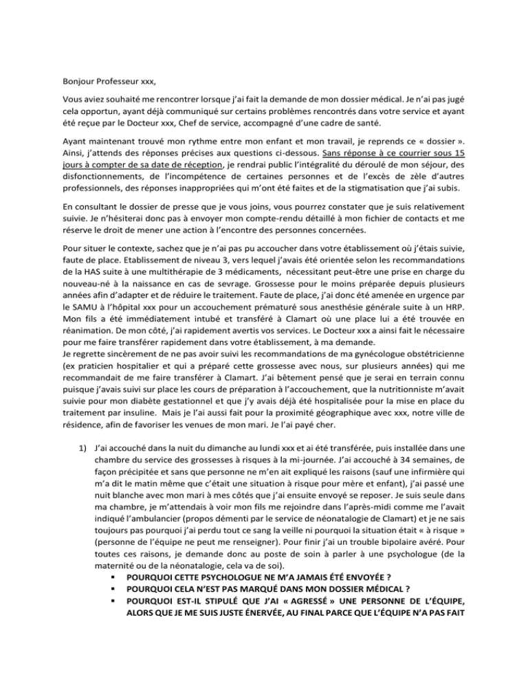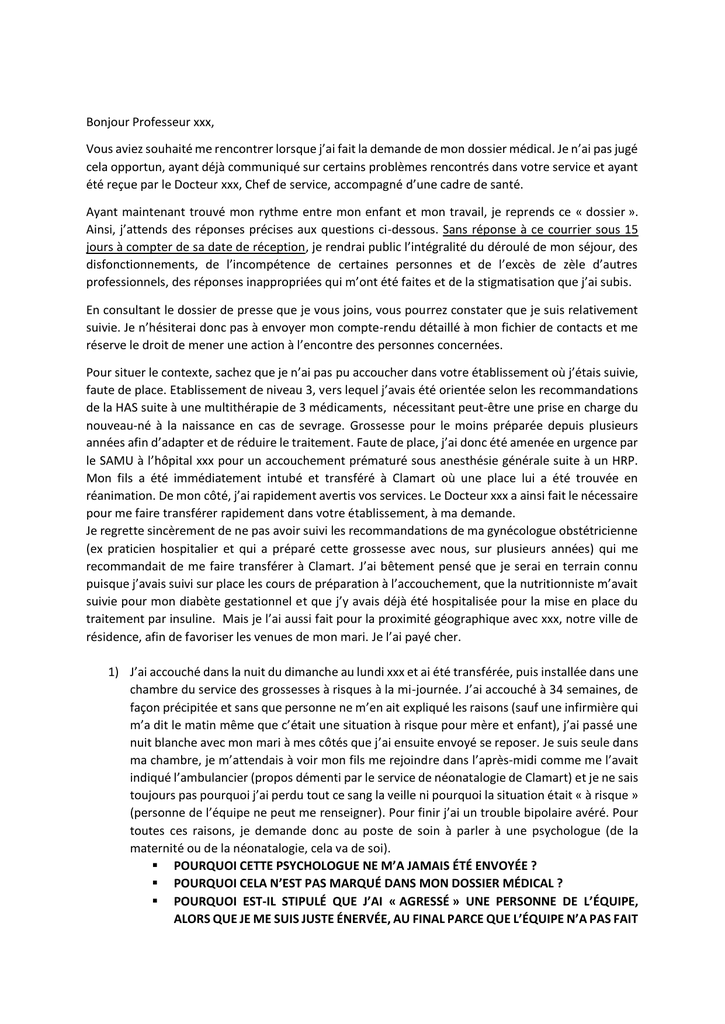Bonjour Professeur xxx, Vous aviez souhaité me rencontrer lorsque j’ai fait la demande de mon dossier médical. Je n’ai pas jugé cela opportun, ayant déjà communiqué sur certains problèmes rencontrés dans votre service et ayant été reçue par le Docteur xxx, Chef de service, accompagné d’une cadre de santé. Ayant maintenant trouvé mon rythme entre mon enfant et mon travail, je reprends ce « dossier ». Ainsi, j’attends des réponses précises aux questions ci-dessous. Sans réponse à ce courrier sous 15 jours à compter de sa date de réception, je rendrai public l’intégralité du déroulé de mon séjour, des disfonctionnements, de l’incompétence de certaines personnes et de l’excès de zèle d’autres professionnels, des réponses inappropriées qui m’ont été faites et de la stigmatisation que j’ai subis. En consultant le dossier de presse que je vous joins, vous pourrez constater que je suis relativement suivie. Je n’hésiterai donc pas à envoyer mon compte-rendu détaillé à mon fichier de contacts et me réserve le droit de mener une action à l’encontre des personnes concernées. Pour situer le contexte, sachez que je n’ai pas pu accoucher dans votre établissement où j’étais suivie, faute de place. Etablissement de niveau 3, vers lequel j’avais été orientée selon les recommandations de la HAS suite à une multithérapie de 3 médicaments, nécessitant peut-être une prise en charge du nouveau-né à la naissance en cas de sevrage. Grossesse pour le moins préparée depuis plusieurs années afin d’adapter et de réduire le traitement. Faute de place, j’ai donc été amenée en urgence par le SAMU à l’hôpital xxx pour un accouchement prématuré sous anesthésie générale suite à un HRP. Mon fils a été immédiatement intubé et transféré à Clamart où une place lui a été trouvée en réanimation. De mon côté, j’ai rapidement avertis vos services. Le Docteur xxx a ainsi fait le nécessaire pour me faire transférer rapidement dans votre établissement, à ma demande. Je regrette sincèrement de ne pas avoir suivi les recommandations de ma gynécologue obstétricienne (ex praticien hospitalier et qui a préparé cette grossesse avec nous, sur plusieurs années) qui me recommandait de me faire transférer à Clamart. J’ai bêtement pensé que je serai en terrain connu puisque j’avais suivi sur place les cours de préparation à l’accouchement, que la nutritionniste m’avait suivie pour mon diabète gestationnel et que j’y avais déjà été hospitalisée pour la mise en place du traitement par insuline. Mais je l’ai aussi fait pour la proximité géographique avec xxx, notre ville de résidence, afin de favoriser les venues de mon mari. Je l’ai payé cher. 1) J’ai accouché dans la nuit du dimanche au lundi xxx et ai été transférée, puis installée dans une chambre du service des grossesses à risques à la mi-journée. J’ai accouché à 34 semaines, de façon précipitée et sans que personne ne m’en ait expliqué les raisons (sauf une infirmière qui m’a dit le matin même que c’était une situation à risque pour mère et enfant), j’ai passé une nuit blanche avec mon mari à mes côtés que j’ai ensuite envoyé se reposer. Je suis seule dans ma chambre, je m’attendais à voir mon fils me rejoindre dans l’après-midi comme me l’avait indiqué l’ambulancier (propos démenti par le service de néonatalogie de Clamart) et je ne sais toujours pas pourquoi j’ai perdu tout ce sang la veille ni pourquoi la situation était « à risque » (personne de l’équipe ne peut me renseigner). Pour finir j’ai un trouble bipolaire avéré. Pour toutes ces raisons, je demande donc au poste de soin à parler à une psychologue (de la maternité ou de la néonatalogie, cela va de soi). POURQUOI CETTE PSYCHOLOGUE NE M’A JAMAIS ÉTÉ ENVOYÉE ? POURQUOI CELA N’EST PAS MARQUÉ DANS MON DOSSIER MÉDICAL ? POURQUOI EST-IL STIPULÉ QUE J’AI « AGRESSÉ » UNE PERSONNE DE L’ÉQUIPE, ALORS QUE JE ME SUIS JUSTE ÉNERVÉE, AU FINAL PARCE QUE L’ÉQUIPE N’A PAS FAIT SON TRAVAIL ? Enervement prévisible et raison pour laquelle j’avais demandé une psychologue. 2) Le lendemain : POURQUOI M’AVOIR ENVOYÉE LE LENDEMAIN UNE PSYCHIATRE SANS QUE PERSONNE NE M’AIT INDIQUÉ EN AMONT QUE CE RENDEZ-VOUS ÉTAIT OBLIGATOIRE ET PRÉVU DE LONGUE DATE POUR VÉRIFIER L’ETAT DE MES HUMEURS, MÊME SI JE NE DÉCOMPENSAIT PAS ? POURQUOI M’AVOIR ENVOYÉE CETTE PSYCHIATRE QUI AVAIT ÉTÉ SORTIE DE MON SUIVIE SUITE A UN CONTACT PRÉALABLE INSATISFAISANT ? Alors même que le Docteur xxx s’était rapproché du Professeur-psychiatre xxx pour assurer conjointement la période périnatale, comme cela m’avait été confirmé par email ? La conséquence de cela est que j’ai cru (à tort ?) que cette psychiatre remplaçait la psychologue que j’avais demandé du fait de ma pathologie et m’était imposée du fait du différent le jour précédent. Je me suis donc contrainte à accepter ses venues dans ma chambre. AU FINAL, POURQUOI AI-JE DU ACCEPTER UNE PSYCHOLOGUE D’UN SERVICE PSYCHIATRIQUE ??? Sans une once de baby-blues, encore moins une quelconque décompensation et avec une humeur parfaitement stable (comme peu le confirmer le Professeur xxx avec qui je me suis entretenue par téléphone pour lui expliquer les conditions de l’accouchement). COMMENT SE FAIT-IL QU’UNE PSYCHIATRE A PU RETIRER TOUT MON TRAITEMENT PERSONNEL DE MA CHAMBRE, EN PRÉTEXTANT QUE LA LOI L’Y OBLIGEAIT, CE QUI EST FAUX ? Alors même que je l’interpelle en disant que la plaquette affichée au mur mentionne seulement l’obligation de déclarer, non de le remettre. Ce qui me sera confirmé. COMMENT SE FAIT-IL QUE CETTE MEME PSYCHIATRE, APRES AVOIR MENTI A UN PATIENT, SE PERMET DE MENTIR DANS SON RAPPORT, SUR MON DOSSIER MEDICAL, EN PRÉTEXTANT QU’ELLE A PROPOSÉ DE LE RETIRER ET QUE J’AI ACCEPTÉ ? POURQUOI LES