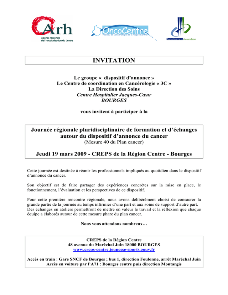 INVITATION Le groupe « dispositif d’annonce » Le Centre de coordination en Cancérologie « 3C » La Direction des Soins Centre Hospitalier Jacques-Cœur BOURGES vous invitent à participer à la Journée régionale pluridisciplinaire de formation et d’échanges autour du dispositif d’annonce du cancer (Mesure 40 du Plan cancer) Jeudi 19 mars 2009 - CREPS de la Région Centre - Bourges Cette journée est destinée à réunir les professionnels impliqués au quotidien dans le dispositif d’annonce du cancer. Son objectif est de faire partager des expériences concrètes sur la mise en place, le fonctionnement, l’évaluation et les perspectives de ce dispositif. Pour cette première rencontre régionale, nous avons délibérément choisi de consacrer la grande partie de la journée au temps infirmier d’une part et aux soins de support d’autre part. Des échanges en ateliers permettront de mettre en valeur le travail et la réflexion que chaque équipe a élaborés autour de cette mesure phare du plan cancer. Nous vous attendons nombreux… CREPS de la Région Centre 48 avenue du Maréchal Juin 18000 BOURGES www.creps-centre.jeunesse-sports.gouv.fr Accès en train : Gare SNCF de Bourges ; bus 1, direction Foulonne, arrêt Maréchal Juin Accès en voiture par l’A71 : Bourges centre puis direction Montargis Journée régionale pluridisciplinaire de formation et d’échanges autour du dispositif d’annonce du cancer JEUDI 19 mars 2009 CREPS de la Région Centre 48 avenue du Maréchal Juin 18000 BOURGES 9h : Accueil des participants MATIN - Séance plénière Modérateur : Dr Abdallah MAAKAROUN – Hématologue – CH Bourges 9h30 : Intervention de l’ARH et de la Direction du Centre Hospitalier de Bourges. Déploiement et état des lieux en Région Centre Dr Patrick HEITZMANN – Réseau OncoCentre Bénéfices et limites du dispositif d’annonce Dr Olivier ARSENE – Oncologue – CH Blois Pause café et visite des stands La consultation infirmière au CH de Bourges Film et discussion Annonce du cancer et traumatisme psychologique Mmes Yannick LASNIER et Catherine MAUPETIT Onco-psychologues – CH Bourges 9h45 : 10h : 11h : 11h15 : 11h50 : 12h30 - 14h : REPAS APRES-MIDI Modérateur : Mme MAUPETIT – Oncopsychologue – CH Bourges 14h : Echanges en ateliers Choisir un atelier du groupe A et un atelier du groupe B Groupe A : 14h à 14h45 • Infirmière du dispositif d’annonce : référente du patient ? • Souffrance et soutien des soignants impliqués dans le dispositif d’annonce • Impliquer les soins de support dès l’annonce du cancer • L’enfant proche d’un malade : information et soutien psychologique Groupe B : 15h à 15h45 • L’annonce du cancer en urgence • Proches, entourage et personne de confiance. • Dispositif d’annonce et communication dans l’équipe soignante. • L’infirmière dédiée au dispositif d’annonce : intérêts et limites 15h45 : Restitution en séance plénière 16h30 : Clôture autour d’un goûter. Journée régionale pluridisciplinaire de formation et d’échanges autour du dispositif d’annonce du cancer Jeudi 19 mars 2009 - CREPS de la Région Centre - Bourges BULLETIN D’INSCRIPTION A RETOURNER AVANT LE 28 FEVRIER 2009 Sans frais de participation – Pauses café et déjeuner offerts Aucune confirmation d’inscription ne sera envoyée Courrier : Secrétariat Oncologie – Centre Hospitalier Jacques Cœur 18020 BOURGES cedex Fax : 02 48 48 48 16 Email : [email protected] Informations : 02 48 48 59 42 Mme Mlle M NOM : Prénom : Fonction Adresse professionnelle Téléphone Participera à la journée du 19 mars 2009 matin après-midi Sera présent au repas de midi oui non Souhaite un certificat de présence oui non Echanges en ateliers : merci de choisir un atelier dans chaque groupe Groupe A : o Infirmière du dispositif d’annonce : référente du patient ? o Souffrance et soutien des soignants impliqués dans le dispositif d’annonce o Impliquer les soins de support dès l’annonce du cancer o L’enfant proche d’un malade : information et soutien psychologique Groupe B : o L’annonce du cancer en urgence o Proches, entourage et personne de confiance. o Dispositif d’annonce et communication dans l’équipe soignante. o L’infirmière dédiée au dispositif d’annonce : intérêts et limites Les organisateurs seront amenés à supprimer un atelier en cas d’inscriptions insuffisantes. Merci pour votre compréhension.