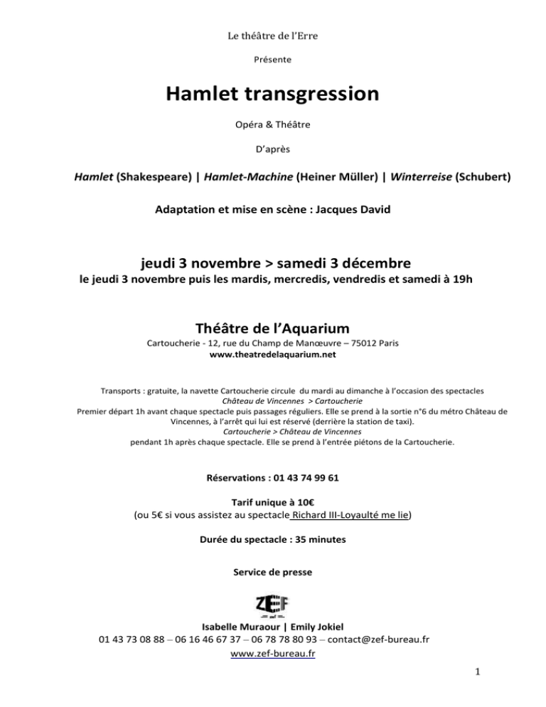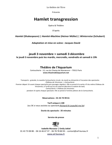 Le théâtre de l’Erre Présente Hamlet transgression Opéra & Théâtre D’après Hamlet (Shakespeare) | Hamlet-Machine (Heiner Müller) | Winterreise (Schubert) Adaptation et mise en scène : Jacques David jeudi 3 novembre > samedi 3 décembre le jeudi 3 novembre puis les mardis, mercredis, vendredis et samedi à 19h Théâtre de l’Aquarium Cartoucherie - 12, rue du Champ de Manœuvre – 75012 Paris www.theatredelaquarium.net Transports : gratuite, la navette Cartoucherie circule du mardi au dimanche à l’occasion des spectacles Château de Vincennes > Cartoucherie Premier départ 1h avant chaque spectacle puis passages réguliers. Elle se prend à la sortie n°6 du métro Château de Vincennes, à l’arrêt qui lui est réservé (derrière la station de taxi). Cartoucherie > Château de Vincennes pendant 1h après chaque spectacle. Elle se prend à l’entrée piétons de la Cartoucherie. Réservations : 01 43 74 99 61 Tarif unique à 10€ (ou 5€ si vous assistez au spectacle Richard III-Loyaulté me lie) Durée du spectacle : 35 minutes Service de presse Isabelle Muraour | Emily Jokiel 01 43 73 08 88 – 06 16 46 67 37 – 06 78 78 80 93 – [email protected] www.zef-bureau.fr 1 Hamlet transgression Opéra & Théâtre Hamlet (Shakespeare) | Hamlet-Machine (Heiner Müller) | Winterreise (Schubert) Adaptation mise en scène Jacques David Avec : Dominique Jacquet, comédienne Laurence Malherbe, soprano Christophe Séchet, musicien électroacousticien Dramaturge Elise Blaché Scénographie Emmanuelle Debeusscher Costumes Agnès Marillier Création lumière Laurent Nennig Création sonore Christophe Séchet Ingénieur du son Marc Licka Arrangements musicaux du Winterreise par Excursus (Laurence Malherbe, Laurent David Faro, Eric Groleau) Ingénieur du son Avec le soutien d’ARCADI Ile-de-France, de la Ville de Paris, de la SPEDIDAM et en partenariat avec Marcal Productions, remerciements à Lilas en Scène Présentation Un chant, une parole, deux femmes. Avec Hamlet transgression, deux femmes : Laurence Malherbe soprano entourée d’une rythmique rock (ExcursusMusic) réinvente Franz Schubert alors que Dominique Jacquet accompagnée de Heiner Müller et de William Shakespeare, sème sur scène un harmonieux trouble. 2 Note d’intention La pièce de Shakespeare met en scène une vengeance parricide. Hamlet est à la foi victime et coupable. Victime du meurtre de son père par son oncle, et coupable de sa propre vengeance envers cet oncle, qui usurpe le trône, et la couche royale de son père, faisant de sa mère une Tante-mère. Cet acte de vengeance est toujours repoussé, retardé, par des flots de parole, des flots de mots, comme si le danger venait finalement plus du mot que de l’acte. Hamlet cherche inlassablement dans les mots, un possible, une issue, qu’il ne trouvera jamais. Comment « croire », comment donner force de vérité aux mots, aux paroles, d’un spectre sorti de la brume et de la nuit. Alors pour approcher la « vérité », Hamlet fait appel aux professionnels du mot — les Comédiens — . Shakespeare attend du théâtre qu’il parle du présent, quant aux comédiens ils sont pour lui « les abrégés, les brèves chroniques de notre temps » (II, 2, 515). Cette piste m’a semblé être la bonne. Celle des comédiens qui nous montrent notre temps. Pour cela il me fallait un « contre-point » au texte de Shakespeare, pour donner à voir au public le dehors et le dedans de l’être. Hamlet-machine de Heiner Müller et le Voyage d’Hiver (Winterreise) de Schubert se sont imposés à mon regard comme ces « chroniqueurs de notre temps ». J’ai donc porté sur le plateau deux personnages, féminins, qui seraient par leurs mots joués et leurs mots chantés les abrégés de tous les autres personnages de la pièce, mais aussi simple « figures » porteuses de nos émotions, de nos drames quotidiens, de nos vies actuelles. Dominique Jacquet est cette comédienne qui interprétera tour à tour entre les vagues lyriques de Laurence Malherbe, un Hamlet, un Claudius, une Ophélie, mais surtout le « BLABLA » d’un Hamlet-machine qui parle inlassablement au « ressac du rivage », avec dans son dos, « les ruines de l’Europe ». Jacques David 3 Note Dramaturgique Müller - Shakespeare - Schubert Une comédienne (Dominique Jacquet) et une chanteuse lyrique (Laurence Malherbe) usent de leur art et le mettent en question à travers la figure d’Hamlet ; avec elles, Christophe Séchet à la création sonore déploie le jeu des analogies et de la mémoire, à la fois tyrannie des machines et sensualité des méandres du cerveau. Shakespeare est là, bien sûr, mais aussi Müller, Orson Wells, Laurence Olivier et les figures floues et superposables des speakerines, rockeuses et stars de magasines qui hantent notre époque. La pièce Hamlet-Machine de Heiner Müller est comme une ossature qui permet de donner une forme théâtrale à cette performance, éviter l’écueil du récital mais aussi mettre Shakespeare à l’endroit qui nous intéresse : une écoute contemporaine où l’on puisse jouir de sa langue et de sa pensée dans toute sa puissance active. La transgression à l’œuvre est tout à la fois celle de Shakespeare, celle de Müller et la nôtre. Nous nous emparons ainsi de la matière et des outils que nous livre Müller dans sa piècemachine. Laurence Malherbe, dont la rencontre a déterminé l’écriture de ce duo, revisite et réinvente Schubert en notre compagnie prolongeant ainsi un projet musical entamé il y a quelques années (Schubert Transgression, 2013 ; Excursus, 2016). Laurence Malherbe reprend et détourne l’expérience mise en œuvre dans son projet Excursus (sortie printemps 2016 – composition et arrangements : ExcursusMusic) dans lequel elle fait entendre les résonnances qui traversent le romantisme autrichien de ses origines à nos jours, révélant les liens entre le Voyage d’Hiver (Winterreise) de Schubert et 