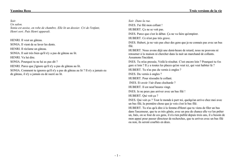 Yasmina Reza Trois versions de la vie Soir. Un salon. Sonia est assise, en robe de chambre. Elle lit un dossier. Cri de l'enfant, Henri sort. Puis Henri apparaît. Soir. Dans la rue. INES. J'ai filé mon collant ! HUBERT. Ça ne se voit pas. INES. Parce que c'est le début. Ça ne va faire qu'empirer. HUBERT. Ce n'est pas très grave. INES. Hubert, je ne vais pas chez des gens que je ne connais pas avec un bas filé. HUBERT. Nous avons déjà une demi-heure de retard, nous ne pouvons ni retourner à la maison ni chercher dans la nuit un marchand de collants. Assumons l'incident. INES. Tu m'as pressée, Voilà le résultat. C'est encore loin ? Pourquoi tu t'es gare si loin ? Il y a toutes les places qu'on veut ici, qui veut habiter là ? HUBERT. Tu n'as pas du vernis à ongles ? INES. Du vernis à ongles ? HUBERT. Pour résoudre le collant. INES. Et avoir 1'air d'une clocharde ? HUBERT. Il est neuf heures vingt. INES. Je ne peux pas arriver avec un bas filé ! HUBERT. Qui voit ça ? INES. Qui voit ça ? Tout le monde à part toi, quelqu'un arrive chez moi avec un bas filé, la première chose que je vois c'est le bas filé. HUBERT. Tu n'as qu'à dire à la femme d'Henri que tu viens de filer un bas dans l'ascenseur, que tu es très gênée, avec un peu de chance elle va t'en prêter un, Inès, on se fout de ces gens, il n'a rien publié depuis trois ans, il a besoin de mon appui pour passer directeur de recherches, que tu arrives avec un bas filé ou non, ils seront courbés en deux. HENRI. Il veut un gâteau. SONIA. Il vient de se laver les dents. HENRI. Il réclame un gâteau. SONIA. Il sait très bien qu'il n'y a pas de gâteau au lit. HENRI. Va lui dire. SONIA. Pourquoi tu ne lui as pas dit ? HENRI. Parce que j'ignore qu'il n'y a pas de gâteau au lit. SONIA. Comment tu ignores qu'il n'y a pas de gâteau au lit ? Il n'y a jamais eu de gâteau, il n'y a jamais eu de sucré au lit. -1- Yasmina Reza Trois versions de la vie L'enfant pleure. Sonia revient. HENRI. Qu'est-ce qu'il a ? SONIA. Il veut un gâteau. HENRI. Pourquoi il pleure ? SONIA. Parce que j'ai dit non. Il devient atrocement capricieux. HENRI (après un léger temps). Donne-lui un quartier de pomme. SONIA. Il ne veut pas un quartier de pomme, il veut un gâteau et de toute façon il n'aura rien. On ne mange pas au lit, on mange à table, on ne mange pas au lit après s'être lave les dents et maintenant je veux examiner ce dossier, j'ai un conseil à dix heures demain matin. On sonne. SONIA (à voix basse). Qui est-ce ? HENRI (idem). Je vais regarder. Il revient aussitôt. Tour ce qui suit, à voix basse : HENRI. Les Finidori ! SONIA. C'est demain ! HENRI. On est le 17... C'est ce soir. SONIA. C'est une catastrophe. HENRI. Oui. SONIA. Ils nous ont entendus ? HENRI. Qu'est-ce qu'on a dit ? SONIA. On ne peut pas ouvrir. HENRI. On ne peut pas ne pas ouvrir. SONIA. Qu'est-ce qu'on fait ? HENRI. Va te... va te recomposer un petit peu. SONIA. On ouvre ? HENRI. Ils savent qu'on est là. SONIA. C'est une catastrophe. HENRI. Il reste quelque chose dans la cuisine ? SONIA. On a tout fini. Pour moi, c'était demain. HENRI. C'était fondamental ce dîner pour moi ! SONIA. Tu m'accuses! HENRI. Va te changer au moins. SONIA. Non. HENRI. Tu ne vas pas recevoir les Finidori en robe de chambre ! SONIA. Si. HENRI (il la pousse vers le fond de l appartement en essayant de ne pas faire de bruit). Va t'habiller, Sonia ! SONIA (elle résiste à sa pression). Non. HENRI (ils luttent en silence). Comment peux-tu être si égoïste ? Nouvelle sonnerie. HENRI. J'ouvre. -2- Yasmina Reza Trois versions de la vie Inès, Hubert, Sonia et Henri dans le salon. Les deux invités picorent divers mets froids (chips, Babybel, boite de Fingers, etc.) posés sur un plateau. Sonia et Henri les accompagnent en buvant. Sonia s'est changée. Inès a conservé son bas filé. INES. Moi aussi je suis très à cheval sur les rituels du coucher. D'abord l'heure, on se couche à huit heures, enfin bon on peut se coucher à huit heures et demie mais enfin disons entre huit heures et huit heures et demie, à huit heures trente quoi qu'il arrive on est au lit, dents ultra-lavées parce que le matin, honnêtement, je trouve ça difficile d'exiger le lavage des dents avant 1'école, je reconnais que c'est un tort, en réalité il faudrait se brosser les dents matin et soir minimum mais bon, je fais 1'impasse sur le matin en revanche ils savent que le soir c'est vraiment à fond et qu'il est hors de question évidemment de manger quoi que ce soit ensuite, Hubert c'est curieux, il est d'accord avec les repères éducatifs, mais d'un autre côté il va les exciter en entamant une partie de foot avec eux, dans la chambre, à huit heures du soir. Tour le monde rit. HUBERT. Une fois. Une fois, j'ai joue au foot ! INES. Une fois tu as joue au foot mais tu les excites régulièrement. HENRI. Et vous êtes très sévère sur les dents. INES. Ah oui. Oui, très sévère sur les dents. Ce ne sont pas tellement les dents au fond, c'est la discipline. Encore que je sois aussi à cheval sur l'hygiène naturellement mais les dents, c'est la discipline. On se couche, on se lave les dents. SONIA (à Henri). Tu vois ! HENRI. Arnaud se lave les dents. SONIA. Mais après tu lui pèles une pomme. INES (riant aimablement). Ah non. Non ! Si vous lui pelez une pomme après les dents, vous rendez tout le système caduc. HENRI. Quand je me lave les mains, il est rare que je ne touche plus à rien ensuite. HUBERT. Bravo, Henri. Elles nous tuent avec leurs théories. Il faudrait des femmes qu'on puisse éteindre de temps en temps. Pas mauvais ces petits gâteaux. (Il croque les Fingers.) Alors, où en êtes-vous avec 1'aplatissement des halos ? HENRI. J'ai fini. Je soumets l'article avant la fin du mois. HUBERT. Epatant. Cela dit vous devriez vérifier sur Astro PH, il m'a semblé voir une publication voisine, acceptée dans A.P.J. L'ENFANT (de la chambre). Maman ! HENRI (atterré). Ah bon ? Très récen