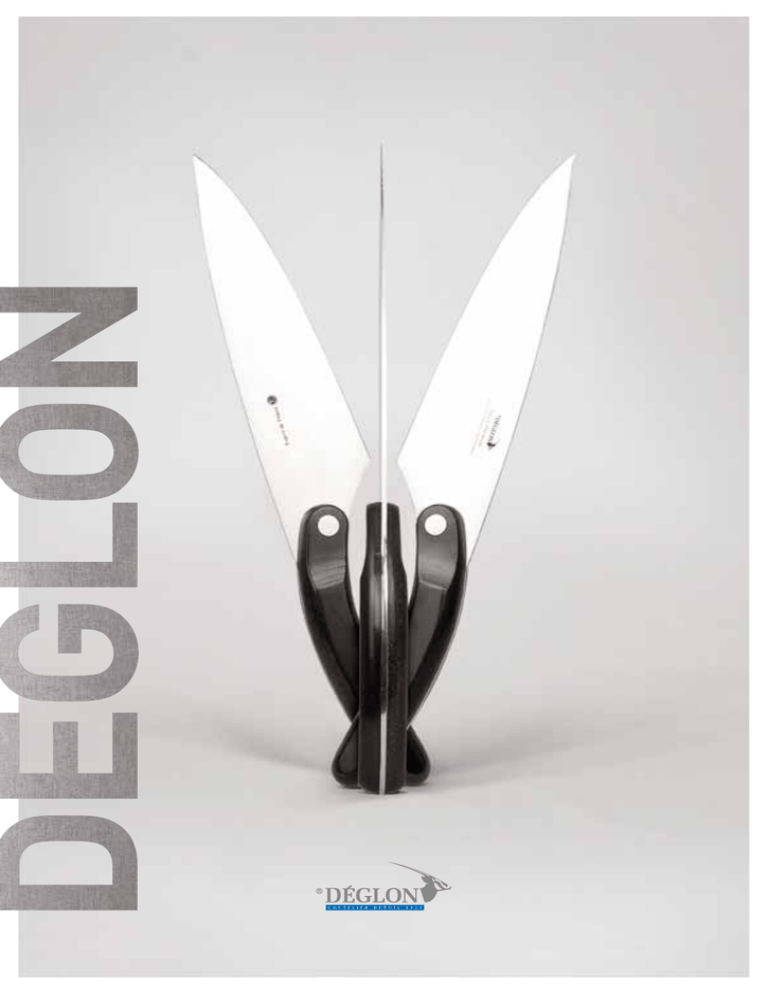 Depuis 1921, mon grand-père, mon père et moi-même nous sommes impliqués avec passion au coeur de la coutellerie thiernoise. De la création du premier atelier par Jean Déglon à l’implantation industrielle actuelle, nous nous sommes toujours appuyés sur un savoir-faire exigeant et sur une créativité unique. C’est ainsi que nous avons gagné la confiance d’une clientèle de professionnels très attentifs à la qualité de leurs outils. Nous avons eu l’honneur de célébrer nos 90 ans d’existence en 2011, entourés d’un grand nombre de nos partenaires et de nos proches. Je tiens à cette occasion à féliciter les générations de femmes et d’hommes consciencieux et fiers de leur travail qui ont amplement contribué à notre réussite. Gardant toujours un temps d’avance, Déglon a su évoluer à travers les époques et s’imposer comme une référence internationale en termes de qualité et d’innovation, et ce dès ses débuts. Confiant dans notre potentiel actuel, et avec l’appui de nos partenaires distributeurs et fournisseurs, je peux d’ores et déjà vous garantir un futur plein de promesses pour les 90 prochaines années. Je vous invite à parcourir notre nouveau catalogue, au fil duquel vous pourrez découvrir nos récentes innovations ainsi que nos incontournables. Since 1921, my grand-father, my father and myself have been passionately involved at the heart of Thiers’ cutlery. From the first workshop founded by Jean DEGLON to the current industrial site, we always relied on an exacting know-how and an unique creativity. This is how we acquired the trust of our professional customers, demanding on the quality of their tools. It has been a great honor of celebrating our 90th anniversary in 2011, with many of our partners and friends, and to enjoy this opportunity to congratulate the generations of proud and conscientious women and men who contributed to our success. Always keeping one step ahead, DEGLON has known how evolving through time and how establishing itself as an international reference in terms of quality and innovation. Confident in our capacities and in the support of our partners, suppliers and distributors, I can already guarantee a promising future for the next 90 years. I invite you to browse our catalog, over which you will discover our recent novelties as well as our essential items. Sommaire Bien choisir son couteau....................... p.6 Affutage........................................................................................p.45 Innovation...................................................................................... p.8 Pratique.........................................................................................p.51 Communication................................................................... p.9 Office.....................................................................................................p.56 Aider à mieux vendre....................................p.10 Table / steak......................................................................p.58 Tous en cuisine..............................................................p.13 Ecole hotelière.......................................................... p63 Viande & poisson......................................................p.25 Concept.............................................................................................p.76 Fromage & dessert.............................................p.35 Index.........................................................................................................p.87 A votre service............................................................p.40 Références.............................................................................p.89 Paris Thiers deglon s.a.s ZONE INDUSTRIELLE DE FELeT - BP64 63307 THIERS CEDEX - FRANCE tél. : +33 (0)4 73 80 44 99 fax : +33 (0)4 73 51 09 38 mail : [email protected] www.deglon.com 3/92 Une histoire de tradition et d’ innovation jean déglon rené déglon d’un début prometteur... A une entreprise d’envergure Jeune ingénieur suisse, Jean Déglon arrive à Thiers au début du 20ème siècle et se découvre une passion pour l’art séculaire de la coutellerie. Entrepreneur dans l’âme, il crée sa propre société en 1921. Visionnaire, Jean opte pour la coutellerie de table avec une production de très haute qualité. Magasins de coutellerie, quincailleries et grands magasins des quatre coins de France deviennent des clients fidèles. Officiant à ses côtés, son fils René entreprend le développement du réseau de distribution à l’étranger, notamment aux Etats-Unis, où la marque rencontre un franc succès.... En 1980, Thierry Déglon prend les rennes de l’entreprise, perpétuant un savoir-faire d’exception. Sous son impulsion, la société se spécialise dans la coutellerie professionnelle et se positionne parmi les leaders du marché. Ayant à coeur de simplifier le quotidien des utilisateurs, la marque mise sur l’innovation et la recherche pour se démarquer de la concurrence. A story combining tradition and innovation From a promising start... During the interwar, young Swiss engineer Jean Déglon settles in Thiers and discovers a passion for the secular art of cutlery. An entrepreneur at heart, he founds his own company in 1921 and commits to produce high quality cutlery. All around the country, cutlery shops, hardware stores and department stores quickly become loyal customers. Working by his side, his son René undertakes to develop the distribution network abroad, particularly in the United States where the brand meets with a great success. ...To a major player. In 1980, Thierry Déglon takes the head of the firm and perpetuates its exceptional know-how. Under his leadership, the company gets specialized in the professional cutlery and gets quickly ranked among the market leaders. Dedicated to ease the daily use of its knives, Déglon focuse
