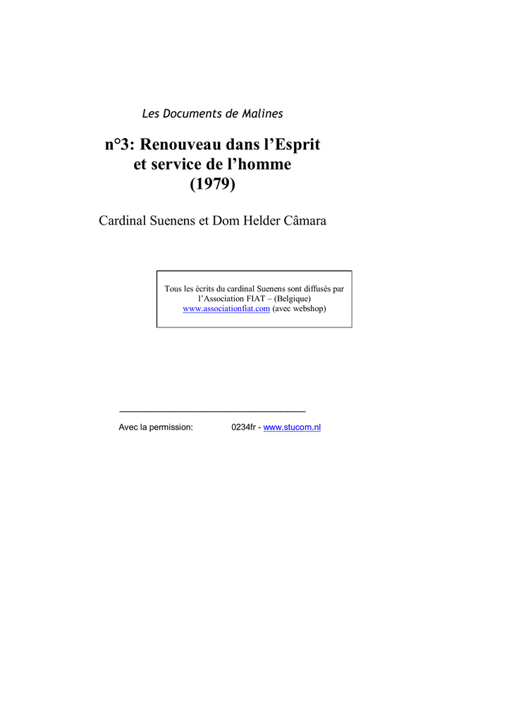 Les Documents de Malines n°3: Renouveau dans l’Esprit et service de l’homme (1979) Cardinal Suenens et Dom Helder Câmara Tous les écrits du cardinal Suenens sont diffusés par l’Association FIAT – (Belgique) www.associationfiat.com (avec webshop) ______________________________ Avec la permission: 0234fr - www.stucom.nl +L.J. Cardinal SUENENS ( 16 juillet 1904 – 6 mai 1996 ) L’Esprit Saint, souffle vital de l’Église Tome III Les documents de Malines N°3 : Renouveau dans l’Esprit et service de l’homme en collaboration avec Dom Helder Câmara (1979) Note de l’Editeur La réédition des Documents de Malines que voici est réalisée à partir des dernières éditions en langue française, retravaillées par le cardinal Suenens et publiées dans les années 70 et 80. La première édition du Document de Malines n°3 Renouveau dans l’Esprit et service de l’homme a été réalisée jadis par Lumen Vitae (Bruxelles, 1979), le n°4 Renouveau et Puissances des Ténèbres par les Cahiers du Renouveau (Paris, 1982) et le n°6 Repos dans l’Esprit par Declée de Brouwer (Paris, 1986). Le Document n°5 Culte du Moi et foi chrétienne n’est pas repris dans cette collection vu qu’il ne se rapporte pas directement au Renouveau dans l’Esprit. La préface du cardinal Danneels, rédigée pour l’ensemble des trois parties, se trouve dans le tome I. Réédition par l’Association FIAT à la Noël 2001 Tous droits réservés. Aucune partie du livre ne peut être reproduite en aucune manière sans la permission écrite de l’Association FIAT. D / 2001 / 7273 / 5 ISBN 90 75410 15-8 NUGI 632/636 L’ESPRIT SAINT, SOUFFLE VITAL DE L’ÉGLISE 4 Table des Matières Tome III Les Documents de Malines n°3 Renouveau dans l’Esprit et service de l’homme Introduction 11 1. Une double approche 2. Clivage et tensions 3. La complémentarité nécessaire Chapitre I FACE A DIEU Dom Helder Câmara 1. 2. 3. 4. Le Dieu de la création Dieu révèle son dessein de salut Le Dieu de l’Incarnation La prière, clef de contact avec Dieu Cardinal Suenens 1. 2. 3. 4. 5. 21 Le christianisme, c’est Jésus Christ La spécificité chrétienne Le christianisme normatif Pour moi, vivre, c’est Jésus Christ Aimer avec le cœur du Christ 29 Chapitre II AU SERVICE DE L’HOMME Cardinal Suenens 1. 2. 3. 4. 5. 6. 7. 8. Le chrétien et ses solidarités humaines Évangélisation et humanisation Le péché d’omission Autre monde et monde autre Esprit Saint et engagement social L’Esprit et ses charismes Les fruits de l’Esprit Saint La misère du monde à la lumière de l’Esprit Dom Helder Câmara 1. 2. 3. 4. 5. 6. 7. 8. 9. 10. 11. 12. 13. 14. 37 53 Le chrétien, frère de tous les hommes Voir : le monde sous nos yeux Juger en chrétien Agir Une espérance : les communautés de base Nos responsabilités Éducateurs religieux Les religieuses, les enseignants Les mass media Convergence des efforts Invitation au courage chrétien En bref La voix du monde sans voix Le message de Puebla Chapitre III APOTRES DU CHRIST Cardinal Suenens 1. L’apostolat par la parole 71 L’ESPRIT SAINT, SOUFFLE VITAL DE L’ÉGLISE 6 ‘Le monde n’est pas prêt à écouter’ – ‘Il faut respecter les consciences’ 2. L’apostolat par la vie 3. L’apostolat à travers la vie communautaire 4. Questions pour l’apostolat d’aujourd’hui Dom Helder Câmara 83 ‘Charismatiques, mes frères’ Chapitre IV AU CŒUR DE LA CITE Cardinal Suenens 91 1. Foi et structures globales 2. Présence et voix de l’Église 3. Théologie et salut libérateur Ni identité, ni séparation – La libération, un processus global – Le message de Gaudium et Spes – L’Esprit qui renouvelle la face de la terre – « Envoie ton Esprit et tout sera créé, et tu renouvelleras la face de la terre ». RENOUVEAU DANS L’ESPRIT ET SERVICE DE L’HOMME 7 Introduction Le idem velle et idem nolle, ‘vouloir et ne pas vouloir les mêmes choses’, est, selon les anciens, à la base de toute amitié. Dom Helder Câmara et moimême, avons cru qu’en nous exprimant ensemble en ces pages, au sujet de deux accentuations qui déterminent aujourd'hui un clivage entre chrétiens – les ‘engagés’ et les ‘charismatiques’ – nous pourrions peutêtre aider à dépasser certaines exclusives appauvrissantes et à conjoindre ‘ce que Dieu a uni’ : le premier et le second commandement. À nos yeux, un chrétien qui ne serait pas ‘charismatique’ – dans le sens ample du mot, c'est-à-dire disponible à l’Esprit et docile à ses motions – serait un chrétien oublieux de son baptême ; un chrétien qui ne serait pas ‘social’ serait un chrétien tronqué, méconnaissant les impératifs de l’Évangile. Nous avons pensé que la manière la plus simple de travailler ensemble – en termes musicaux, nous dirions de jouer une sorte de quatre mains – serait d’exposer tour à tour comment nous voyons le chrétien d’aujourd'hui, dans une totale ouverture à Dieu et un service intégral des hommes. Chacun le dira avec ce qui a fait son passé, sa vie, sa souffrance propre, qui est parfois d’être interprété à contresens. Helder Câmara est connu dans le monde comme ‘la voix de ceux qui sont sans voix’ : cela lui donne le droit de parler fort, en style personnel et vibrant, et l’on 8 L’ESPRIT SAINT, SOUFFLE VITAL DE L’EGLISE sait qu’il en assume les risques. En commençant une conférence à Bruxelles, je lui ai entendu dire un jour : “Excusez-moi, je ne parle pas français, je ne parle pas flamand, je parle ‘Câmara’, c'est-à-dire, ajouta-t-il avec humour, je parle avec mes bras, mes mains, mon corps… et tout mon cœur.” C’est l’évêque des pauvres qui parle en ces pages de nos devoirs sociaux, mais c’est aussi l’évêque qui passe de longues heures nocturnes en prière et qui relie fortement son action à l’emprise de Dieu. Puissions-nous aider, ensemble, à faire comprendre que la prière 