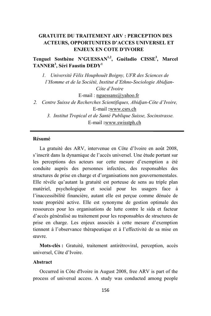 GRATUITE DU TRAITEMENT ARV : PERCEPTION DES ACTEURS, OPPORTUNITES D’ACCES UNIVERSEL ET ENJEUX EN COTE D’IVOIRE Tenguel Sosthène N’GUESSAN1,2, Guéladio CISSE3, Marcel TANNER3, Séri Faustin DEDY1 1. Université Félix Houphouët Boigny, UFR des Sciences de l’Homme et de la Société, Institut d’Ethno-Sociologie AbidjanCôte d’Ivoire E-mail : [email protected] 2. Centre Suisse de Recherches Scientifiques, Abidjan-Côte d’Ivoire, E-mail :www.csrs.ch 3. Institut Tropical et de Santé Publique Suisse, Socinstrasse. E-mail :www.swisstph.ch Résumé La gratuité des ARV, intervenue en Côte d’Ivoire en août 2008, s’inscrit dans la dynamique de l’accès universel. Une étude portant sur les perceptions des acteurs sur cette mesure d’exemption a été conduite auprès des personnes infectées, des responsables des structures de prise en charge et d’organisations non gouvernementales. Elle révèle qu’autant la gratuité est porteuse de sens au triple plan matériel, psychologique et social pour les usagers face à l’inaccessibilité financière, autant elle est perçue comme dénuée de toute propriété active. Elle est synonyme de gestion optimale des ressources pour les organisations de lutte contre le sida et facteur d’accès généralisé au traitement pour les responsables de structures de prise en charge. Les enjeux associés à cette mesure d’exemption tiennent à l’observance thérapeutique et à l’effectivité de sa mise en œuvre. Mots-clés : Gratuité, traitement antirétroviral, perception, accès universel, Côte d’Ivoire. Abstract Occurred in Côte d'Ivoire in August 2008, free ARV is part of the process of universal access. A study was conducted among people 156 infected, officials of the structures of management and nongovernmental organizations in the city of Bouake to capture their perceptions of this exemption. It reveals that free is meaningful to triple aspects: materially, psychologically and socially for users facing the financial inaccessibility. However, it is seen as devoid of active ownership. This exemption is synonymous with optimal resource management for organizations fighting against AIDS and factor Widespread treatment access for those responsible for management structures. The issues associated with this exemption relating to adherence and the effectiveness of its implementation. Keywords: Free of charge, antiretroviral therapy, perception, universal access, Côte d'Ivoire. Introduction L’accès au traitement antirétroviral pour les personnes vivant avec le VIH/sida constitue un enjeu sanitaire mondial au point où il se situe au troisième rang des actions prioritaires à mener dans le cadre de la lutte contre le sida (ONUSIDA 2009 ; OMS 2002 ; Milleriri 2006). Il justifie la mise en œuvre d’initiatives ambitieuses dont la plus manifeste est le « 3 by 5 » qui visait le double objectif de mettre sous ARV trois millions de personnes au terme de l’année 2005 et de favoriser l’accès universel auquel l’ensemble des 183 nations du monde a souscrit (Gilks et al. 2006 ; OMS-ONUSIDA 2005). Toutefois, bien que des résultats probants soient obtenus au terme de l’année 2008 (Nations-Unies 2008 ; ONUSIDA 2008), il reste qu’un nombre relativement important de personnes vivant avec le VIH/sida, éligibles au traitement antirétroviral, n’y a pas accès. Les estimations situent à 10 millions le nombre de personnes supplémentaires demeurant sans traitement et seulement 42% d’adultes et 38% d’enfants ayant besoin d’un traitement ARV en 2008 y avaient accès (ONUSIDA 2009). En Afrique subsaharienne, le taux de couverture de la thérapie antirétrovirale reste faible tandis que les écarts entre pays et à l’intérieur d’un même pays s’accentuent. Cette faible proportion de personnes sous traitement antirétroviral semble découler de l’échec des principes d’équité et de justice sociale et de la participation financière des patients à leur traitement. 157 L’inaccessibilité financière constitue en effet la principale barrière à l’accès aux soins et au traitement antirétroviral pour les personnes infectées par le VIH. Dès lors des plaidoyers en faveur d’une gratuité des soins et du traitement à l’échelon mondial situant sur l’intérêt d’une telle entreprise sanitaire tant pour les personnes infectées que le système de santé et la société toute entière vont voir le jour (Taverne 2003 ; RéSo 2004). Le soutien de la gratuité du traitement antirétroviral qui se situe dans le prolongement de l’accès universel est ainsi perçu comme l’un des moyens prioritaires pour contrôler l’épidémie et ses conséquences sur les individus et les sociétés et inverser la tendance en vue de la réalisation des Objectifs du Millénaire pour le Développement. Il constitue par ailleurs une exigence d’équité et d’éthique (Macklin 2004 ; OMS-ONUSIDA 2004). Ce faisant du Sénégal à la Côte d’Ivoire en passant par l’Ouganda, le Mali, le Cameroun et tout récemment le Burkina-Faso et bien d’autres pays à ressources limitées, les mesures portant gratuité des ARV se multiplient en Afrique Subsaharienne en vue de faire face à l’« état d'urgence sur le continent ». Bien qu’ayant sa prévalence en baisse passant de 4,7% (INS/MLS 2005) en 2005 à 3,7% en 2008 (RCI-CNLS 2010 ; ONUSIDA 2009), la Côte d’Ivoire reste le pays le plus affecté dans le bloc épidémiologique de l’Afrique de l’Ouest. Il compte, en 2008, 67 637personnes vivant avec le VIH sous ARV soit 28% alors que les estimations situent à 150 000 le nombre de personnes éligibles chaque année à la trithérapie (Nations-Unies 2006). La mesure portant gratuité du traitement antirétroviral intervenue en Août 2008 constitue ainsi une décision visant la levée de l’inaccessibilité financière en vue de l’accès universel (RCI/MSHP 2008 ; Vinard 2005 ; RCI 1997). Elle fait suite à un 