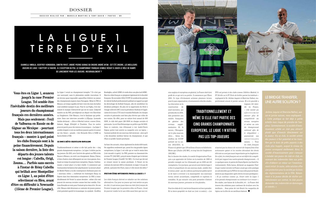 DOSSIER D o s s i e r R e a l i s é p a r : M a r c e l o M a r t i n s & T o n y D a v i d • P h o t o s : D R L a L i g u e 1 t e r r e d ’ e x i l Giannelli Imbula, Geoffrey Kondogbia, Dimitri Payet, André-Pierre Gignac ou encore André Ayew : cet été encore, les meilleurs joueurs de Ligue 1 quittent le navire. À l’exception du PSG, le championnat français semble réduit à jouer le rôle de rampe de lancement pour les joueurs. Inexorablement ? Franck Tabanou et André Ayew ont choisi Swansea pour leur début en Premier League. Vous êtes en Ligue 1, avancez jusqu’à la case Premier League. Tel semble être l’inévitable destin des meilleurs joueurs du championnat français ces dernières années. Mais pas seulement : l’exil de Valbuena en Russie ou de Gignac au Mexique - pourtant tous les deux internationaux français – montre à quel point les clubs français sont à la peine financièrement. Depuis la saison dernière, la liste des départs des jeunes talents est longue : Cabella, Origi, Zouma… Parfois sans succès à l’instar de Rémy Cabella qui brillait avec Montpellier en Ligue 1, au point d’être sélectionné en Bleu, avant d’être en difficulté à Newcastle (15ème de Premier League). La Ligue 1 serait un championnat tremplin ? Ce n’est pas une nouveauté, mais le phénomène semble s’accentuer. Il est devenu quasi impossible aujourd’hui d’attirer un joueur des championnats majeurs dans l’hexagone. Même le PSG et Monaco, un temps capables de faire venir des stars du ballon rond semblent marquer le pas. Pour le cas Pogba, c’est clairement le manque d’attractivité qui est en cause. L’objectif numéro un du PSG, privilégierait un départ vers Barcelone ou l’Angleterre. Côté Monaco, c’est le fatalisme qui prédomine. Dans une interview accordée à L’Équipe, Leonardo Jardim déclarait : « Silva et Martial restent, comme Dirar, Subasic, Raggi, Échiéjilé et Toulalan. Tous les autres peuvent partir pour des raisons économiques. » La Ligue 1 semble résignée à voir ses meilleurs joueurs partir et à miser sur des futurs « grands » tels Bernardo Silva à l’ASM ou Karim Rekik à l’OM. Kondogbia, acheté 20M€ et vendu deux ans plus tard 40M€. Mais les clubs français se plaignent également de la fiscalité française. En novembre 2014, l’UCPF (le syndicat des patrons de club de football professionnel) publiait un rapport au sujet du décrochage du football français, afin de sensibiliser les décideurs politiques. En plus de la suppression du Droit à l’image collectif (DIC) sous la présidence Sarkozy et l’application de la taxe à 75% sous le mandat Hollande, les charges sociales et patronales sont bien plus élevées que celles de nos voisins. En effet, pour un salaire brut annuel de 600 000€, le club doit payer 246 000€ en charges sociales et patronales. Là où l’état Britannique ne prélève que 94 500€. Dans ce contexte, rien d’étonnant à voir André-Pierre Gignac porter tout sourire sa casquette avec un tigrou – l’animal symbole de son nouveau club mexicain - alors qu’il a fini deuxième meilleur buteur du championnat, et que l’Euro se profile l’année prochaine. Le doux rêve Cristiano Ronaldo Traditionnellement et même si elle fait partie des « cinq grands championnats européens », la Ligue 1 n’attire pas les top-joueurs. En 2011, avec l’arrivée des qataris au PSG et des Russes à Monaco, on croit à un changement. Zlatan, Falcao, et bien d’autres stars débarquent sur nos vieux gazons, focalisant un temps les projecteurs européens. Depuis, l’enthousiasme a laissé place à la dure réalité. À commencer par l’instauration du fameux fair-play financier. La mesure phare de Michel Platini a eu des conséquences fâcheuses pour ces « nouveaux riches », confortant les historiques Barça ou Bayern dans leur domination européenne. Le PSG a considérablement été freiné la saison dernière : même s’ils vont pouvoir de nouveau recruter comme bon leur semble, Cristiano Ronaldo ne reste pour l’instant qu’un doux rêve. De son côté, Monaco doit désormais se contenter de jeunes joueurs à fort potentiel sportif et économique. Le symbole : Geoffrey Au banc des accusés, citons également les droits télévisuels. On rappellera seulement que, parmi les cinq grandes ligues européennes, la Ligue 1 est celle qui se vend le moins bien (voir encadré ci-après). Le PSG, premier au classement des revenus TV (44,6 M€), perçoit moins d’argent que le dernier de Premier League (Cardiff, 74,5 M€). Un écart qui devrait se creuser encore la saison prochaine. À l’heure où les contours du mercato 2015 se dessinent, la Ligue 1 n’a pas de pétrole, sauf peut-être Paris, mais a-t-elle encore des idées ? Peut-on être optimiste pour la Ligue 1 ? Les clubs français doivent se rabattre sur des solutions alternatives. Car pour un joueur qui veut mettre un peu de côté, il vaut mieux jouer dans un club (très) moyen de Premier League que les premiers rôles en France. Avant de pouvoir vendre la L1 aux télés aussi bien que nos voi- sins anglais et européens en général, la France doit tirer profit de ce qui est à sa portée. À commencer par l’Euro 2016. Ce type d’événement actionne plusieurs leviers pour le pays organisateur, et notamment celui des stades. La rénovation ou la construction de neuf enceintes, qui prendra fin en 2016, doit permettre aux entités françaises de générer des revenus supplémentaires. Et là encore, l’Hexagone est le plus mauvais élève… Selon les chiffres de l’UCPF portant sur la saison 2012/2013, la France n’a généré que 139 millions d’euros en billetterie. Moins que L’Italie (182 M€), et trop loin de l’Angleterre (682 M€). Sur le dossier des stades, le comité d’organisation Français a pu apprendre de l’échec en la matière de 1998 et prendre exemple sur les Allemands qui en 2006 ont ét