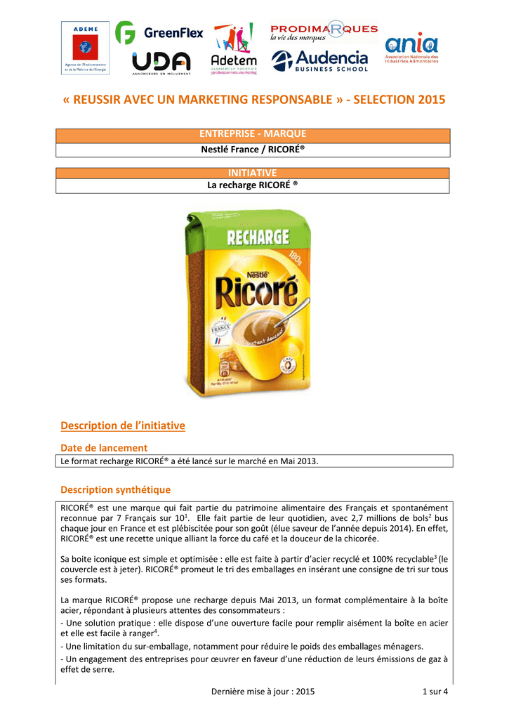 « REUSSIR AVEC UN MARKETING RESPONSABLE » - SELECTION 2015 ITIATIVE ENTREPRISE - MARQUE Nestlé France / RICORÉ® INITIATIVE La recharge RICORÉ ® Description de l’initiative Date de lancement Le format recharge RICORÉ® a été lancé sur le marché en Mai 2013. Description synthétique RICORÉ® est une marque qui fait partie du patrimoine alimentaire des Français et spontanément reconnue par 7 Français sur 101. Elle fait partie de leur quotidien, avec 2,7 millions de bols2 bus chaque jour en France et est plébiscitée pour son goût (élue saveur de l’année depuis 2014). En effet, RICORÉ® est une recette unique alliant la force du café et la douceur de la chicorée. Sa boite iconique est simple et optimisée : elle est faite à partir d’acier recyclé et 100% recyclable3 (le couvercle est à jeter). RICORÉ® promeut le tri des emballages en insérant une consigne de tri sur tous ses formats. La marque RICORÉ® propose une recharge depuis Mai 2013, un format complémentaire à la boîte acier, répondant à plusieurs attentes des consommateurs : - Une solution pratique : elle dispose d’une ouverture facile pour remplir aisément la boîte en acier et elle est facile à ranger4. - Une limitation du sur-emballage, notamment pour réduire le poids des emballages ménagers. - Un engagement des entreprises pour œuvrer en faveur d’une réduction de leurs émissions de gaz à effet de serre. Dernière mise à jour : 2015 1 sur 4 En effet, la recharge permet d’améliorer l’impact environnemental d’un bol consommé de RICORÉ®. Cet impact est établi à partir d’une Analyse du Cycle de Vie (ACV) comparative. La recharge est un emballage compact qui nécessite moins de matières premières pour sa fabrication et moins d’énergie pour son transport, par comparaison avec la boîte acier 100g5. Ainsi, pour un bol de RICORÉ® consommé, ce format permet de réduire de 12% les émissions de gaz à effet de serre par comparaison avec la boîte acier 100g5. 1 source : TNS SOFRES – Juin 2015 4 2 3 Source : Nielsen Consommateurs CAM P8 2015 source : Consigne de tri Eco-emballages source : étude qualitative auprès des consommateurs ayant utilisé la recharge 5source : Analyse de cycle de vie de la recharge réalisée par un cabinet externe et soumis à un expert indépendant (Février 2010) Comment a-t-elle été déployée ? L’histoire de la recharge RICORÉ® a débuté en 2010 suite à l’adhésion volontaire du groupe Nestlé France à une initiative soutenue par le Ministère de l’Ecologie et du Développement Durable. Elle visait à expérimenter à l’échelle nationale un système d’information environnementale. La marque RICORÉ® a évalué l’impact d’un bol de RICORÉ® consommé en faisant établir une analyse de cycle de vie. L’analyse sur le cycle de vie est une méthodologie scientifiquement reconnue et codifiée selon une norme ISO, conduite par un tiers à l’entreprise et soumise à un panel d’experts indépendants. Concrètement, elle évalue l'impact du produit depuis sa production jusqu'à sa fin de vie, de la récolte du café et de la chicorée jusqu’à sa consommation. Suite à cette ACV, le poids de l’emballage est apparu comme un des axes de réduction de l’impact environnemental du produit. Comme la boite acier RICORÉ® et son couvercle étaient déjà optimisés, la marque a décidé de créer un nouveau type d'emballage: la recharge RICORÉ®. Ce format a ensuite été lancé sur le marché dès Mai 2013. Ce format recharge réduit sensiblement l’impact environnemental d’un bol de RICORÉ® par comparaison avec le format acier 100g: la consommation d’eau (relative) est moindre car il est en matériau laminé, plus léger, nécessitant ainsi moins de matières premières pour sa fabrication et moins d’énergie pour son transport*. *Source : Analyse de cycle de vie de la recharge réalisée par un cabinet externe et soumis à un expert indépendant (Février 2010) Comment a-t-elle été communiquée auprès des consommateurs ? Implication RICORÉ® est une des premières références de l’épicerie en France1. Elle attire beaucoup de consommateurs en magasin dans la grande distribution. La présence de la recharge aux côtés de la boîte fer propose une alternative ingénieuse aux consommateurs et répond à leurs attentes. Forte de ces éléments, la recharge RICORÉ® s’est assurée un succès immédiat auprès des consommateurs. Information 1) Sur le packaging de la recharge avec un texte explicatif pour les consommateurs (photo ci-contre). 2) Sur le site internet « Croquons la vie ». 3) Via le QR Code sur l’emballage, renvoyant sur un site internet qui aide le consommateur à mieux comprendre les qualités nutritionnelles et les propriétés de l’emballage de ce produit (photo ci-contre). 1 Source : Nielsen Consommateurs CAM P8 2015 Dernière mise à jour : 2015 2 sur 4 En quoi est-elle innovante ? Le caractère innovant de la recharge RICORÉ® est lié à trois aspects : 1) La recharge est le seul format du marché français des produits à base de chicorée et de café qui justifie son positionnement écologique sur la base d’une analyse de cycle de vie. 2) Ce format permet de mener également une campagne de sensibilisation sur le cycle de vie du produit auprès des consommateurs. 3) Elle est la première recharge sur le marché des produits à base de chicorée et de café en France. Quelles ont été les difficultés et comment les avez-vous levées ? Les principales difficultés ont été les suivantes : 1) Investir dans une nouvelle ligne de conditionnement en usine, dédiée à ce nouveau type d’emballage. 2) Former les équipes à l’impact environnemental d’un produit et expliquer ce qu’est une analyse de cycle de vie grâce à des e-learning (formations sur une plateforme digitale). 3) Traduire une tendance consommateur pour un geste durable pour générer de la valeur p