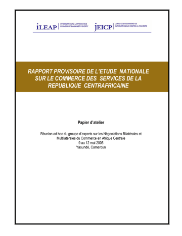 RAPPORT PROVISOIRE DE L’ETUDE NATIONALE SUR LE COMMERCE DES SERVICES DE LA REPUBLIQUE CENTRAFRICAINE Papier d’atelier Réunion ad hoc du groupe d’experts sur les Négociations Bilatérales et Multilatérales du Commerce en Afrique Centrale 9 au 12 mai 2005 Yaoundé, Cameroun Rapport Provisoire De L’Étude Nationale Sur Le Commerce Des Services De La Republique Centrafricaine Cet article a été rédigé pour des fins d’informations générales uniquement, et ne devrait en aucun cas servir d’appui en tant que conseil légal ni remplacer celui-ci. Il a été rédigé sous la coordination de Dominique Njinkeu par Sabine Beret assistée par Lessie Doré et Calvin Djiofac, et a également bénéficié de la perspicacité de plusieurs conseillers de JEICP. Des opinions exprimées dans cette publication ne sauraient en aucun cas être attribuées à JEICP, son conseil d'administration, ses bailleurs de fonds, ou encore les institutions avec lesquelles nos principaux conseillers sont associés. Des commentaires peuvent être envoyés au secrétariat de JEICP à : ([email protected]). SOMMAIRE Page I II III IV V Introduction…………………………………………………………………………….1 Approche méthodologique……………………………………………………………..2 DIAGNOSTIC ET SITUATION ACTUELLE DU SECTEUR DE SERVICE…….…2 EN CENTRAFRIQUE 1.1- Situations actuelle des différents secteurs………………………………….….4 1.1.1- Télécommunications :performances enregistrées et les difficultés rencontrées.4 1.1.2- Transport……………………………………………………………………….7 1.1.3- Tourisme……………………………………………………………………….9 1.1.4- Services environnementaux…………………………………………………..11 1.1.5- Services récréatifs, culturels, et sportifs………………………………………11 1.1.6- Services aux entreprises………………………………………………………11 1.1.7- Services bancaires en Centrafrique…………………………………………...12 1.1.8- Energie………………………………………………………………………..13 CADRE JURIDIQUE ET INSTITUTIONNEL DES DIFFERENTS SECTEURS….16 2.1 Cadre juridique……………………………………………………………………16 2.1.1 Pour les dispositions d’ ordre général…………………………………………..16 2.1.2 Concernant les dispositions spécifiques………………………………………...17 2.2 Du cadre institutionnel……………………………………………………………17 OBJECTIFS POURSUIVIS…………………………………………………………..18 3.1 Les objectifs globaux……………………………………………………………..19 3.2 Les objectifs spécifiques………………………………………………………….19 3.2.1 Objectifs en matière de Télécommunication…………………………………...19 3.2.2 Objectifs en matière des transports……………………………………………..19 3.2.3 Objectifs en matière du tourisme……………………………………………….19 3.2.4 Les secteurs bancaires et énergétique…………………………………………...19 STRATEGIES DE DEVELOPPEMENT DU SECTEUR……………………………20 4.1 Comment améliorer le secteur des Télécommunications…………………………20 4.2 Nécessité de développer le secteur des transports………………………………...20 4.3 Valoriser le tourisme……………………………………………………………...21 4.4 Renforcer le secteur bancaire et énergie………………………………………….21 CONCLUSION ET RECOMMANDATION………………………………………...27 INTRODUCTION 1Le secteur des services , comme le commerce des marchandises , connaît depuis quelques années une croissance rapide dans tous les pays de la planète . Le dernier rapport de l’OMC (2004) sur l’évolution du commerce mondial, relève que le commerce des services augmente au même rythme que celui des biens soit à 6% par an . L’impact de ce secteur sur l’économie mondiale a conduit la plus part des pays les moins avancés à inclure dans leur politique économique le commerce de services. C’est pourquoi la RCA, a l’instar des pays africains, ayant pris des engagements dans le cadre de l’AGCS, a fait du secteur de services un élément moteur de son économie. Pays a faible densité, la RCA est une zone de transition entre la savane subsaharienne et la forêt équatoriale. Avec une superficie de 623. 000 km² et une population de 3.800.000 habitants1, elle regorge d’énormes potentialités qu’elle n’arrive pas à traduire en performance économique au bénéfice de sa population en raison de divers handicaps conjoncturels et structurels. Situé au carrefour de grandes pistes commerciales transfrontalières, la RCA est un pays sans littoral. La capitale Bangui qui représente le principal pôle économique du pays se situe à 1500 du port de Douala (Cameroun) qui est le plus grand centre commercial et portuaire de la communauté. Il ressort du rapport sur le développement humain dans le monde (RMDH) que le développement humain recul en RCA, et que corrélativement la pauvreté monétaire et humaine progressent2 . Environ 67% des centrafricains sont au dessous du seuil de la pauvreté, et 45% d’entre eux vivent dans des conditions de dénuement total. Selon le rapport du Programme des Nations Unies pour le Développement ,son indice de développement humain (IDH) reste très faible passant de 0,37 en 2000 à 0,38 en 2004 ; ce qui place la RCA au 167ème rang sur 174 Pays. Cette perte s’explique par, la dégradation de la situation économique et sociale due aux m