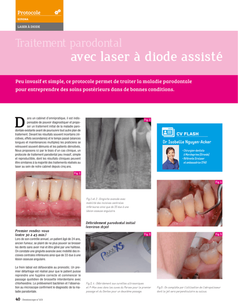Protocole Sirona LASER À DIODE Traitement parodontal combinées avec laser à diode assisté Peu invasif et simple, ce protocole permet de traiter la maladie parodontale pour entreprendre des soins postérieurs dans de bonnes conditions. D ans un cabinet d’omnipratique, il est indispensable de pouvoir diagnostiquer et proposer un traitement initial de la maladie parodontale existante avant de poursuivre tout autre plan de traitement. Devant les résultats souvent incertains (récidives, effets secondaires) et le temps passé (séances longues et maintenances multiples) les praticiens se retrouvent souvent démunis et les patients démotivés. Nous proposons ici par le biais d’un cas clinique, un protocole de traitement parodontal peu invasif, simple et reproductible, dont les résultats cliniques peuvent être similaires à la majorité des traitements réalisés au laser au sein de notre cabinet depuis cinq ans. Fig. 2 CV FLASH Dr Isabelle Nguyen-Acker • Chirurgien-dentiste à Marcheprime (Gironde) • Référente Sirolaser et ambassadrice CFAO Fig. 1 Fig. 4 Fig.1 et 2 : Gingivite avancée avec mobilité des incisives centrales inférieures ainsi que de 33 due à une lésion osseuse angulaire. Débridement parodontal initial (environ 1h30) Premier rendez-vous (entre 30 à 45 min.) Fig. 3 Fig. 5 Lors de son contrôle annuel, un patient âgé de 24 ans, ancien fumeur, se plaint de ne plus pouvoir se brosser les dents sans avoir mal et être gêné par une halitose. On constate une gingivite avancée avec mobilité des incisives centrales inférieures ainsi que de 33 due à une lésion osseuse angulaire. Le frein labial est défavorable au pronostic. Un premier détartrage est réalisé pour que le patient puisse reprendre une hygiène correcte et commencer le passage quotidien de brossette interdentaire avec chlorhexidine. Le prélèvement bactérien et l’observation au microscope confirment le diagnostic de la maladie parodontale. 40 - Dentoscope n°153 Fig.3, 4 : Débridement aux curettes ultrasoniques et P-Max avec dans les cuves du Paroex pour le premier passage et du Dentex pour un deuxième passage. Fig.5 : On complète par l’utilisation de l’aéropolisseur dont le jet sera perpendiculaire au sulcus. Fig. 6 Fig. 7 Fig.6 et 7 : Utilisation de laser diode de 455 nm pour une frénectomie rapide et indolore. Le patient repart avec une ordonnance de Dentex et Bicarbonate de sodium extra-fin à mélanger en consistance pâteuse et à déposer sur brossette interdentaire une fois par jour pendant une semaine. Maintenance à une semaine Fig. 8 Fig.8 : Utilisation du même laser, mais en longueur d’onde 980 nm (réglage automatique de l’appareil selon le choix de la chirurgie ou de la désinfection parodontale) sous présence d’eau oxygénée pour favoriser la PDT (Thérapie Photo dynamique). Passage vertical puis horizontal pour balayer toutes les poches parodontales. Maintenance à 4 semaines Dans ce cas clinique on n’a pas eu recours à une réelle deuxième phase de maintenance, séance très positive pour le patient qui est à nouveau motivé par ce résultat rapide. Les soins postérieurs peuvent être entrepris dans de bonnes conditions. Si certains sites saignent encore, il ne faut pas hésiter à avoir recours à nouveau au laser. MAINTENANCE TOUS LES 6 MOIS Fig.10 : Diminution significative des mobilités dentaires. Un contrôle radiologique et photographique permet de confirmer la bonne évolution du parodonte avec amélioration des attaches parodontales. Aucun signe clinique inflammatoire. Fig. 9 Fig.9 : •C ontrôle des poches parodontales et de la cicatrisation de la frénectomie. • P assage supplémentaire d’eau oxygénée et laser dans les poches récalcitrantes. • L es signes inflammatoires sont nettement réduits et on constate un gain de hauteur gingivale sur les racines des incisives inférieures. • Généralement les patients que l’on a motivés pour un traitement parodontal sont très assidus et suivent bien les conseils d’hygiène mais notre contôle est un facteur indispensable pour garder le niveau de résultat obtenu. • Ils apprécient tout particulièrement notre système de rappel automatique de rendez-vous tous les six mois pour un simple détartrage et contrôle parodontal. CONCLUSION Le laser diode apporte un moyen efficace dans l’oxygénation des tissus parodontaux et contribue à l’élimination des bactéries anaérobies de la flore pathogène. Son utilisation demande à peine 10 minutes de plus qu’un protocole conventionnel de débridement non chirurgical pour l’ensemble des arcacdes. Il peut être un atout non négligeable pour gérer les microchirurgies nécessaires à la guérison du parodonte telles que la frénectomie dans ce cas précis. On soulignera le caractère non douloureux et la cicatrisation rapide des tissus grâce au phénomène de biostimulation concommittant. Un protocole rigoureux et un suivi sérieux du patient sont des facteurs de pronostic favorable. où se le procurer ? SIRONA Tél. : 01 85 56 04 40 3 w : sirona.fr Stand ADF : 2N03 Dentoscope n°153 - 41