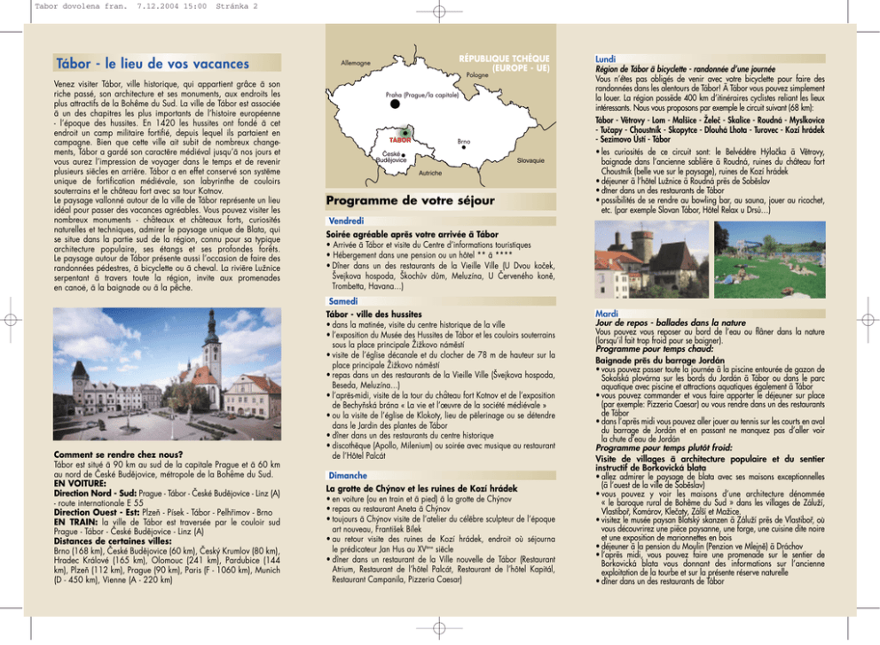 Tabor dovolena fran. 7.12.2004 15:00 Stránka 2 Tábor - le lieu de vos vacances ^ Venez visiter Tábor, ville historique, qui appartient grace Ç son riche passé, son architecture et ses monuments, aux endroits les ^ plus attractifs de la Boheme du Sud. La ville de Tábor est associée Ç un des chapitres les plus importants de l’histoire européenne - l’époque des hussites. En 1420 les hussites ont fondé Ç cet endroit un camp militaire fortifié, depuis lequel ils partaient en campagne. Bien que cette ville ait subit de nombreux changements, Tábor a gardé son caractïre médiéval jusqu’Ç nos jours et vous aurez l’impression de voyager dans le temps et de revenir plusieurs siïcles en arriïre. Tábor a en effet conservé son systïme unique de fortification médiévale, son labyrinthe de couloirs ^ souterrains et le chateau fort avec sa tour Kotnov. Le paysage vallonné autour de la ville de Tábor représente un lieu idéal pour passer des vacances agréables. Vous pouvez visiter les ^ ^ nombreux monuments - chateaux et chateaux forts, curiosités naturelles et techniques, admirer le paysage unique de Blata, qui se situe dans la partie sud de la région, connu pour sa typique ^ architecture populaire, ses étangs et ses profondes forets. Le paysage autour de Tábor présente aussi l’occasion de faire des randonnées pédestres, Ç bicyclette ou Ç cheval. La riviïre LuÏnice serpentant Ç travers toute la région, invite aux promenades .. ^ en canoe, Ç la baignade ou Ç la peche. Comment se rendre chez nous? Tábor est situé Ç 90 km au sud de la capitale Prague et Ç 60 km ^ au nord de âeské Budûjovice, métropole de la Boheme du Sud. EN VOITURE: Direction Nord - Sud: Prague - Tábor - âeské Budûjovice - Linz (A) - route internationale E 55 Direction Ouest - Est: PlzeÀ - Písek - Tábor - Pelhfiimov - Brno EN TRAIN: la ville de Tábor est traversée par le couloir sud Prague - Tábor - âeské Budûjovice - Linz (A) Distances de certaines villes: Brno (168 km), âeské Budûjovice (60 km), âesk˘ Krumlov (80 km), Hradec Králové (165 km), Olomouc (241 km), Pardubice (144 km), PlzeÀ (112 km), Prague (90 km), Paris (F - 1060 km), Munich (D - 450 km), Vienne (A - 220 km) RÉPUBLIQUE TCHñQUE (EUROPE - UE) Allemagne Pologne Praha (Prague/la capitale) TÁBOR Brno České Budějovice Slovaquie Autriche Programme de votre séjour Lundi Région de Tábor Ç bicyclette - randonnée d’une journée ^ Vous n’etes pas obligés de venir avec votre bicyclette pour faire des randonnées dans les alentours de Tábor! Å Tábor vous pouvez simplement la louer. La région possïde 400 km d’itinéraires cyclistes reliant les lieux intéressants. Nous vous proposons par exemple le circuit suivant (68 km): Tábor - Vûtrovy - Lom - Mal‰ice - Îeleã - Skalice - Roudná - Myslkovice - Tuãapy - Choustník - Skopytce - Dlouhá Lhota - Turovec - Kozí hrádek - Sezimovo Ústí - Tábor ^ • les curiosités de ce circuit sont: le Belvédere H˘laãka Ç Vûtrovy, ^ baignade dans l’ancienne sabliïre Ç Roudná, ruines du chateau fort Choustník (belle vue sur le paysage), ruines de Kozí hrádek • déjeuner Ç l’hôtel LuÏnice Ç Roudná prïs de Sobûslav ^ • diner dans un des restaurants de Tábor • possibilités de se rendre au bowling bar, au sauna, jouer au ricochet, etc. (par exemple Slovan Tábor, Hôtel Relax u DrsÛ…) Vendredi Soirée agréable aprïs votre arrivée Ç Tábor • Arrivée Ç Tábor et visite du Centre d’informations touristiques • Hébergement dans une pension ou un hôtel ** Ç **** ^ • Diner dans un des restaurants de la Vieille Ville (U Dvou koãek, ·vejkova hospoda, ·kochÛv dÛm, Meluzína, U âerveného konû, Trombetta, Havana…) Samedi Tábor - ville des hussites • dans la matinée, visite du centre historique de la ville • l’exposition du Musée des Hussites de Tábor et les couloirs souterrains sous la place principale ÎiÏkovo námûstí • visite de l’église décanale et du clocher de 78 m de hauteur sur la place principale ÎiÏkovo námûstí • repas dans un des restaurants de la Vieille Ville (·vejkova hospoda, Beseda, Meluzína…) ^ • l’aprïs-midi, visite de la tour du chateau fort Kotnov et de l’exposition de BechyÀská brána « La vie et l’oeuvre de la société médiévale » • ou la visite de l’église de Klokoty, lieu de pïlerinage ou se détendre dans le Jardin des plantes de Tábor ^ • diner dans un des restaurants du centre historique • discothïque (Apollo, Milenium) ou soirée avec musique au restaurant de l’Hôtel Palcát Dimanche La grotte de Ch˘nov et les ruines de Kozí hrádek • en voiture (ou en train et Ç pied) Ç la grotte de Ch˘nov • repas au restaurant Aneta Ç Ch˘nov • toujours Ç Ch˘nov visite de l’atelier du célïbre sculpteur de l’époque art nouveau, Franti‰ek Bílek • au retour visite des ruines de Kozí hrádek, endroit ou` séjourna le prédicateur Jan Hus au XVïme siïcle ^ • diner dans un restaurant de la Ville nouvelle de Tábor (Restaurant Atrium, Restaurant de l’hôtel Palcát, Restaurant de l’hôtel Kapitál, Restaurant Campanila, Pizzeria Caesar) Mardi Jour de repos - ballades dans la nature ^ Vous pouvez vous reposer au bord de l’eau ou flaner dans la nature (lorsqu’il fait trop froid pour se baigner). Programme pour temps chaud: Baignade prïs du barrage Jordán • vous pouvez passer toute la journée Ç la piscine entourée de gazon de Sokolská plovárna sur les bords du Jordán Ç Tábor ou dans le parc aquatique avec piscine et attractions aquatiques également Ç Tábor • vous pouvez commander et vous faire apporter le déjeuner sur place (par exemple: Pizzeria Caesar) ou vous rendre dans un des restaurants de Tábor • dans l’aprïs midi vous pouvez aller jouer au tennis sur les courts en aval du barrage de Jordán et en passant ne manquez pas d’aller voir la chute d’eau de Jordán Progra