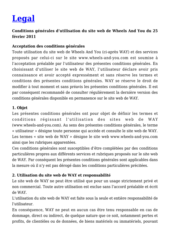 Legal Conditions générales d’utilisation du site web de Wheels And You du 25 février 2011 Acceptation des conditions générales Toute utilisation du site web de Wheels And You (ci-après WAY) et des services proposés par celui-ci sur le site www.wheels-and-you.com est soumise à l’acceptation préalable par l’utilisateur des présentes conditions générales. En choisissant d’utiliser le site web de WAY, l’utilisateur déclare avoir pris connaissance et avoir accepté expressément et sans réserve les termes et conditions des présentes conditions générales. WAY se réserve le droit de modifier à tout moment et sans préavis les présentes conditions générales. Il est par conséquent recommandé de consulter régulièrement la dernière version des conditions générales disponible en permanence sur le site web de WAY. 1. Objet Les présentes conditions générales ont pour objet de définir les termes et conditions régissant l’utilisation des sites web de WAY (www.wheels-and-you.com). Au sens des présentes conditions générales, le terme « utilisateur » désigne toute personne qui accède et consulte le site web de WAY. Les termes « site web de WAY » désigne le site web www.wheels-and-you.com ainsi que les rubriques apparentées. Ces conditions générales sont susceptibles d’être complétées par des conditions particulières propres aux différents services et rubriques proposés sur le site web de WAY. Par conséquent les présentes conditions générales sont applicables dans la mesure où il n’y est pas dérogé dans les conditions particulières précitées. 2. Utilisation du site web de WAY et responsabilité Le site web de WAY ne peut être utilisé que pour un usage strictement privé et non commercial. Toute autre utilisation est exclue sans l’accord préalable et écrit de WAY. L’utilisation du site web de WAY est faite sous la seule et entière responsabilité de l’utilisateur. En conséquence, WAY ne peut en aucun cas être tenu responsable en cas de dommage, direct ou indirect, de quelque nature que ce soit, notamment pertes et profits, de clientèles ou de données, de biens matériels ou immatériels, pouvant résulter de l’utilisation ou de l’impossibilité d’utilisation du site web de WAY. En particulier, WAY n’est en aucun cas responsable du fonctionnement des logiciels et de la transmission de toute donnée ou information sur Internet, ni en cas de piratage total ou partiel du site et des dommages qu’un tel piratage pourrait causer à l’utilisateur ou à des tiers. Le site web de WAY est en principe accessible 24 heures sur 24. Cependant, WAY ne peut être tenu responsable en cas d’impossibilité technique de connexion, qu’elle qu’en soit la cause (force majeure, opération de maintenance, mise à jour éditoriale, interruption ou panne de réseau, coupure d’électricité, défaillance, mauvaise configuration ou mauvaise utilisation de l’ordinateur de l’utilisateur, du matériel de réception ou des lignes téléphoniques, ou toute autre cause dépendant ou non de la volonté de WAY). Tout matériel téléchargé et/ou obtenu de quelque manière que ce soit lors de l’utilisation du site web de WAY l’est aux risques et périls de l’utilisateur, WAY ne pouvant en aucun cas être tenu responsable des dommages et pertes de données subis par l’utilisateur de ce fait. WAY ne garantit pas que le serveur et le site web de WAY soient exempts de virus. Par conséquent, WAY ne saurait être tenu responsable en cas de contamination par un virus du matériel informatique de l’utilisateur. Il appartient à l’utilisateur de prendre toutes les mesures nécessaires afin de protéger ses propres données, logiciels, ordinateur et autre matériel informatique de la contamination par d’éventuels virus circulant sur le réseau Internet. Par ailleurs, WAY ne garantit en aucune manière le taux et le temps de transfert des données du serveur hébergeant le site web de WAY vers le réseau Internet et l’ordinateur de l’utilisateur. WAY se réserve le droit, à tout moment et sans préavis, de modifier ou d’interrompre temporairement ou de façon permanente tout ou partie du site web de WAY et/ou des services proposés par celui-ci, sans que cela ne puisse donner lieu à de quelconques recours, réclamations ou prétentions de quelque nature que ce soit à l’égard de WAY. L’utilisateur est responsable envers WAY de tout dommage de quelque nature que ce soit qu’il cause lors de l’utilisation du site web de WAY. 3. Forums, blogs, chats et autres rubriques similaires 3.1 Acceptation des conditions générales Tout utilisateur qui entend poster un message texte, audio ou vidéo sur un forum, blog, chat ou toute autre rubrique similaire du site web de WAY doit préalablement prendre connaissance et accepter les présentes conditions générales, en particulier les obligations lui incombant en vertu du chiffre 3.4 ciaprès. En postant un message texte, audio ou vidéo sur un forum, blog, chat ou toute autre rubrique similaire, l’utilisateur signifie électroniquement son acceptation sans réserve des conditions générales. 3.2 Confidentialité des paramètres d’accès Les paramètres d’accès, à savoir l’identifiant et le mot de passe permettant à l’utilisateur d’accéder aux services du site web de WAY, sont personnels, confidentiels et non transmissibles. Par conséquent, l’utilisateur s’engage à ne pas céder ni communiquer à un tiers ses paramètres d’accès et demeure seul responsable de l’utilisation de ces derniers. WAY ne saurait être tenu responsable de l’utilisation faite par un tiers (en particulier des propos tenus par celui-ci sur un forum, blog, chat ou toute autre rubrique similaire) en possession des paramètres d’accès de l’utilisateur. L’utilisateur s’engage à informer immédiatement WAY de toute utilisation non autorisée de ses paramètres d’a