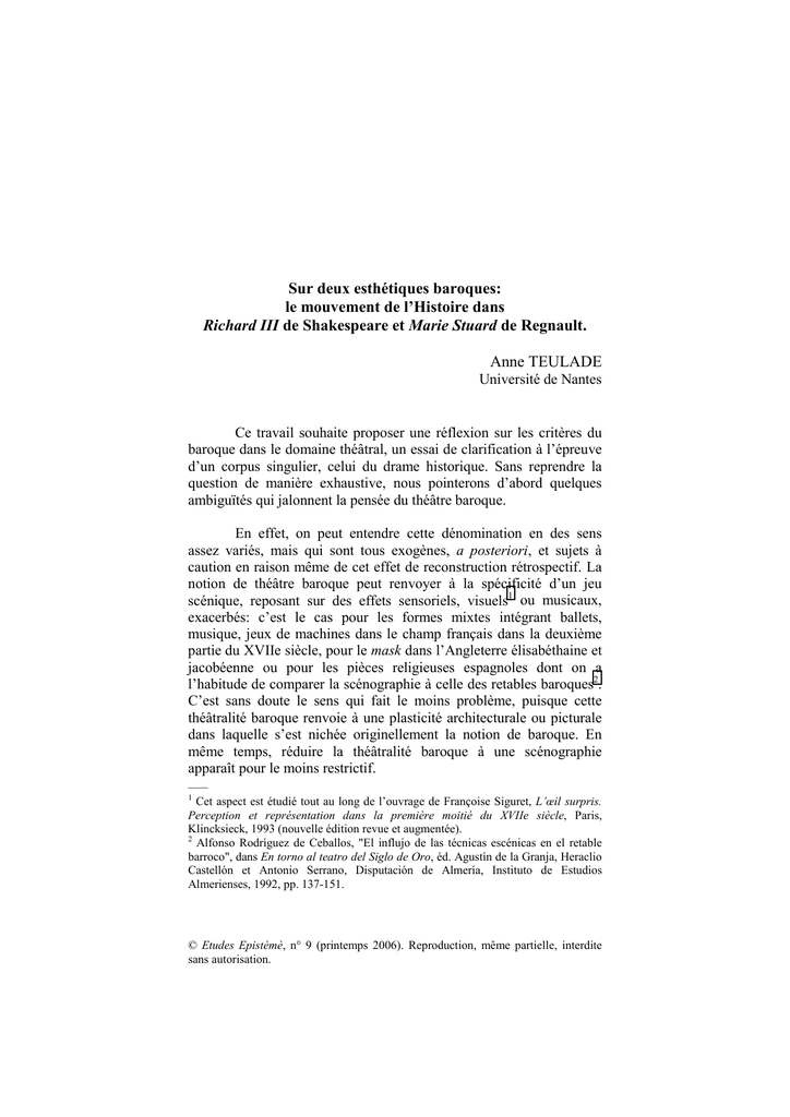 Sur deux esthétiques baroques: le mouvement de l’Histoire dans Richard III de Shakespeare et Marie Stuard de Regnault. Anne TEULADE Université de Nantes Ce travail souhaite proposer une réflexion sur les critères du baroque dans le domaine théâtral, un essai de clarification à l’épreuve d’un corpus singulier, celui du drame historique. Sans reprendre la question de manière exhaustive, nous pointerons d’abord quelques ambiguïtés qui jalonnent la pensée du théâtre baroque. En effet, on peut entendre cette dénomination en des sens assez variés, mais qui sont tous exogènes, a posteriori, et sujets à caution en raison même de cet effet de reconstruction rétrospectif. La notion de théâtre baroque peut renvoyer à la spécificité d’un jeu scénique, reposant sur des effets sensoriels, visuels1 ou musicaux, exacerbés: c’est le cas pour les formes mixtes intégrant ballets, musique, jeux de machines dans le champ français dans la deuxième partie du XVIIe siècle, pour le mask dans l’Angleterre élisabéthaine et jacobéenne ou pour les pièces religieuses espagnoles dont on a l’habitude de comparer la scénographie à celle des retables baroques2. C’est sans doute le sens qui fait le moins problème, puisque cette théâtralité baroque renvoie à une plasticité architecturale ou picturale dans laquelle s’est nichée originellement la notion de baroque. En même temps, réduire la théâtralité baroque à une scénographie apparaît pour le moins restrictif. ––– 1 Cet aspect est étudié tout au long de l’ouvrage de Françoise Siguret, L’œil surpris. Perception et représentation dans la première moitié du XVIIe siècle, Paris, Klincksieck, 1993 (nouvelle édition revue et augmentée). 2 Alfonso Rodríguez de Ceballos, "El influjo de las técnicas escénicas en el retable barroco", dans En torno al teatro del Siglo de Oro, éd. Agustín de la Granja, Heraclio Castellón et Antonio Serrano, Disputación de Almería, Instituto de Estudios Almerienses, 1992, pp. 137-151. © Etudes Epistémè, n° 9 (printemps 2006). Reproduction, même partielle, interdite sans autorisation. 202 Anne Teulade La notion de théâtre baroque peut renvoyer également à une métaphysique, ou une ontologie, c’est-à-dire à une qualité singulière du monde représenté sur la scène. Reflétant la crise de l’épistémè en Europe à la fin du XVIe siècle3, ce théâtre attesterait la fragilité et l’inconstance du monde, se traduisant par des structures théâtrales spécifiques: motifs du masque, du déguisement4, spéculaires mises en abyme du jeu dans le théâtre ludique, obsession macabre et dévoilement de la divine comédie dans le théâtre sérieux5. L’intérêt de cette approche est de restituer une vision globale de ce théâtre, qui lie l’inscription dans un moment historique singulier, l’objet de la mimesis théâtrale et la forme adoptée, sans préjuger bien sûr des variantes propres à chaque aire esthétique. Enfin, l’on peut entendre la notion de théâtre baroque en contrepoint d’une esthétique classique, existante ou virtuelle. Le jeu d’opposition ne fait guère problème dans le champ français, où le théâtre classique existe, et se trouve défini en théorie, même si le découpage périodique entre ère baroque et ère classique ne laisse pas de poser problème et permet des jeux de glissement relançant sans cesse l’interrogation. Dans le champ espagnol, le théâtre que nous qualifions de baroque se distingue rétrospectivement autour d’un double jeu d’opposition: à l’égard des règles aristotéliciennes, refusées par Lope de Vega dans son Arte nuevo au profit d’une comedia qualifiée de monstre6, et à l’égard du théâtre néo-classique d’inspiration française théorisé par Luzán7 et pratiqué par Moratín par exemple au XVIIIe siècle, qui entendent évacuer l’héritage du Siècle d’Or au profit d’un modèle français. L’opposition entre théâtre baroque et classique n’est donc que virtuelle dans ce cas, et l’on voit davantage s’articuler une antinomie entre théâtre baroque et ––– 3 Sur ce point, voir Didier Souiller, La Littérature baroque en Europe, Paris, PUF, 1988, Première partie: "Baroque et crise de conscience européenne", pp. 19-62. Voir également les actes du colloque Tourments, doutes et ruptures dans l’Europe des XVIe et XVIIe siècles, éd. J.-Cl. Arnould, P. Demarolle et M. Roig Miranda, Paris, Champion, 1995. 4 Georges Forestier, Esthétique de l’identité dans le théâtre français (1550-1680). Le déguisement et ses avatars, Genève, Droz, 1988. 5 Georges Forestier, Le Théâtre dans le théâtre sur la scène française du XVIIe siècle, Genève, Droz, 1981. 6 Lope de Vega Carpio, Arte nuevo de hacer comedias en este tiempo, éd. Juana de José de Prades, Madrid, CSIC, 1971 [1609] 7 Ignacio de Luzán, La Poética, o Reglas de la poesía en general, y de sus principales especies, Zaragoza, Francisco Revilla, 1737. © Etudes Epistémè, n° 9 (printemps 2006). 203 " Sur deux esthétiques baroques: le mouvement de l'Histoire" revendication d’une certaine forme de régularité. Enfin, s’agissant de l’Angleterre, l’on peut se reporter au dialogue que met en scène Dryden dans son essai Essay of dramatick Poesie, dans lequel il fait émerger le contraste entre "the barenness of the French Plots"8 et "the variety and copiousness of the English"9, voire entre "a regular French play"10 et "an irregular English one, like those of Fletcher or of Shakespeare"11. Là encore, c’est par rapport à un modèle extérieur et importé, synonyme de régularité et d’épure que se comprend en creux et cette fois de manière exclusivement rétrospective, le profil du théâtre que nous qualifions de baroque. L’on peut donc seulement dire que ce théâtre se positionne à l’écart d’une posture théoricienne et systématique ainsi que des règle