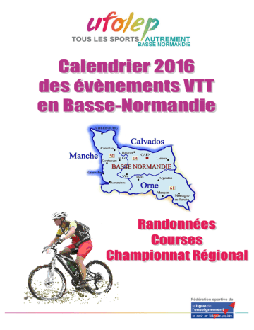 Dimanche 21 février 2016 9ème Trophée CPS et IREO, course organisée par l'ASPTT CAEN Courses VTT 1ère manche du championnat régional Lieu : Poussins, benjamins : 7 km / Minimes : 15 km / Cadets, Féminines : 25 km Juniors, Espoirs, Séniors, Vétérans, Tandems : 35 km Château de Maltot (14) Contact organisateur : mail : [email protected] 02 31 26 95 50 Site internet : aspttcaen.wifeo.com 06 51 39 43 81 Dimanche 13 mars 2016 La Chetor, course organisée par l'ECT Lisieux Courses VTT Lieu : 2ème manche du championnat régional Les Bruyères Carrées à Moyaux (14) Parcours de 9 km Contact organisateur : mail : [email protected] et 06.15.39.35.76 02 31 62 73 10 Dimanche 3 avril 2016 Courses VTT 3ème manche du championnat régional Course VTT organisée par Vélo Jeunes Aventure Lieu : Baron sur Odon (14) Info sur la page Facebook de Vélo Jeunes Aventure https://fr-fr.facebook.com/velojeunesaventure.herouville Contact organisateur : mail : [email protected] 06 27 12 38 87 Dimanche 10 avril 2016 Enduro du R4C, randonnée et compétitions enduro VTT organisées par le NCMTB Randuro Lieu : RANDONNEE VTT - Enduro - Parcours de 20km, dénivelé ±+450m dont 4 Spéciales (Randonnée Enduro) Enduro (Compétition) 1ère manche de L'enduro Normandie Series Cherbourg en Cotentin (50) COMPETITION VTT - Enduro Sprint - Parcours de 30km, dénivelé ±700m dont 6 Spéciales Chronométrées Retrait des plaques de cadres à partir de 7h30 – Briefing 8h15 - Départ 08h30 Contact organisateur : [email protected] et Internet : www.ncmtb.fr 06 50 24 34 07 Dimanche 24 avril 2016 R4C, randonnées VTT organisées par le NCMTB Randonnées VTT Lieu : 4 parcours VTT (27, 35, 46 et 56km), 1 parcours VTC (15km), 4 parcours pédestres Cherbourg en Cotentin (50) (9,12,17 et 22km), 2 parcours Trail (11, 17km) et 1 parcours PMS/poussettes (2km) Contact organisateur : [email protected] - Internet : www.ncmtb.fr 06 80 40 11 46 Dimanche 1er mai 2016 Le Raid des Martiens, randonnées et course VTT organisées par Aunay VTT Randonnées VTT le matin Courses VTT l'après-midi 4ème manche du championnat régional Lieu : Aunay sur Odon (14) RANDONNEES VTT 20 à 70km - Départs à partir de 8h Pédestre 10 km départ 9h - Inscriptions sur place à partir de 7h COMPETITION XC - Raid 40 - 28 km - Courses jeunes Retrait dossards à partir de 11h - Départ 14h pour tous Contact organisateur : mail : [email protected] 02 31 77 91 79 Site Internet : www.aunayvtt.fr 07 60 30 53 75 14/15/16 mai 2016 Courses VTT championnat national Lieu : Wingles (62) Championnat National UFOLEP VTT Liste des sélectionnés établie en fonction des résultats des 3 premières courses du championnat en prenant les 2 meilleurs résultats Dimanche 22 mai 2016 Randonnées VTT Les Mines d'Or … ne, randonnées VTT organisées par les Accro'Bike Parking de l'école Lieu : 6 circuits: 9/22/34/46/54/69 km May sur Orne Contact organisateur : (14) mail : [email protected] Courtillet S. 06-59-47-65-16 Internet : http://pagesperso-orange.fr/lesaccrobike Dimanche 5 juin 2016 Coupe de la Forêt, course VTT organisée par l'AJ Villers sur Mer Courses VTT 5ème manche du championnat régional Accueil à partir de 12h30 et départ à 14h30 Lieu : Le Brevedent / Le Faulq (14) Parcours 8 km / Remise des prix à 17h Contact organisateur : mail : [email protected] 02.31.81.01.69 06.08.46.06.33 Dimanche 19 juin 2016 Les Pépinières, randonnées VTT organisées par l'ES Falaise VTT Randonnées VTT 4 parcours VTT (30,45,56,70km) et 3 Pédestres (6, 8 et 14km) Lieu : Falaise (14), place des Bercagnes accueil a partir de 7h30, départ entre 8h00 et 9h00 Contact organisateur : mail : [email protected] 06 61 71 97 67 Dimanche 26 juin 2016 Courses VTT 6ème manche du championnat régional Les Roues Feuguerollaises, course VTT organisée par Vélo Jeunes Aventure Lieu : Feuguerolles Bully (14) Info sur la page Facebook de Vélo Jeunes Aventure https://fr-fr.facebook.com/velojeunesaventure.herouville Contact organisateur : mail : [email protected] 06 27 12 38 87 Dimanche 4 septembre 2016 La VTT VLM un Souffle pour la Vie, randonnées VTT organisée par VTT VLM Randonnées VTT Lieu : Athis de l'Orne (61) Parcours proposés : 5 en VTT (15, 30, 45, 60 ou 80 km) et 2 pédestres (8 ou 15 km). Accueil à partir de 7h30, départ entre 8h et 9h Contact organisateur : mail : [email protected] et site internet www.vttvlm.fr 06.15.71.35.92 Dimanche 11 septembre 2016 Randonnées VTT XTREM VTT TRAIL Normandie - Raids et Randonnées VTT organisés par LSAO Raids VTT et Randos VTT (8 parcours de 10 à 120 km) - Randos Pédestres Lieu : Trail ( 2 parcours de 10 et 20 km) - . Accueil à partir de 7h Amaye sur Contact organisateur : Orne (14) mail : [email protected] 06.83.97.91.48 Site internet : www.xtremvtt-normandie.fr 06.51.65.28.60 Dimanche 18 septembre 2016 Courses VTT 7ème manche du championnat régional La Villersoise Grand Prix du Casino, course VTT organisée par l'AJ Villers sur Mer Parcours de 9,3 km. Accueil à partir de 12h30, départ 14h. Lieu : Rendez-vous au carrefour de Bois Lurette et chemin du Pré Fontaine Villers sur Mer Contact organisateur : (14) mail : [email protected] 02.31.81.01.69 06.08.46.06.33 Dimanche 9 octobre 2016 Le Tour du Pays de Falaise, randonnées VTT organisées par l'ES Falaise VTT Randonnées VTT 3 parcours VTT ( 22, 41 et 54km )et 2 Pédestre (10 et 14 km ) Lieu : accueil à partir de 8h00 , départ entre 8h30 et 9h00 Contact organisateur : mail : [email protected] 06 61 71 97 67 Falaise (14), place des Bercagnes Dimanche 23 octobre 2016 La Collevillaise, randonnées VTT organisées par l'ASPTT Caen 2 parcours VTT proposés : 35 ou 50 km Accueil à partir de 8h30, départ 9h au stade Contact organisateur : mail : [email protected] Site internet : aspttcaen.wifeo.com Lieu : Randonnées VTT Colleville Montgomery (14) 02 31 26 95 50 06 51 39 43 81 Vendredi 11 novembre 2016 Randonnées VTT Les Sentiers de l'Odon 20ème édition, randonnées VTT org
