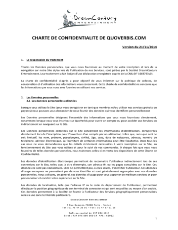 CHARTE DE CONFIDENTIALITE DE QUOVERBIS.COM Version du 21/11/2014 1. Le responsable du traitement Toutes les Données personnelles, que vous nous fournissez au moment de votre inscription et lors de la navigation sur notre Site et/ou lors de l'utilisation de nos Services, sont gérées par la Société DreamCentury Entertainment. Leur traitement a fait l'objet d'une déclaration enregistrée auprès de la CNIL (N° 1669793v0). La charte de confidentialité ci-après a pour objectif de vous informer sur la politique de collecte, de conservation et d’utilisation des informations vous concernant. Cette charte de confidentialité ne concerne que les informations que vous nous avez fournies en utilisant nos services. 2. Les Données personnelles 2.1 Les données personnelles collectées Lorsque vous utilisez le Site (pour vous enregistrer en tant que membres et/ou utiliser nos services gratuits ou payants) nous pouvons vous demander de nous fournir des données qui vous identifient personnellement Les Données personnelles désignent l'ensemble des informations que vous nous fournissez directement, notamment lorsque vous vous inscrivez sur QuoVerbis pour ouvrir un compte ou pour accéder aux Services ou indirectement en naviguant sur le Site. Les Données personnelles collectées sur le Site concernent les informations d'identification, enregistrées directement lors de l’inscription pour l'ouverture d'un compte par un utilisateur, telles que, sans que ceci ne soit limitatif, les nom, prénom, pseudonyme, civilité, âge, sexe, date de naissance, adresse, numéro de téléphone, adresse électronique. La fourniture de certaines informations peut être facultative. Dans tous les cas nous ne vous demanderons que les détails strictement nécessaires à votre inscription sur le Site, au fonctionnement du Site que vous utilisez et pour le suivi de vos commandes. À chaque fois que vous nous fournirez de telles données personnelles, nous traiterons celles-ci en vertu des dispositions de cette Charte de Confidentialité. Les données d'identification électronique permettent de reconnaitre l’utilisateur indirectement lors de ses connexions sur le Site, telles que, à titre d'exemple, son adresse IP, ou les pages consultées sur le Site. Ces données ne sont pas nominatives. Elles ne permettent pas, à elles seules, d’identifier l’utilisateur. Ces données d’usage anonymes ne permettent pas de vous identifier et sont généralement regroupées avec vos données personnelles. Nous utilisons, en général, ces données d’usage pour vous apporter de meilleurs services et pour personnaliser et enrichir votre expérience sur le Site. Les données de localisation, telle que l'adresse IP ou le code du département de l’utilisateur, permettant d'indiquer la position géographique de son terminal de connexion et qui sont recueillies au moyen d'un cookie. Ces données permettent à la Société de fournir à l’utilisateur des Services géographiquement personnalisés reliés à une zone territoriale particulière. DREAMCENTURY ENTERTAINMENT 7 Rue Beaujon 75008 Paris - France Tel : 01 75 44 26 50 – Fax : 01 47 37 61 15 SARL au capital de 137 204.10 € Siret : 434 076 899 000 54 APE : 6201Z 1 La Société peut ainsi collecter des données personnelles lorsqu’un utilisateur : • ouvre un Compte ; • utilise des Services ; • adresse une réclamation, une demande de renseignements, • navigue sur le Site et que des cookies sont enregistrés sur le disque dur de l’ordinateur et/ou du terminal mobile de l’utilisateur. La Société DreamCentury Entertainment n’essaiera en aucun cas d’obtenir, sans l’accord de l’utilisateur, d’autres informations qui permettraient une identification personnelle du profil de nos utilisateurs. L’application ou le site QuoVerbis peut contenir des liens menant vers d’autres sites. Nous ne sommes bien sûr pas responsables de la politique de confidentialité de ces sites. Nous encourageons nos utilisateurs à faire attention en quittant nos jeux, et à lire les chartes de confidentialité des sites sur lesquels ils se rendent. 2.2 Les Données personnelles renseignées par les utilisateurs Chaque utilisateur est seul responsable des données qu'il communique. L’utilisateur s’engage à : • fournir des informations d'identification exactes et complètes et s’engage à les mettre à jour régulièrement. Le cas échéant, l’utilisateur peut actualiser ses informations d'identification à tout moment. • choisir un identifiant (pseudonyme) et un mot de passe qui lui permettront d'accéder aux Services. • renseigner une adresse e-mail de contact valide. • ne pas utiliser un pseudonyme ou une adresse électronique portant atteinte aux droits de tiers et, plus particulièrement, au droit du nom, au droit des marques, au droit d'auteur, aux droits voisins ou, plus généralement contraire à la règlementation en vigueur, à l'ordre public et aux bonnes mœurs. A défaut, la Société se réserve la faculté de refuser toutes dénominations, termes, vocables et autres qui seraient contraires à ces principes, sans avoir à en donner la raison. L’utilisateur peut décider que d’autres utilisateurs des Services pourront voir certaines de ses données personnelles. Dans ce contexte, il est recommandé à l’utilisateur de ne fournir que les données qu’il voudra bien partager en toute aise, et nous conseillons vivement à l’utilisateur de ne pas fournir de renseignements qui pourraient être utilisés pour le contacter. 2.3 Les Données personnelles collectées à partir du profil « Facebook » de l’utilisateur L’utilisateur est informé que la Société DreamCentury Entertainment reçoit les données personnelles de son profil « Facebook » et notamment sa langue, son nom, prénom, date d’anniversaire, son pays de résidence, sa ville de résidence, son adresse électronique, etc. De plus, la Société DreamCentury Enterta