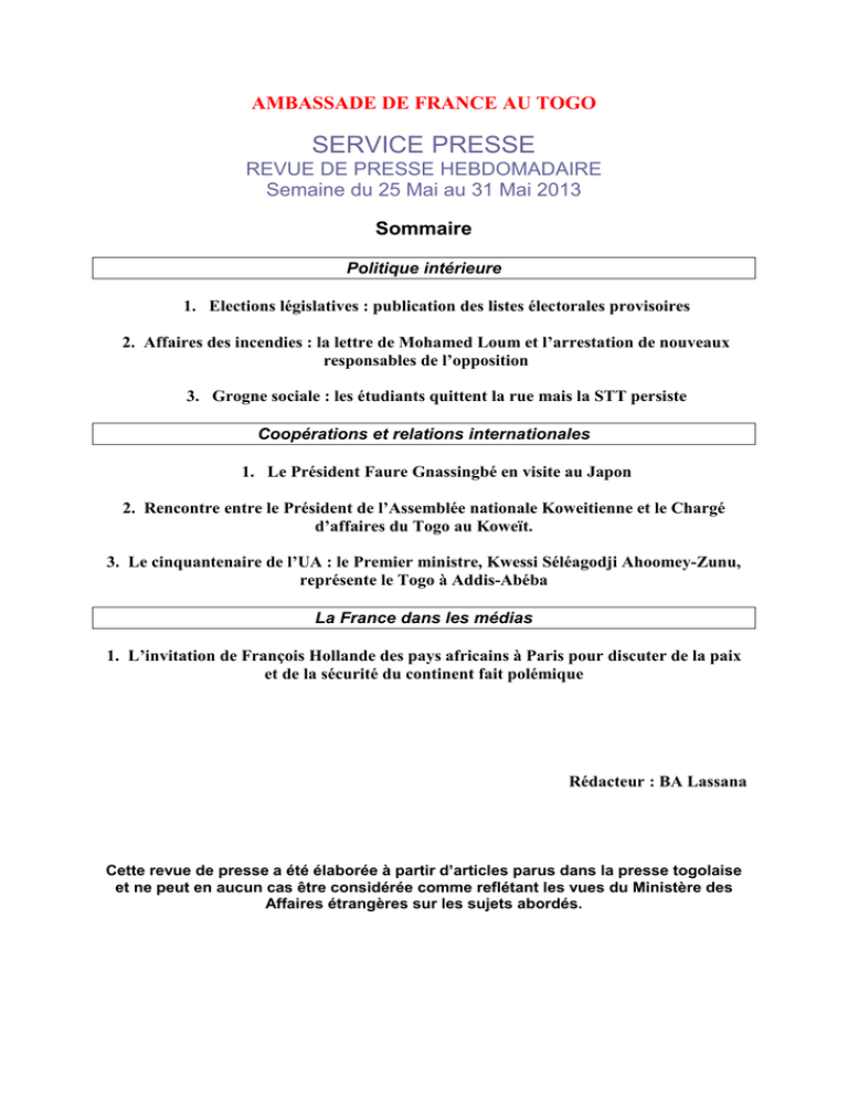 AMBASSADE DE FRANCE AU TOGO SERVICE PRESSE REVUE DE PRESSE HEBDOMADAIRE Semaine du 25 Mai au 31 Mai 2013 Sommaire Politique intérieure 1. Elections législatives : publication des listes électorales provisoires 2. Affaires des incendies : la lettre de Mohamed Loum et l’arrestation de nouveaux responsables de l’opposition 3. Grogne sociale : les étudiants quittent la rue mais la STT persiste Coopérations et relations internationales 1. Le Président Faure Gnassingbé en visite au Japon 2. Rencontre entre le Président de l’Assemblée nationale Koweitienne et le Chargé d’affaires du Togo au Koweït. 3. Le cinquantenaire de l’UA : le Premier ministre, Kwessi Séléagodji Ahoomey-Zunu, représente le Togo à Addis-Abéba La France dans les médias 1. L’invitation de François Hollande des pays africains à Paris pour discuter de la paix et de la sécurité du continent fait polémique Rédacteur : BA Lassana Cette revue de presse a été élaborée à partir d’articles parus dans la presse togolaise et ne peut en aucun cas être considérée comme reflétant les vues du Ministère des Affaires étrangères sur les sujets abordés. Politique intérieure Elections législatives : publication des listes électorales provisoires Togo presse publie le communiqué de la CENI portant à la connaissance du public que les listes électorales provisoires seront finalement affichées le mardi 28 mai. Les réclamations sont prévues pour les 29 et 30 mai. En effet, la CENI invite les personnes qui ont plus d’une carte d’électeur à les restituer à la CELI de leur ressort sous peine d’être radiées. Affaires des incendies : la lettre de Mohamed Loum et l’arrestation de nouveaux responsables de l’opposition Gilbert Bawara annonce que le rapport des experts français contient des chiffres et des schémas que le commun des citoyens ne comprendrait pas. La lettre de Mohamed Loum Liberté fait état de nouvelles révélations dans l’affaire d’incendies des marchés. Mohamed Loum interpelle la France et la communauté internationale afin qu’elles se préoccupent de la situation politique au Togo et du sort des prisonniers politiques. Il cite des noms de responsables politiques parmi lesquels figurent le Président Faure Gnassingbé et Ingrid Awadé, directrice des impôts, comme étant les manipulateurs de la vague d’arrestations contre les responsables de l’opposition. Arrestation de responsables de l’opposition Forum de la semaine rapporte que le Commandant Amah, Président de l’association des victimes de la torture (ASVITO), est placé en détention à la prison civile de Lomé. Abass Kaboua, Président du Mouvement des Républicains Centristes (MRC), est également rappelé à l’ordre dans l’affaire des incendies des marchés. Il lui est reproché d’avoir cité des responsables du pouvoir comme étant les instigateurs des incendies de marchés. Le 30 mai, Forum de la semaine annonce l’arrestation d’Abass Kaboua. Togotélégramme228 précise qu’il est arrêté pour ne pas avoir respecté les clauses de sa liberté conditionnelle, en l’espèce l’interdiction de sortir de la Commune de Lomé et de se prononcer sur l’affaire des incendies. Forum de la semaine affirme qu’il est finalement déféré à la prison civile de Notsé pour avoir bradé son rappel à l’ordre. Le Commandant Amah est, quant à lui, déféré à la prison de Mango. Par ailleurs, la Coalition Arc-en-ciel dénonce dans un communiqué l’incarcération du Commandant récusant toute idée d’incitation à la révolte de l’armée dans les propos du Commandant. Le CST réclame sa libération inconditionnelle et demande au pouvoir de cesser les dérives liberticides. Ce pendant, la FIDH (Fédération Internationale des Ligues des Droits de l’Homme) a adopté une résolution d’urgence lors de son 38e Congrès (du 22 au 26 mai) à Istanbul. Selon Liberté, les participants ont épinglé les dégradations des droits de l’Homme et condamnent la pratique persistante de la torture au Togo. Ils appellent également les autorités à publier le rapport des experts français sur les incendies. Le 28 mai, EDH (association Ensemble pour les Droits de l’Homme) condamne la détention du Commandant Olivier Amah et exige sa libération. Selon le Président de l’association, Jil-Benoit K. Afangbédji, compte tenu de l’article 26 alinéa 2 de la Constitution, la détention du Commandant Amah n’a pas de justification. Grogne sociale : les étudiants quittent la rue mais la STT persiste Selon Forum de la semaine, les négociations entre la STT et le gouvernement se soldent par un échec. Par conséquent, la Synergie réactive sa menace de grève de deux jours. Il précise également que la STT donne un moratoire au gouvernement afin de se rattraper. Tingo-Tingo indique que le gouvernement refuse d’appliquer le bonus à tous les travailleurs. Forum de la semaine laisse entendre que les travailleurs dénoncent le dilatoire du gouvernement et exigent la satisfaction de toutes leurs revendications. Liberté signale que la STT appelle à une nouvelle grève le jeudi et le vendredi. En effet, les travailleurs ont levé, le 28 mai, la suspension du mot d’ordre de grève et appellent à cesser le travail. Ils réclament le paiement de l’allocation forfaitaire. La STT précise que cette grève est reconductible en cas de non satisfaction de ses revendications. Reprise des cours et libération des étudiants arrêtés Lors d’une interview, le Colonel Yark Damehame, Ministre de la sécurité et de la protection civile, a martelé que l’interdiction des manifestations visait à préserver la paix. Il souligne également que si les gens veulent manifester qu’ils le fassent dans la légalité. Forum de la semaine annonce que les quatre étudiants arrêtés lors des manifestations ont été libérés. Gilbert Bawara, Ministre de l’administration territorial s’en réjouit et rap