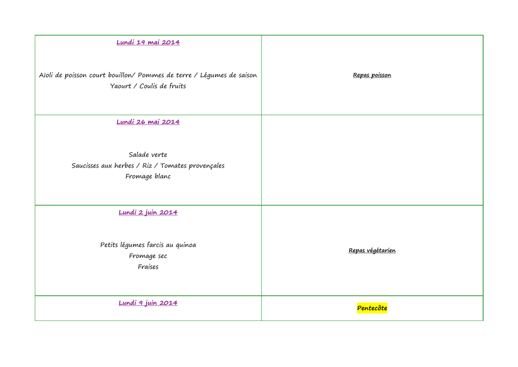 Lundi 19 mai 2014 Aïoli de poisson court bouillon/ Pommes de terre / Légumes de saison Repas poisson Yaourt / Coulis de fruits Lundi 26 mai 2014 Salade verte Saucisses aux herbes / Riz / Tomates provençales Fromage blanc Lundi 2 juin 2014 Petits légumes farcis au quinoa Fromage sec Repas végétarien Fraises Lundi 9 juin 2014 Pentecôte Lundi 16 juin 2014 Séverine absente : repas des adhérents Assiette de crudité Taboulé Repas froid Viande froide Flan caramel Lundi 23 juin 2014 Salade verte Moussaka Fruits de saison Lundi 30 juin 2014 Salade tomate / Basilic Cuisse de poulet Polenta Glace Dernier repas pris au centre social pour cette année scolaire