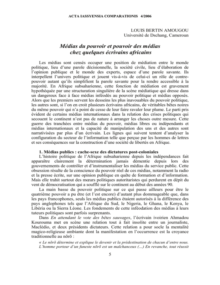 ACTA IASSYENSIA COMPARATIONIS 4/2006 LOUIS BERTIN AMOUGOU Université de Dschang, Cameroun Médias du pouvoir et pouvoir des médias chez quelques écrivains africains Les médias sont censés occuper une position de médiation entre le monde politique, lieu d’une parole décisionnelle, la société civile, lieu d’élaboration de l’opinion publique et le monde des experts, espace d’une parole savante. Ils interpellent l’univers politique et jouent vis-à-vis de celui-ci un rôle de contrepouvoir autant qu’ils simplifient la parole savante pour la rendre accessible à la majorité. En Afrique subsaharienne, cette fonction de médiation est gravement hypothéquée par une structuration singulière de la scène médiatique qui dresse dans un dangereux face à face médias inféodés au pouvoir politique et médias opposés. Alors que les premiers servent les desseins les plus inavouables du pouvoir politique, les autres sont, si l’on en croit plusieurs écrivains africains, de véritables bêtes noires du même pouvoir qui n’a point de cesse de leur faire ravaler leur plume. Le parti pris évident de certains médias internationaux dans la relation des crises politiques qui secouent le continent n’est pas de nature à arranger les choses outre mesure. Cette guerre des tranchées entre médias du pouvoir, médias libres ou indépendants et médias internationaux et la capacité de manipulation des uns et des autres sont narrativisées par plus d’un écrivain. Les lignes qui suivent tentent d’analyser la configuration du secteur de l’information telle que perçue par les hommes de lettres et ses conséquences sur la construction d’une société de libertés en Afrique. 1. Médias publics : cache-sexe des dictatures post-coloniales L’histoire politique de l’Afrique subsaharienne depuis les indépendances fait apparaître clairement la détermination jamais démentie depuis lors des gouvernements de contrôler et d’instrumentaliser les médias du service public. Cette obsession résulte de la conscience du pouvoir réel de ces médias, notamment la radio et la presse écrite, sur une opinion publique en quête de formation et d’information. Mais elle trahit surtout des mœurs politiques autoritaristes qui perdurent en dépit du vent de démocratisation qui a soufflé sur le continent au début des années 90. La main basse du pouvoir politique sur ce qui passe ailleurs pour être le quatrième pouvoir a pu être (et l’est encore) d’autant plus dommageable que, dans les pays francophones, seuls les médias publics étaient autorisés à la différence des pays anglophones tels que l’Afrique du Sud, le Nigeria, le Ghana, le Kenya, le Libéria ou la Sierra Léone. Les fondements de cette inféodation des médias à leurs tuteurs politiques sont parfois surprenants. Dans En attendant le vote des bêtes sauvages, l’écrivain ivoirien Ahmadou Kourouma met en scène une relation tout à fait insolite entre un journaliste, Maclédio, et deux présidents dictateurs. Cette relation a pour socle la mentalité magico-religieuse ambiante dont la manifestation en l’occurrence est la croyance traditionnelle au nõrõ : « Le nõrõ détermine et explique le devenir et la prédestination de chacun d’entre nous. L’homme porteur d’un funeste nõrõ est un malchanceux (…) En revanche, tout réussit 5 ACTA IASSYENSIA COMPARATIONIS 4/2006 au titulaire d’un heureux nõrõ (…) Le porteur du funeste nõrõ se débattra en vain dans sa deveine tant qu’il ne rencontrera pas le détenteur du nõrõ contraire, le nõrõ 1 neutralisateur. » Maclédio est, croit-il, de ceux qui sont nés avec un nõrõ funeste. Lorsqu’il répond à l’appel de Nkoutigui Fondio2, le président dictateur de la République des Monts, il croit avoir reconnu en lui son « homme de destin ». C’est que les superstitions traditionnelles ici accréditent l’idée selon laquelle « la rencontre, la vie avec le bénéficiaire du nõrõ opposé annihilent la damnation (…) Les porteurs des funestes nõrõ qui attrapent leur homme de destin deviennent immédiatement des bienheureux3 ». Aussitôt nommé directeur général adjoint de Radio-Capitale, Maclédio jure « fidélité jusqu’au sacrifice suprême4 » à son nouveau maître. A la demande de ce dernier, il se sépare de son épouse au profit d’une maîtresse du despot avant de se convertir à l’Islam, la religion de son mentor. Il devient ainsi un proche, un familier, un parent de Nkoutigui qui le propulse «responsable de l’idéologie à la radio5 » En partageant avec Nkoutigui, le guide suprême, la même femme, très souvent le même toit, le même repas et la même religion, Macledio figure parfaitement l’univers médiatique public des pays africains à l’époque des partis uniques. Nkoutigui Fondio, puis le général dictateur Koyaga6 de la République du Golfe qu’il servira par la suite sans état d’âme (passant ainsi du socialisme africain au capitalisme dur) sont quant à eux des métaphores de la classe des dirigeants africains de la première heure. Le soutien univoque des médias publics aux gouvernements trouve ainsi son explication dans le concubinage malsain du pouvoir politique avec la radio et la presse gouvernementales. Bingo, le narrateur du roman de Kourouma convoque une métaphore judicieuse pour décrire cet état de choses : « Maclédio est devenu votre pou à vous, Koyaga, perpétuellement collé à vous. Il reste votre caleçon oeuvrant partout où vous êtes pour cacher vos parties honteuses. Cacher votre honte et votre déshonneur».7 Tout compte fait, Maclédio apparaît comme l’allégorie de l’inféodation inconditionnelle, à la limite de l’irrationnel, des médias du service public au pouvoir politique qui les instrumentalise contre d’exorbitants privilèges financiers et matériels. Entre les mains des pères de la nation et autre guides éclairés, ces 1 Ahmadou Kourouma, 