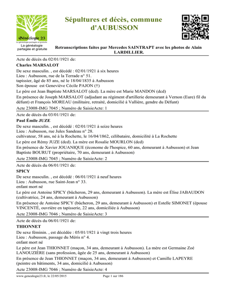 Sépultures et décès, commune d'AUBUSSON La généalogie partagée et gratuite Retranscriptions faites par Mercedes SAINTRAPT avec les photos de Alain LARDILLIER. Acte de décès du 02/01/1921 de: Charles MARSALOT De sexe masculin. , est décédé : 02/01/1921 à six heures Lieu : Aubusson, rue de la Terrade n° 51. tapissier, âgé de 85 ans, né le 18/04/1835 à Aubusson Son épouse est Geneviève Cécile PAJON (†) Le père est Jean Baptiste MARSALOT (dcd). La mère est Marie MANDON (dcd) En présence de Joseph MARSALOT (adjudant au régiment d'artillerie demeurant à Vernon (Eure) fil du défunt) et François MOREAU (militaire, retraité, domicilié à Vallière, gendre du Défunt) Acte 23008-IMG 7045 ; Numéro de SaisieActe: 1 Acte de décès du 03/01/1921 de: Paul Émile JUZE De sexe masculin. , est décédé : 02/01/1921 à seize heures Lieu : Aubusson, rue Jules Sandeau n° 28. cultivateur, 58 ans, né à la Rochette, le 16/04/1862, célibataire, domicilité à La Rochette Le père est Rémy JUZE (dcd). La mère est Rosalie MOURLON (dcd) En présence de Xavier JOUANIQUE (économe de l'hospice, 60 ans, demeurant à Aubusson) et Jean Baptiste BOURUT (propriétaire, 70 ans, demeurant à Aubusson) Acte 23008-IMG 7045 ; Numéro de SaisieActe: 2 Acte de décès du 06/01/1921 de: SPICY De sexe masculin. , est décédé : 06/01/1921 à neuf heures Lieu : Aubusson, rue Saint-Jean n° 33. enfant mort né Le père est Antoine SPICY (bûcheron, 29 ans, demeurant à Aubusson). La mère est Élise JABAUDON (cultivatrice, 24 ans, demeurant à Aubusson) En présence de Antoine SPICY (bûcheron, 29 ans, demeurant à Aubusson) et Estelle SIMONET (épouse VINCENTÉ, ouvrière en tapisserie, 22 ans, domiciliée à Aubusson) Acte 23008-IMG 7046 ; Numéro de SaisieActe: 3 Acte de décès du 06/01/1921 de: THIONNET De sexe féminin. , est décédée : 05/01/1921 à vingt trois heures Lieu : Aubusson, passage du Méris n° 4. enfant mort né Le père est Jean THIONNET (maçon, 34 ans, demeurant à Aubusson). La mère est Germaine Zoé LANOUZIÈRE (sans profession, âgée de 25 ans, demeurant à Aubusson) En présence de Jean THIONNET (maçon, 34 ans, demeurant à Aubusson) et Camille LAPEYRE (peintre en bâtiments, 34 ans, domicilié à Aubusson) Acte 23008-IMG 7046 ; Numéro de SaisieActe: 4 www.genealogie23.fr, le 22/05/2015 Page 1 sur 186 Acte de décès du 09/01/1921 de: Marie Octave Henri Jérome JANISSON De sexe masculin. , est décédé : 08/01/1921 à dix-neuf heures Lieu : Aubusson, rue de Clermont n° 16. 45 ans, cimentier, né à Clairavaux le 31/05/1875, célibataire, domiciliée à Aubusson (la Seiglière) Le père est Pierre Henri Pascal JANISSON. La mère est Marie Louise BEYBE En présence de Pierre Henri Pascal JANISSON (propriétaire, âgé de 69 ans, demeurant à Aubusson, père du défunt) et Jean Baptiste BOURUT (propriétaire, âge de 70 ans, demeurant à Aubusson) Acte 23008-IMG 7046 ; Numéro de SaisieActe: 5 Acte de décès du 11/01/1921 de: Marie Madeleine PINON De sexe féminin. , est décédée : 11/01/1921 à douze heures Lieu : Aubusson, rue Jules Sandeau n° 28. cultivatrice, 69 ans, née à Champagnat le 09/11/1851, domicilié à St-Médard Son époux est François GALITRE (†) Le père est François PINON (dcd). La mère est Anne MAILLARY (dcd) En présence de Xavier JOUANIQUE (économe de l'hospice, âgé de 60 ans, demeurant à Aubusson) et Jean Baptiste BOURUT (propriétaire, âgé de 70 ans, demeurant à Aubusson) Acte 23008-IMG 7046 ; Numéro de SaisieActe: 6 Acte de décès du 17/01/1921 de: Étienne PICAUD De sexe masculin. , est décédé : 17/01/1921 à deux heures Lieu : Aubusson, rue des Tanneurs. tapissier, 79 ans, né à Aubusson, le 0/10/1841, y domicilié Son épouse est Anne BACAUD (†) Le père est François PICAUD (dcd). La mère est Marie BARLET (dcd) En présence de Joseph FOUGEROL (tapissier, âgé de 29 ans, gendre du défunt, demeurant à Aubusson) et François PICAUD (boulanger, âgé de 21 ans, petit-fils du défunt, demeurant à Aubusson) Acte 23008-IMG 7046 ; Numéro de SaisieActe: 7 Acte de décès du 19/01/1921 de: Marguerite Madeleine Germaine FIALLET De sexe féminin. , est décédée : 19/01/1921 à quatre heures Lieu : Aubusson, Place des Tanneurs n° 2. 22 ans, ouvirère en tapisserie, née à Aubusson le 23/07/1898, domiciliée à Aubusson Son époux est Auguste Alexandre BONNAEYRAT (domicilié à Aubusson) Le père est Georges FIALLET (dcd). La mère est Marie SALAGNAT En présence de Toussaint BORDOVACH (tapissier, âgé de 32 ans, beau-frère de le défunte, domicilié à Aubusson) et Eugène COMBAT (tapisssier, âgé de 26 ans, voisin de la défunte, domicilié à Aubusson) Acte 23008-IMG 7046 ; Numéro de SaisieActe: 8 www.genealogie23.fr, le 22/05/2015 Page 2 sur 186 Acte de décès du 23/01/1921 de: François Victor GANNET De sexe masculin. , est décédé : 23/01/1921 à une heure Lieu : Aubusson, rue Vaveix n° 23. tapissier, 45 ans, né à Aubusson le 18/07/1875, domicilié à Aubusson Son épouse est Pauline RICARDON (domiciliée à Aubusson) Le père est Antoine Hippolyte GANNET (dcd). La mère est Mariette SERTILLANGE En présence de Antoine GANNET (tapissier, âgé de 43 ans, frère du défunt, demeurant à Aubusson) et Alexandre PANGAUD (directeur de fabrique, âgé de 38 ans, beau-frère du défunt, demeurant à Aubusson) Acte 23008-IMG 7047 ; Numéro de SaisieActe: 11 Acte de décès du 23/01/1921 de: Gustave Augustin SATIZELLE De sexe masculin. , est décédé : 22/01/1921 à dix-sept heures Lieu : Aubusson, rue Saint-Jean n° 33. fondeur, 57 ans, né à Séry (Aisne) le 26/04/1863, domicilié à Aubusson Son épouse est Eugénie MOINEAU (†) Le père est Charles Zéphirin SATIZELLE (dcd). La mère est Joséphine Célestine MORIX (dcd) En présence de François MÉRIGNAT (tisseur, âgé de 48 ans, demeurant à Aubusson) et Georges PALISSON (tapissier, âgé de 37 ans, demeurant à Aubusson) Acte 23008-IMG 7047 ; 