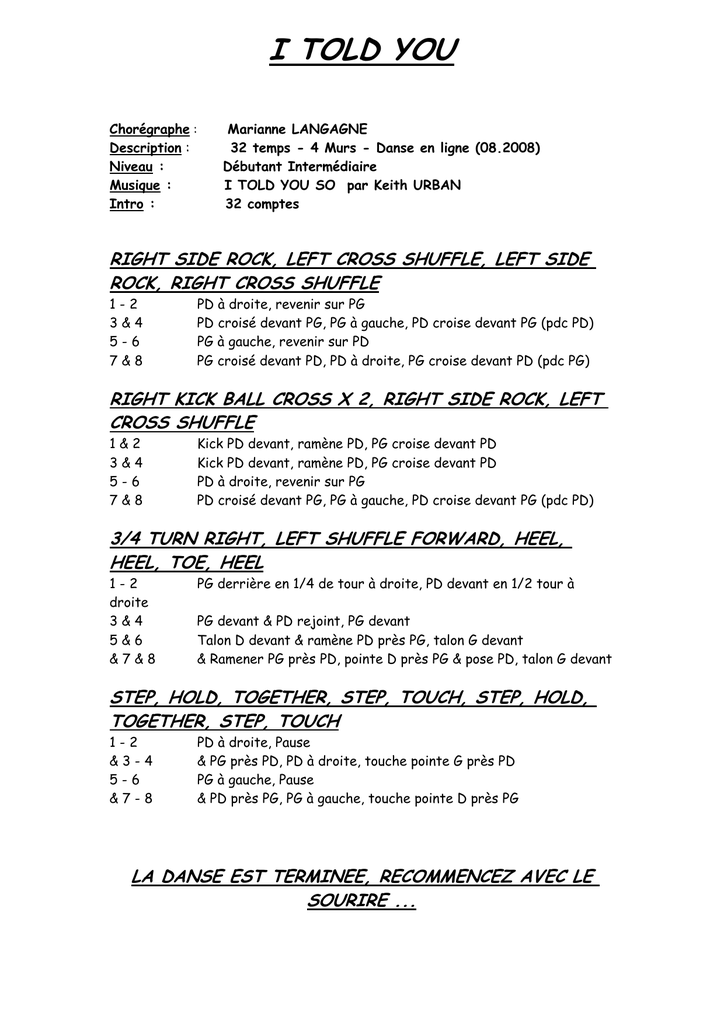 I TOLD YOU Chorégraphe : Description : Niveau : Musique : Intro : Marianne LANGAGNE 32 temps - 4 Murs - Danse en ligne (08.2008) Débutant Intermédiaire I TOLD YOU SO par Keith URBAN 32 comptes RIGHT SIDE ROCK, LEFT CROSS SHUFFLE, LEFT SIDE ROCK, RIGHT CROSS SHUFFLE 1-2 3&4 5-6 7&8 PD à droite, revenir sur PG PD croisé devant PG, PG à gauche, PD croise devant PG (pdc PD) PG à gauche, revenir sur PD PG croisé devant PD, PD à droite, PG croise devant PD (pdc PG) RIGHT KICK BALL CROSS X 2, RIGHT SIDE ROCK, LEFT CROSS SHUFFLE 1&2 3&4 5-6 7&8 Kick PD devant, ramène PD, PG croise devant PD Kick PD devant, ramène PD, PG croise devant PD PD à droite, revenir sur PG PD croisé devant PG, PG à gauche, PD croise devant PG (pdc PD) 3/4 TURN RIGHT, LEFT SHUFFLE FORWARD, HEEL, HEEL, TOE, HEEL 1-2 droite 3&4 5&6 &7&8 PG derrière en 1/4 de tour à droite, PD devant en 1/2 tour à PG devant & PD rejoint, PG devant Talon D devant & ramène PD près PG, talon G devant & Ramener PG près PD, pointe D près PG & pose PD, talon G devant STEP, HOLD, TOGETHER, STEP, TOUCH, STEP, HOLD, TOGETHER, STEP, TOUCH 1-2 &3-4 5-6 &7-8 PD à droite, Pause & PG près PD, PD à droite, touche pointe G près PD PG à gauche, Pause & PD près PG, PG à gauche, touche pointe D près PG LA DANSE EST TERMINEE, RECOMMENCEZ AVEC LE SOURIRE ...