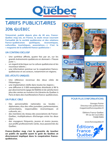 Tarifs publicitaires 2016 Québec Trimestriel, publié depuis plus de 40 ans, FranceQuébec mag est, en France, la seule revue couvrant l’actualité de la société québécoise et des relations franco-québécoises (politiques, économiques, culturelles, touristiques, associatives…). C’est le « magazine de la solidarité franco-québécoise » UN CONTENU EXCLUSIF • Une synthèse affinée, quatre fois par an, sur les grands événements québécois en donnant « l’heure juste » ; • un regard éclectique sur la culture québécoise et les nouveaux talents ; • une information pointue sur la coopération francoquébécoise et ses acteurs, notamment en régions. DES ATOUTS UNIQUES • Une référence reconnue des deux côtés de l’Atlantique ; • une implantation réelle dans toutes les régions ; • une diffusion à 3 000 exemplaires distribués à 98 % par abonnements (gage de fidélité et de satisfaction) plus des ventes au numéro à la Librairie du Québec à Paris et dans des manifestations franco-québécoises. UN PUBLIC CIBLÉ • Des personnalités nationales ou locales : diplomates, élus des villes jumelées, parlementaires, universitaires, responsables économiques et culturels, etc ; • des membres du réseau des associations de FranceQuébec, multiplicateurs d’échanges entre les deux pays ; • des voyageurs fréquents, jeunes et moins jeunes, aux profils professionnels variés, tous passionnés du Québec. France-Québec mag c’est la garantie de toucher un public de qualité ayant le goût du Québec et directement impliqué dans la coopération francoquébécoise. Pour plus d’informations Georges Poirier Directeur des publications [email protected] Éditions France-Québec 94 rue de Courcelles 75008 PARIS www.francequebec.fr Tarifs publicitaires 2016 - Québec FORMAT (Largeur x Hauteur) Double page Publicité ou Publireportage 4e de couverture Sous réserve de disponibilité (L 21 x H 28 cm) 2e de couverture Face au sommaire Page intérieure recto Page intérieure verso Demi-page horizontal (L 19 x H 13 cm) vertical (L 9 x H 27 cm) Quart de page horizontal (L 19 x H 6 cm) vertical (L 9 x H 13 cm) Carte d’affaires horizontal (L 9 x H 5 cm) vertical (L 5 x H 9 cm) UNE PARUTION DEUX TROIS PARUTIONS PARUTIONS (dégressif : 5 %) (dégressif : 13 %) QUATRE PARUTIONS (dégressif : 25 %) 1 400 $ CA 2 600 $ CA 3 600 $ CA 4 200 $ CA 1 100 $ CA 2 000 $ CA 2 800 $ CA 3 300 $ CA 950 $ CA 1 800 $ CA 2 400 $ CA 2 800 $ CA 800 $ CA 700 $ CA 1 500 $ CA 1 300 $ CA 2 000 $ CA 1 800 $ CA 2 400 $ CA 2 100 $ CA 500 $ CA 950 $ CA 1 300 $ CA 1 500 $ CA 280 $ CA 500 $ CA 700 $ CA 800 $ CA 140 $ CA 260 $ CA 360 $ CA 400 $ CA Tarifs bruts en dollars canadiens pour publicité couleur. Pas de taxes. Tarifs calculés selon la moyenne du taux de change du 1er semestre de 2016 (1 €/EUR = 1,40 $ CA/CAD). Conditions tarifitaires applicables à partir du 1er janvier 2016. Formats (ajouter au moins 5 mm de bords perdus et les traits de coupe) Double page Demi-page Quart de page Carte d’affaires Pleine page Demi-page Quart de page Carte d’affaires (2 pages de L 21 x H 28 cm) (L 21 x H 28 cm) horizontal (L 19 x H 13 cm) vertical (L 9 x H 27 cm) horizontal (L 19 x H 6 cm) vertical (L 9 x H 13 cm) horizontal (L 9 x H 5 cm) vertical (L 5 x H 9 cm) Tarifs publicitaires 2016 - Québec Calendrier des parutions Quatre numéros par an : • • • • N° 175 : mai 2016 N° 176 : août 2016 N° 177 : novembre 2016 N° 178 : février 2017 Ordre d’insertion À envoyer 6 semaines minimum avant parution. Conditions tarifaires (dégressifs sur la base du tarif brut HT) Remise nouvel annonceur : 5 % S’applique sur le premier ordre d’insertion. Remise multiples parutions (voir grille) : de 5 à 25 % Dégressifs supérieurs à ceux généralement en vigueur (entre 3 et 15%). Remise fidélité : + 10 % À partir de la deuxième année ou de la 5e insertion consécutives. Remise partenaires : + 20 % Pour des annonceurs soutenant des activités du réseau associatif. Remise professionnelle : + 15 % Pour des annonceurs ayant recours à un mandataire. Conditions techniques Éléments à remettre par courriel 4 semaines avant parution. Fournir fichier en PDF haute définition, CMJN, 300 dpi minimum, généré uniquement avec InDesign, Xpress, Illustrator, Photoshop, Word avec photos et polices incorporées. Les fichiers basse définition ou de type bureautique seront refusés. Les doubles pages sont à livrer en deux fichiers simple page. IMPORTANT : Ajouter au format de l’annonce au moins 5 mm de bords perdus et les traits de coupe. Ils nous ont déjà fait confiance Organismes officiels Tourisme • • • • • • • • • • • • • • • • • • • • • • • • • • • • • • • • • • • • • • • Agence de la Francophonie (Paris) Amitiés France-Acadie CNED (France) Conseil Régional Rhône-Alpes La Documentation Française (Paris) Investissement Québec La Monnaie de Paris Ministère des Affaires internationales (Québec) Ministère de l’Immigration et des Communautés culturelles (Québec) Ministère des Affaires étrangères (Paris) Ministère de la Culture (Québec) Ministère de l’Agriculture (Québec) Villes de Châtel-Guyon, Laval et Lyon (France) Ville de Québec Librairie et éditeurs • • • • • • • • • • • • Bibliothèque québécoise (Montréal) Librairie du Québec (Paris) Groupe Ville-Marie-Littérature (Montréal) Henri Rivard Editeur (Québec) Les Publications du Québec (Montréal) Généalogie Magazine (Paris) Les Guides du Jour-Sojides (Montréal) La Chasse Galerie (Montréal) L’Action Nationale (Montréal) Libre Expression (Montréal) Editions Ulysse (Montréal) Editions du Seuil (Paris) Hôtellerie et Restauration • • • • • • • • • • • • • • • • • Auberge des Jardins de la Gare (Montréal) L’Antre Amis (Paris) L’Auberge Alternative du Vieux-Montréal