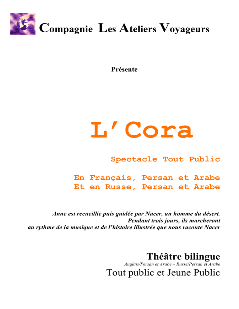 Compagnie Les Ateliers Voyageurs Présente L’Cora Spectacle Tout Public En Français, Persan et Arabe Et en Russe, Persan et Arabe Anne est recueillie puis guidée par Nacer, un homme du désert. Pendant trois jours, ils marcheront au rythme de la musique et de l’histoire illustrée que nous raconte Nacer Théâtre bilingue Anglais/Persan et Arabe – Russe/Persan et Arabe Tout public et Jeune Public Les Ateliers Voyageurs NOTE DE L’AUTEUR Inspiré d’un conte persan du XIIe siècle « Le pavillon turquoise » de Nézami, ce spectacle propose un voyage initiatique d’une jeune française « Anne » guidée par l’homme du désert « Nacer » .Deux cultures, deux langues, deux personnages qui doivent s’aider et se comprendre pendant quelques jours….. Dès lors une rencontre est possible. Ce spectacle nous propose un autre chemin que celui de l’affrontement stérile né essentiellement de l’ignorance. C’est l’histoire de la différence culturelle qui doit être outil de construction. Ce conte métaphorique ne cesse de le dire. C’est une autre alternative qui consiste à lutter au quotidien certes, mais pour construire ensemble et non pour détruire. Il vise à toucher une population qui sans aucun doute sera émue de partager un voyage symbolique dans les terres et la culture d’un pays que certains ne connaissent pas ou peu et dont d’autres portent les racines… C’est un désir de paix et d’ouverture qui porte notre ambition à poursuivre loin cette aventure. Irène Golovine Les Ateliers Voyageurs EXTRAIT DU SPECTACLE Nacer un habitant du désert sorti des dunes de sable entre. Il chante, il regarde l’horizon et voit Anne. Gar bar falakam dast bodi tchoon yazdân … Nacer : Âh ! meskine …. Inna Lillâhva innâ elayha râdjéoone … almote (Morte) Il l’a recouvre de sable et lui rend cérémonie. Anne se soulève et se réveille soudain, tous les deux prennent peur. Besmelâh … chéytâne Anne : Ah vous m’avez fait peur ! Nacer : Que faites vous dans le désert ? Métrafiche ! tché mikoni andarine sahrâ ? Anne : vous parlez français ? Nacer : Que faites vous ici ? Ahha ! tché mikoni andarine ? Anne : vous parlez français, vous me comprenez ? Nacer : parsi midani ?Tkallom Al Arabia ? Anne : vous avez à boire Nacer : Tu parles arabe ? Arabi Midâni ? Anne : à boire ? Nacer : Cette eau est précieuse … Mâ é va lâken por bahâ ! Anne : à boire, à boire, donne moi à boire, s’il te plaît à boire Nacer : (gromelots) – Khiyâl mikoné… Anne : merci. Encore ? Nacer : (gromelots) Nacer râle et montre le soleil. Chems … Il lui donne à boire, Anne revient en rampant, vers ses affaires éparpillées. Nacer ; chèvre ? Kharrouf ? Anne : hein Nacer : Bêêh … Anne : Girafe Nacer : jarouffe Ah ! Salâ mon aleykoum yâ jarouffe Anne ; gigi Nacer Salamon aléykom gigi ! (il s’asseoit auprès d’Anne et prépare le thé) Sahara, Cheytân,Hnoucha… attention, madame ! Anne : Madame ? vous parlez le français Nacer : Non, oui Les Ateliers Voyageurs HISTORIQUE DE LA COMPAGNIE Les Ateliers Voyageurs a vu le jour en 1996. Elle a été créée à l’initiative de Irène GOLOVINE comédienne. L’équipe rassemble des personnes venues d’horizons différents qui sont réunies autour de leur savoir faire et de leur passion du Théâtre, de la Musique, des Arts graphiques, de l’écriture. Irène GOLOVINE au cours d’un séjour de cinq années aux Etats-Unis, a participé avec un mime et un metteur en scène à un projet d’enseignement du français par le biais du théâtre. De retour en France, elle a fait le choix de développer un concept original en proposant l’initiation et l’apprentissage de l’anglais à travers le jeu théâtral au sein des Ateliers Voyageurs. Les Ateliers Voyageurs mis en place dès 1996, sont des ateliers d’anglais par le théâtre au théâtre des Déchargeurs à Paris, à Houilles dans les Yvelines, puis dans divers établissements des environs. En 1999, inspirée par l’imagination des enfants, partant d’un concept fort simple : comment faire quand on n’y comprend rien, Irène GOLOVINE crée un spectacle bilingue anglais/français « BALLOON ». Ce spectacle est joué régulièrement à Paris et en région parisienne depuis juin 1999. A Dublin, à l’Alliance française, il donne naissance à un après-midi d’échanges autour d’improvisations théâtrales en trois langues. Les Ateliers Voyageurs, après ce succès, décide de donner une suite à ce spectacle. Irène GOLOVINE constatant les réactions positives et enjouées de ses élèves et du public, entreprend l’écriture en trois langues,Français/Persan/Arabe de : L’Cora La suite de « BALLOON ». Ces deux spectacles autonomes forment un tout qui, par le choix de leur thématique et la qualité des artistes qui ont travaillé sur ces créations, ont su intéresser le directeur du théâtre Dejazet, Jean Bouquin. Les Ateliers Voyageurs En partenariat avec la DRAC, le Conseil Général des Yvelines, l’Etat (politique de la ville), le FASILD, la Fondation Mc Donald, la Fondation Vivendi. Ces partenaires ont aussi permis aux Ateliers Voyageurs de réaliser en parallèle des ateliers multi-langues et multiculturels. Notamment à Achères dans les Yvelines où les enfants ont pu jouer en amont de L’Cora Les Ateliers Voyageurs En collaboration avec des organismes comme l’Alliance Française, la Mission Ville, les Maisons de Quartier, les Centres Culturels, les Municipalités, Les Ateliers Voyageurs s’attache à travailler avec le public sur la cohabitation des langues et des cultures. Les Ateliers Voyageurs a pour objet de promouvoir l’apprentissage, la connaissance, la transmission des langues et des traditions culturelles à travers l’expression artistique et le jeu théâtral par la mise en place d’ateliers d’expressions artistiques bilingues, la création de spectacles vivants bilingues. Les Ateliers Voyageurs ‘Les 