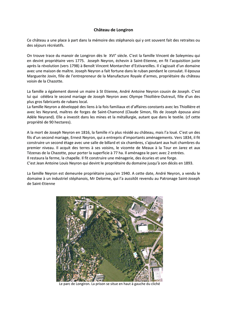 Château de Longiron Ce château a une place à part dans la mémoire des stéphanois qui y ont souvent fait des retraites ou des séjours récréatifs. On trouve trace du manoir de Longiron dès le XVI° siècle. C’est la famille Vincent de Soleymieu qui en devint propriétaire vers 1775. Joseph Neyron, échevin à Saint-Etienne, en fit l’acquisition juste après la révolution (vers 1798) à Benoît Vincent Montarcher d’Estivareilles. Il s’agissait d’un domaine avec une maison de maître. Joseph Neyron a fait fortune dans le ruban pendant le consulat. Il épousa Marguerite Jovin, fille de l’entrepreneur de la Manufacture Royale d’armes, propriétaire du château voisin de la Chazotte. La famille a également donné un maire à St Etienne, André Antoine Neyron cousin de Joseph. C’est lui qui célébra le second mariage de Joseph Neyron avec Olympe Thiollière-Dutreuil, fille d’un des plus gros fabricants de rubans local. La famille Neyron a développé des liens à la fois familiaux et d’affaires constants avec les Thiollière et avec les Neyrand, maîtres de forges de Saint-Chamond (Claude Simon, fils de Joseph épousa ainsi Adèle Neyrand). Elle a investit dans les mines et la métallurgie, autant que dans le textile. (cf cette propriété de 90 hectares). A la mort de Joseph Neyron en 1816, la famille n’a plus résidé au château, mais l’a loué. C’est un des fils d’un second mariage, Ernest Neyron, qui a entrepris d’importants aménagements. Vers 1834, il fit construire un second étage avec une salle de billard et six chambres, s’ajoutant aux huit chambres du premier niveau. Il acquit des terres à ses voisins, le vicomte de Meaux à la Tour en Jarez et aux Tézenas de la Chazotte, pour porter la superficie à 77 ha. Il aménagea le parc avec 2 entrées. Il restaura la ferme, la chapelle. Il fit construire une ménagerie, des écuries et une forge. C’est Jean Antoine Louis Neyron qui devint le propriétaire du domaine jusqu’à son décès en 1893. La famille Neyron est demeurée propriétaire jusqu’en 1940. A cette date, André Neyron, a vendu le domaine à un industriel stéphanois, Mr Delorme, qui l’a aussitôt revendu au Patronage Saint-Joseph de Saint-Etienne Le parc de Longiron. La prison se situe en haut à gauche du cliché Aujourd’hui, Longiron est géré par Saint-Vincent de Paul. Il abrite une maison de retraite, ainsi qu’un centre aéré avec une piscine. Ce centre, organisé en patronage, accueille 400 enfants par an. La ferme Court associée au domaine a cédé la place à la maison d’arrêt départementale en 1966 et il n’en reste que le bâtiment d’habitation. Une autre partie des terrains a été vendue en 1972 pour la réalisation du lotissement « les cottages de Longiron ». La propriété se présente encore comme un vaste domaine boisé (77 hectares à l’origine), ceint de murs. L’entrée principale est marquée par un grand mur maçonné en pierre et brique, et une loge de gardien. Un portail en fer forgé permet d’accéder à une très longue allée qui conduit au château. L’architecture de celui-ci est de facture très classique, orné de frontons triangulaires, pilastres et décors de fruits. Il a été surélevé d’un étage en 1950. Au centre le château, entouré des communs. Une petite chapelle mariale ornée de fresques intérieures datant des années 1860 fait face au château à l’ouest. Les bâtiments annexes comprennent également une chapelle de style néo-roman et des remises abritant chevaux et voitures. Le château avant sa sur-élévation en 1950