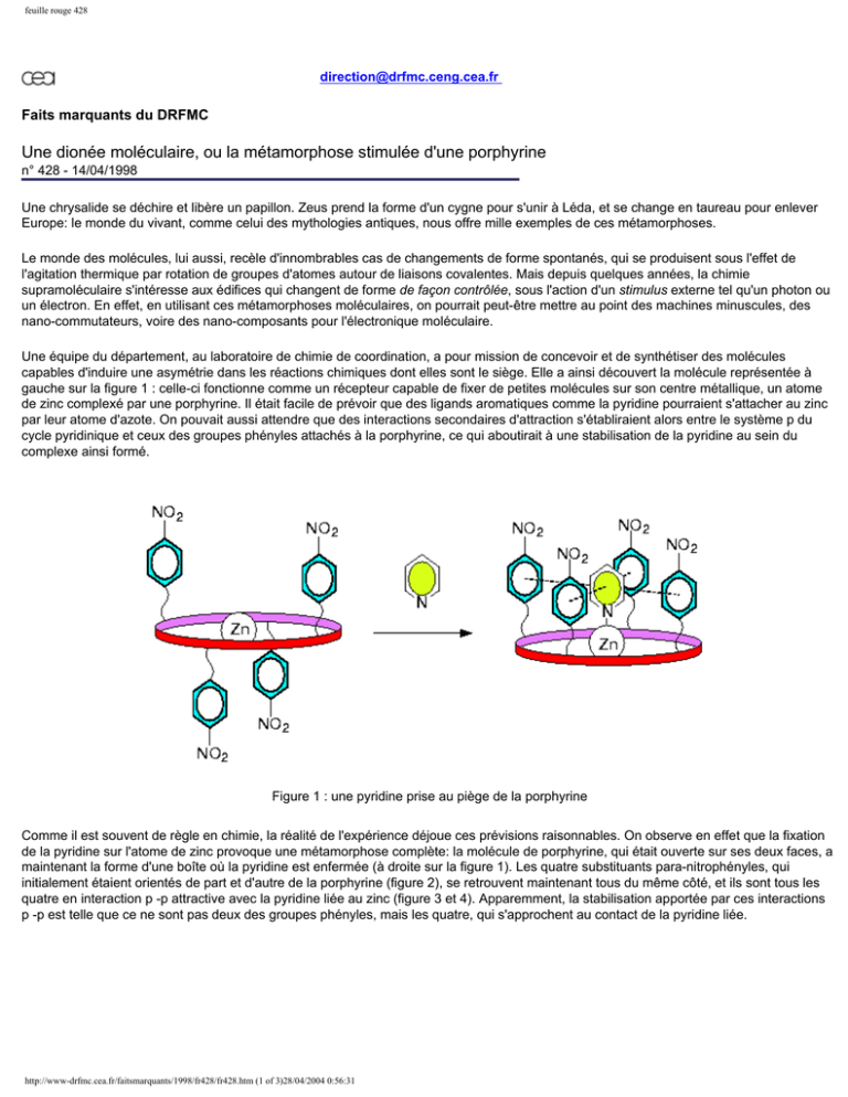 feuille rouge 428 [email protected] Faits marquants du DRFMC Une dionée moléculaire, ou la métamorphose stimulée d'une porphyrine n° 428 - 14/04/1998 Une chrysalide se déchire et libère un papillon. Zeus prend la forme d'un cygne pour s'unir à Léda, et se change en taureau pour enlever Europe: le monde du vivant, comme celui des mythologies antiques, nous offre mille exemples de ces métamorphoses. Le monde des molécules, lui aussi, recèle d'innombrables cas de changements de forme spontanés, qui se produisent sous l'effet de l'agitation thermique par rotation de groupes d'atomes autour de liaisons covalentes. Mais depuis quelques années, la chimie supramoléculaire s'intéresse aux édifices qui changent de forme de façon contrôlée, sous l'action d'un stimulus externe tel qu'un photon ou un électron. En effet, en utilisant ces métamorphoses moléculaires, on pourrait peut-être mettre au point des machines minuscules, des nano-commutateurs, voire des nano-composants pour l'électronique moléculaire. Une équipe du département, au laboratoire de chimie de coordination, a pour mission de concevoir et de synthétiser des molécules capables d'induire une asymétrie dans les réactions chimiques dont elles sont le siège. Elle a ainsi découvert la molécule représentée à gauche sur la figure 1 : celle-ci fonctionne comme un récepteur capable de fixer de petites molécules sur son centre métallique, un atome de zinc complexé par une porphyrine. Il était facile de prévoir que des ligands aromatiques comme la pyridine pourraient s'attacher au zinc par leur atome d'azote. On pouvait aussi attendre que des interactions secondaires d'attraction s'établiraient alors entre le système p du cycle pyridinique et ceux des groupes phényles attachés à la porphyrine, ce qui aboutirait à une stabilisation de la pyridine au sein du complexe ainsi formé. Figure 1 : une pyridine prise au piège de la porphyrine Comme il est souvent de règle en chimie, la réalité de l'expérience déjoue ces prévisions raisonnables. On observe en effet que la fixation de la pyridine sur l'atome de zinc provoque une métamorphose complète: la molécule de porphyrine, qui était ouverte sur ses deux faces, a maintenant la forme d'une boîte où la pyridine est enfermée (à droite sur la figure 1). Les quatre substituants para-nitrophényles, qui initialement étaient orientés de part et d'autre de la porphyrine (figure 2), se retrouvent maintenant tous du même côté, et ils sont tous les quatre en interaction p -p attractive avec la pyridine liée au zinc (figure 3 et 4). Apparemment, la stabilisation apportée par ces interactions p -p est telle que ce ne sont pas deux des groupes phényles, mais les quatre, qui s'approchent au contact de la pyridine liée. http://www-drfmc.cea.fr/faitsmarquants/1998/fr428/fr428.htm (1 of 3)28/04/2004 0:56:31 feuille rouge 428 Figure 2 : Structure cristallographique de la forme ouverte. Une molécule d'éthanol est liée au zinc sur la face supérieure. Des groupes nitrophényles appartenant à des molécules voisines (en orange) occupent la face inférieure On voit aussi que cette transformation n'a pu se produire que parce qu'un verrou a sauté. Car dans la forme de départ, la rotation des groupes phényles est impossible: à cause de leur volume important, ils restent bloqués sur leurs positions alternées. La fixation de la pyridine sur le zinc a donc déverrouillé cet édifice moléculaire, lui permettant d'atteindre une nouvelle forme de plus basse énergie. Figure 3 : Structure cristallographique de la forme fermée (vue de dessus). La pyridine (en violet) est enfermée entre les quatre cycles nitrophényles. Figure 4 : Structure cristallographique de la forme fermée (vue de côté). La pyridine (en violet) est enfermée entre les quatre cycles nitrophényles. Le cycle phényle situé en avant est représenté en "boules-bâtons" pour permettre de voir la pyridine à l'intérieur de la "boîte". Une image vient à l'esprit, celle de la dionée (Dionaea muscipula). En repliant les deux lobes ciliés de ses feuilles, cette plante insectivore emprisonne la mouche qui vient à les frôler. Notre "dionée moléculaire" évoque elle-même l'adaptation induite des systèmes enzymesubstrat. Selon cette théorie introduite par Daniel Koshland en 1958, la quasi-totalité des enzymes subiraient des changements de conformation induits par la fixation de leur substrat. La métamorphose de la porphyrine de zinc, déclenchée par la fixation de la pyridine, est un modèle simple de ce processus complexe, et peut nourrir la réflexion sur les mécanismes de la catalyse enzymatique. http://www-drfmc.cea.fr/faitsmarquants/1998/fr428/fr428.htm (2 of 3)28/04/2004 0:56:31 feuille rouge 428 Pour en savoir plus FLYTRAP.PDF Contact: J.C. Marchon, M. Mazzanti, SCIB (04 76 88 45 97) [email protected] Département de recherche fondamentale sur la matière condensée http://www-drfmc.cea.fr/faitsmarquants/1998/fr428/fr428.htm (3 of 3)28/04/2004 0:56:31 mise à jour : 10/12/99 © CEA 1997 - Tous droits réservés