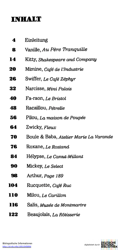 INHALT 4 Einleitung 8 Vanille, Au Pere Tranquille 14 Kitty, Shakespeare and Company 20 Mimine, Cafe de l'Industrie 26 Swiffer, Le Cafe Zephyr 32 Narcisse, Mini Palais 40 Fa-raon, Le Bristol 48 Racaillou, Petrelle 56 Pilou, La maison de Poupee 64 Zwicky, Fleux 70 Boule & Baba, Atelier Marie La Varancle 76 Roxane, Le Rostand 84 Helypse, Le Canut-MiUant 90 Mickey, Le Select 98 Arthur, Page 189 104 Rucquette, Cafe Ruc 110 Milou, Le Carillon 116 Salis, Musee de Montmartre 122 Beaujolais, La Rötisserie http://d-nb.info/1051045894