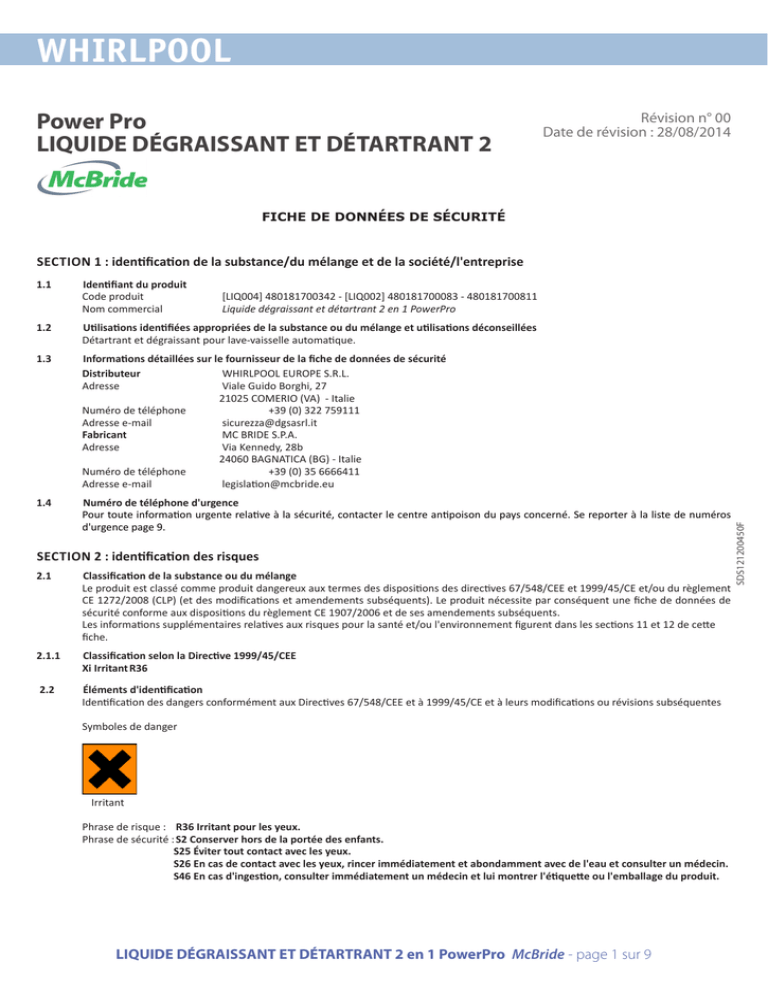 WHIRLPOOL Power Pro LIQUIDE DÉGRAISSANT ET DÉTARTRANT 2 EN 1 Révision n° 00 Date de révision : 28/08/2014 FICHE DE DONNÉES DE SÉCURITÉ SECTION 1 : identification de la substance/du mélange et de la société/l'entreprise 1.1 Identifiant du produit Code produit Nom commercial 1.2 Utilisations identifiées appropriées de la substance ou du mélange et utilisations déconseillées Détartrant et dégraissant pour lave-vaisselle automatique. 1.3 Informations détaillées sur le fournisseur de la fiche de données de sécurité Distributeur WHIRLPOOL EUROPE S.R.L. Adresse Viale Guido Borghi, 27 21025 COMERIO (VA) - Italie Numéro de téléphone +39 (0) 322 759111 Adresse e-mail [email protected] Fabricant MC BRIDE S.P.A. Adresse Via Kennedy, 28b 24060 BAGNATICA (BG) - Italie Numéro de téléphone +39 (0) 35 6666411 Adresse e-mail [email protected] 1.4 Numéro de téléphone d'urgence Pour toute information urgente relative à la sécurité, contacter le centre antipoison du pays concerné. Se reporter à la liste de numéros d'urgence page 9. SECTION 2 : identification des risques 2.1 Classification de la substance ou du mélange Le produit est classé comme produit dangereux aux termes des dispositions des directives 67/548/CEE et 1999/45/CE et/ou du règlement CE 1272/2008 (CLP) (et des modifications et amendements subséquents). Le produit nécessite par conséquent une fiche de données de sécurité conforme aux dispositions du règlement CE 1907/2006 et de ses amendements subséquents. Les informations supplémentaires relatives aux risques pour la santé et/ou l'environnement figurent dans les sections 11 et 12 de cette fiche. 2.1.1 Classification selon la Directive 1999/45/CEE Xi IrritantR36 2.2 Éléments d'identification Identification des dangers conformément aux Directives 67/548/CEE et à 1999/45/CE et à leurs modifications ou révisions subséquentes Symboles de danger Irritant Phrase de risque : R36 Irritant pour les yeux. Phrase de sécurité :S2 Conserver hors de la portée des enfants. S25 Éviter tout contact avec les yeux. S26 En cas de contact avec les yeux, rincer immédiatement et abondamment avec de l'eau et consulter un médecin. S46 En cas d'ingestion, consulter immédiatement un médecin et lui montrer l'étiquette ou l'emballage du produit. LIQUIDE DÉGRAISSANT ET DÉTARTRANT 2 en 1 PowerPro McBride - page 1 sur 9 SDS121200450F [LIQ004] 480181700342 - [LIQ002] 480181700083 - 480181700811 Liquide dégraissant et détartrant 2 en 1 PowerPro Contient du d-limonène : peut provoquer une réaction allergique. Informations requises par les règlements 648/2004 : - surfactants non ioniques < 5 % - 2-bromo-2-nitropropane-1,3-diol - parfum (limonène) 2.3 Autres risques Aucun SECTION 3 : composition/information sur les ingrédients 3.1 Substances Non applicable 3.2 Mélanges Ingrédients dangereux : N° CAS N° CE N° d'index N° d'enregistrement REACH % [poids] Nom Classification conformément à 67/548/CEE Classification selon le règlement (CE) n° 1278/2008 (CLP) 77-92-9 201-069-1 -- -- 10 > C < 25 acide citrique Xi ; R36 Irritation oculaire 2 ; H319 1300-72-7 215-090-9 -- -- 2,5 > C < 10 xylènesulphonate de sodium Xi ; R36 Irritation oculaire 2 ; H319 52-51-7 200-143-0 -- -- < 0,1 bronopol Xn ; R21/22 Xi ; 37/38 R41 N ; R50 Toxicité aiguë 4 ; H302 Toxicité aiguë 4 ; H312 Irritation cutanée 2 ; H315 Lésion oculaire 1 ; H318 TSOC exposition unique 3 ; H335 Danger aquatique aigu 1 H400 5989-27-5 227-813-5 601-029-00-7 -- < 0,1 d-Limonène R10 Xi ; R38 R43 N ; R50/53 Liquide inflammable 3 ; H226 Irritation cutanée 2 ; H315 Sensibilisation de la peau. 1 ; H317 Danger aquatique aigu 1 ; H400 Danger aquatique chronique 1 ; H410 Informations supplémentaires : pour le texte complet des phrases H et des phrases R, se reporter à la SECTION 16. SECTION 4 : premiers soins 4.1 Description des premiers soins Remarques générales En cas de doute ou si les symptômes persistent, toujours contacter un médecin. NE RIEN FAIRE ingérer à une personne inconsciente. En cas d'inhalation Consulter immédiatement un médecin/obtenir immédiatement un avis médical. En cas de contact cutané En cas d'apparition de rougeurs, consulter un médecin. En cas de contact oculaire Laver immédiatement pendant 15 minutes à l'eau douce et propre en maintenant les paupières ouvertes. En cas d'ingestion En cas d'ingestion d'une faible quantité de produit (une bouchée au maximum), se rincer la bouche à l'eau et consulter un médecin. Consulter un médecin en lui montrant l'étiquette du produit. Consulter immédiatement un médecin en lui montrant l'étiquette du produit. Autoprotection du secouriste Voir la section 8 4.2 Principaux symptômes et effets, aigus et différés Un contact fréquent ou prolongé peut être à l'origine d'une délipidation et d'un dessèchement de la peau, susceptibles de provoquer une gêne et une dermatite. Peut provoquer une irritation gastro-intestinale, des nausées, des vomissements et de la diarrhée 4.3 Indications relatives à l'intervention immédiate d'un médecin et au traitement requis Contacter un CENTRE ANTIPOISON ou un médecin en cas de malaise. SECTION 5 : protection anti-incendie 5.1 Agents d'extinction Agents d'extinction appropriés Poudre chimique, mousse anti-alcool, dioxyde de carbone (CO2), eau pulvérisée, sable, terre Moyens d'extinction inappropriés Ne pas utiliser de jet d'eau direct, au risque de propager l'incendie. LIQUIDE DÉGRAISSANT ET DÉTARTRANT 2 en 1 PowerPro McBride - page 2 sur 9 5.2 Dangers particuliers dérivant de la substance ou du mélange Une combustion provoque souvent une épaisse fumée noire. Une exposition aux produits issus de la décomposition peut s'avérer dangereuse pour la santé. Ne pas inhaler la fumée. En cas d'incendie, les composés chimiques suivants peuvent être générés : oxydes de carbone (CO et CO2) Pour en savoir plus sur la toxicité du produit ainsi que sur la stabilité et 