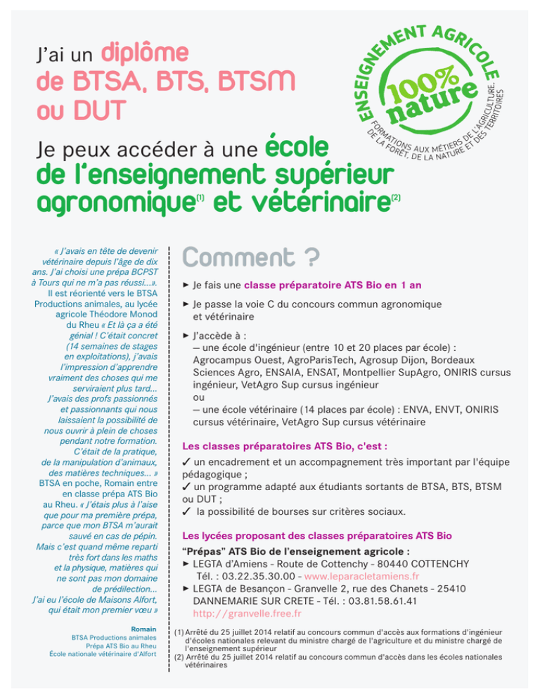 J’ai un diplôme de BTSA, BTS, BTSM ou DUT Je peux accéder à une école de l’enseignement supérieur agronomique et vétérinaire (1) « J’avais en tête de devenir vétérinaire depuis l’âge de dix ans. J’ai choisi une prépa BCPST à Tours qui ne m’a pas réussi...». Il est réorienté vers le BTSA Productions animales, au lycée agricole Théodore Monod du Rheu « Et là ça a été génial ! C’était concret (14 semaines de stages en exploitations), j’avais l’impression d’apprendre vraiment des choses qui me serviraient plus tard... J’avais des profs passionnés et passionnants qui nous laissaient la possibilité de nous ouvrir à plein de choses pendant notre formation. C’était de la pratique, de la manipulation d’animaux, des matières techniques... » BTSA en poche, Romain entre en classe prépa ATS Bio au Rheu. « J’étais plus à l’aise que pour ma première prépa, parce que mon BTSA m’aurait sauvé en cas de pépin. Mais c’est quand même reparti très fort dans les maths et la physique, matières qui ne sont pas mon domaine de prédilection... J’ai eu l’école de Maisons Alfort, qui était mon premier vœu » Romain BTSA Productions animales Prépa ATS Bio au Rheu école nationale vétérinaire d'Alfort (2) Comment ? 3 Je fais une classe préparatoire ATS Bio en 1 an 3 Je passe la voie C du concours commun agronomique et vétérinaire 3 J’accède à : — une école d'ingénieur (entre 10 et 20 places par école) : Agrocampus Ouest, AgroParisTech, Agrosup Dijon, Bordeaux Sciences Agro, ENSAIA, ENSAT, Montpellier SupAgro, ONIRIS cursus ingénieur, VetAgro Sup cursus ingénieur ou — une école vétérinaire (14 places par école) : ENVA, ENVT, ONIRIS cursus vétérinaire, VetAgro Sup cursus vétérinaire Les classes préparatoires ATS Bio, c'est : 3 un encadrement et un accompagnement très important par l'équipe pédagogique ; 3 un programme adapté aux étudiants sortants de BTSA, BTS, BTSM ou DUT ; 3 la possibilité de bourses sur critères sociaux. Les lycées proposant des classes préparatoires ATS Bio “Prépas” ATS Bio de l’enseignement agricole : 3 LEGTA d’Amiens - Route de Cottenchy - 80440 COTTENCHY Tél. : 03.22.35.30.00 - www.leparacletamiens.fr 3 LEGTA de Besançon - Granvelle 2, rue des Chanets - 25410 DANNEMARIE SUR CRETE - Tél. : 03.81.58.61.41 http://granvelle.free.fr (1) Arrêté du 25 juillet 2014 relatif au concours commun d'accès aux formations d'ingénieur d'écoles nationales relevant du ministre chargé de l'agriculture et du ministre chargé de l'enseignement supérieur (2) Arrêté du 25 juillet 2014 relatif au concours commun d'accès dans les écoles nationales vétérinaires « La prépa a la particularité de donner sa chance à quiconque est motivé. Durant cette année, j'ai pu acquérir une méthode et une capacité de travail performantes, de la persévérance face aux difficultés, et le niveau scientifique me donnant le plus de chances de réussite en école d'ingénieurs. De plus, l'esprit qui règne dans la classe prépa de Blanquefort n'est pas celui de la compétition mais plutôt celui de l'entraide et de la coopération. Ma motivation a porté ses fruits, à l'issue du concours, j'ai été admis à Montpellier SupAgro. » Dorian BTSA productions animalesp prépa ATS Bio de BordeauxBlanquefort p Montpellier SupAgro « C’est en Terminale que j’ai vraiment décidé de passer par le concours C pour devenir vétérinaire. » Après un IUT Génie Biologique, option Analyses Biologiques et Biochimiques, à Montpellier qui lui a permis « de mûrir, de comprendre la réalité du terrain avec un stage et… d’obtenir un diplôme », elle a intégré la classe prépa ATS Bio à Toulouse Auzeville. « L’ambiance de ma classe était agréable, on avait des parcours différents : c’était très intéressant. Pour les cours, je dirais que le rythme est … soutenu ! Venir en prépa est un engagement personnel à ne pas prendre à la légère. Il faut être là avec un objectif précis et tout faire pour y arriver [...] mais on ne retient au final que les bons moments (si, si! dur à croire quand on y est mais ensuite le cerveau fait une sorte de tri naturel) » Delphine IUT Génie biologique p prépa ATS Bio à Toulouse Auzeville p école nationale vétérinaire de Toulouse 3 LEGTA de Bordeaux Blanquefort - 84, Av. du Général de Gaulle - BP 113 33294 BLANQUEFORT Cedex - Tél. : 05.56.35.56.35 http://formagri33.com 3 LEGTA de Clermont-Ferrand Marmilhat "Louis Pasteur" - BP 116 63370 LEMPDES - Tél. : 04.73.83.72.50 www.marmilhat.educagri.fr 3 LEGTA de Dijon-Quétigny 21, Bd Olivier de Serres - BP 42 21801 DIJON QUETIGNY - Tél. : 03.80.71.80.00 www.eplea-quetigny.educagri.fr 3 LEGTA de l'Hérault "Site Agropolis" - 3224 Route de Mende 34093 MONTPELLIER Cedex - Tél. : 04.67.63.89.89 http://epl.agropolis.fr/lycee_agropolis 3 LEGTA de Rennes Le Rheu 55, av. de la Bouvardière BP 55124 - 35650 LE RHEU - Tél. : 02.99.29.73.45 www.theodore-monod.educagri.fr/ 3 LEGTA de Rodez La Roque route d'Espalion - B.P 3355 12033 RODEZ Cedex 09 - Tél. : 05.65.77.75.00 www.legta.laroque.educagri.fr 3 LEGTA de Toulouse Auzeville route de Narbonne B.P 72647 - 31326 CASTANET TOLOSAN Cedex Tél. : 05.61.00.30.70 - www.citesciencesvertes.fr 3 LEGTA de Valence "Le Valentin" - 26500 BOURG LES VALENCE Tél. : 04 75 83 33 55 - www.valentin.educagri.fr “Prépas” ATS Bio de l'éducation nationale : 3 Lycée Galilée avenue Chandon - 92230 GENNEVILLIERS Tél. : 01.47.33.30.20 - www.lyc-galilee-gennevilliers.ac-versailles.fr 3 Lycée Pierre-Gilles de Gennes (ENCPB) - 11, rue Pirandello 75013 PARIS - Tél. : 01.44.08.06.51 www.lycee-pierre-gilles-de-gennes-encpb.org Dossier de candidature à retirer auprès de l'établissement demandé en 1er vœu dès le 1er avril. La Commission nationale d'admission étudie les dossiers en prenant en compte notamment les notes et les appréciations scolaires. « Mon année 